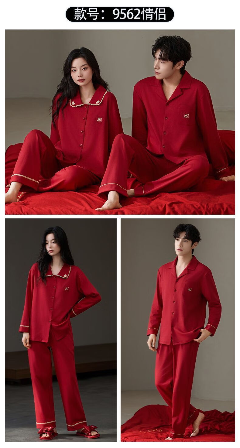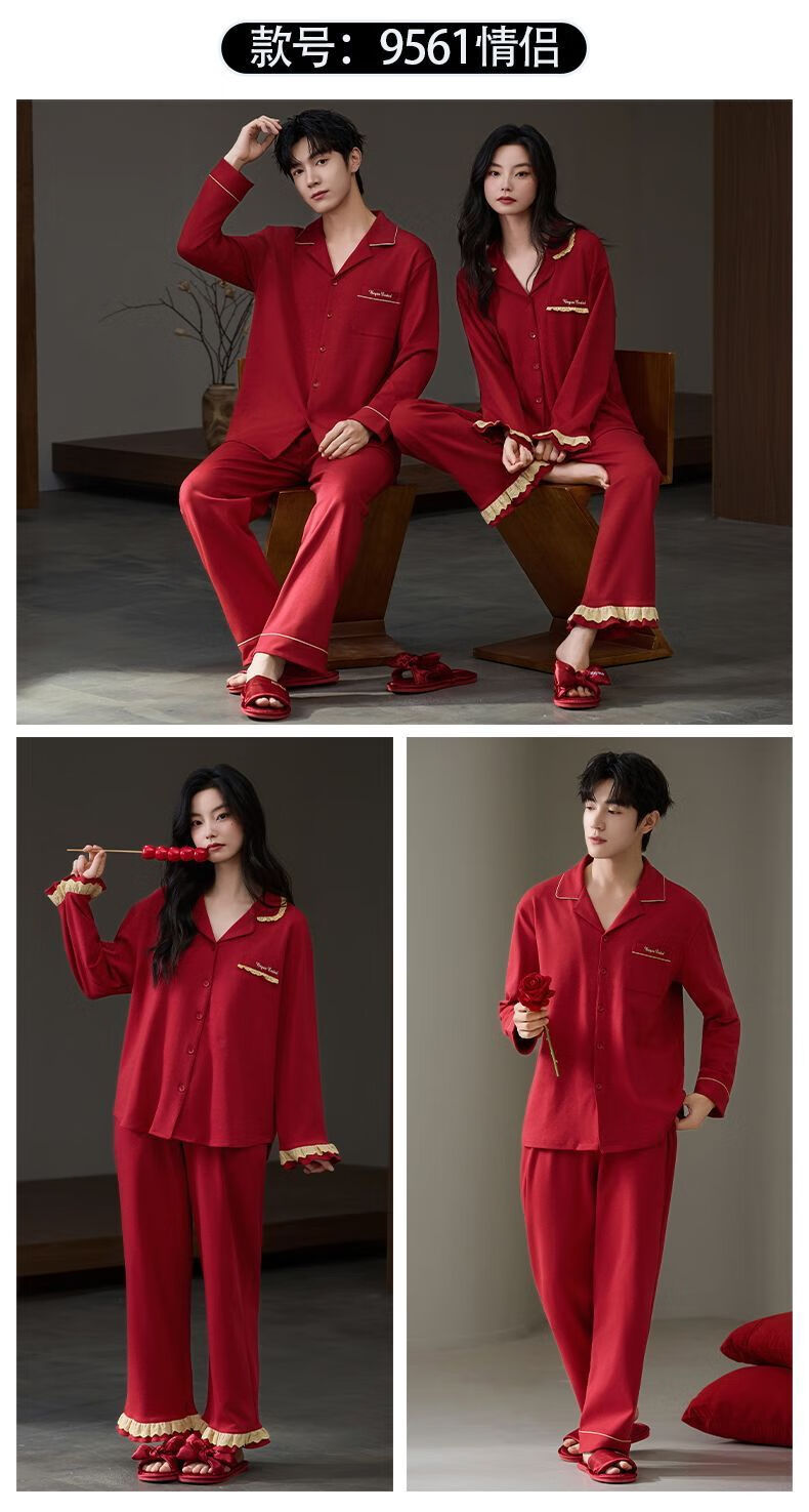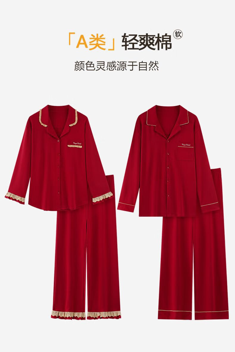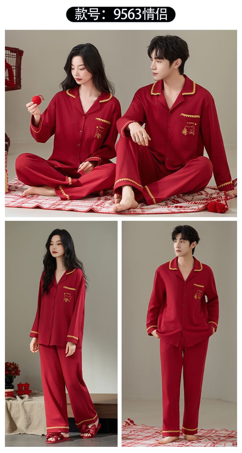 Modal Red Pajamas Spring and Autumn Wedding Newlyweds Couple Set Pure Cotton Home Clothes Animal Year Cardigan Set High Quality Couple 9557 M Women's