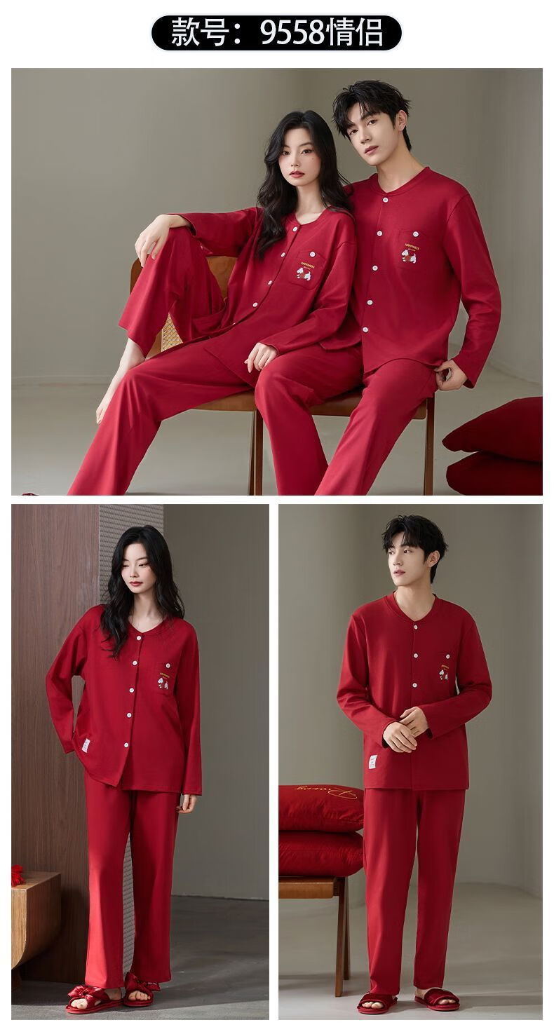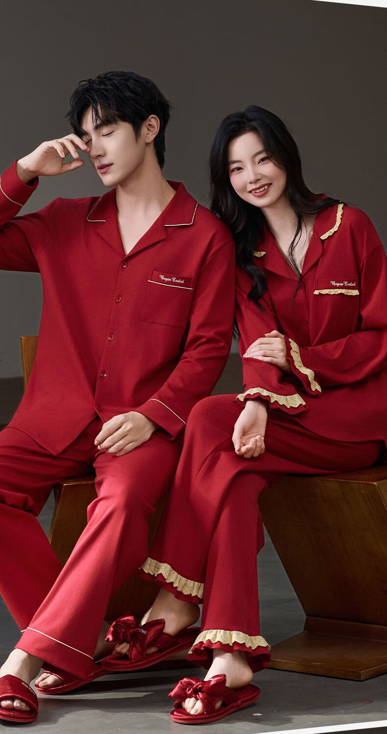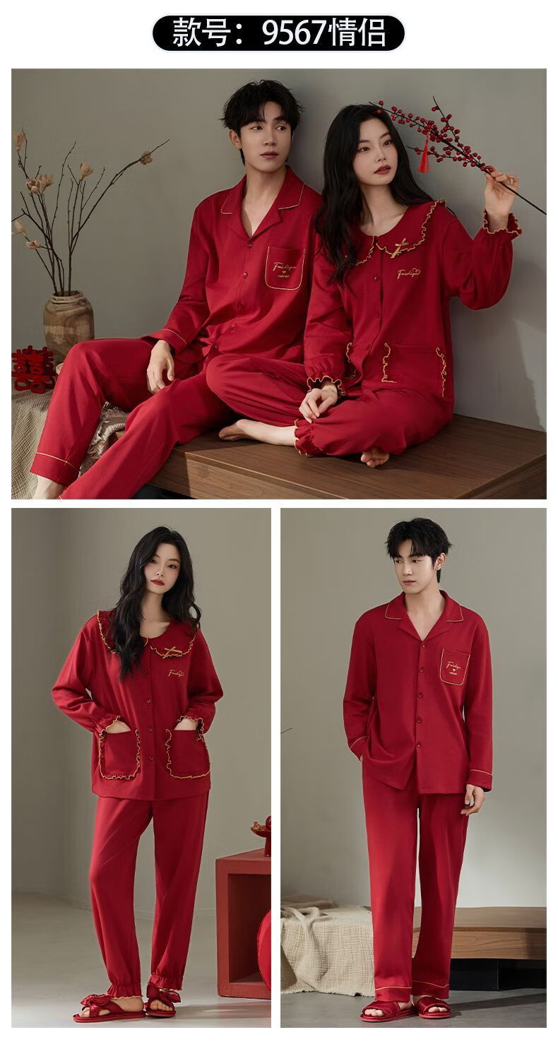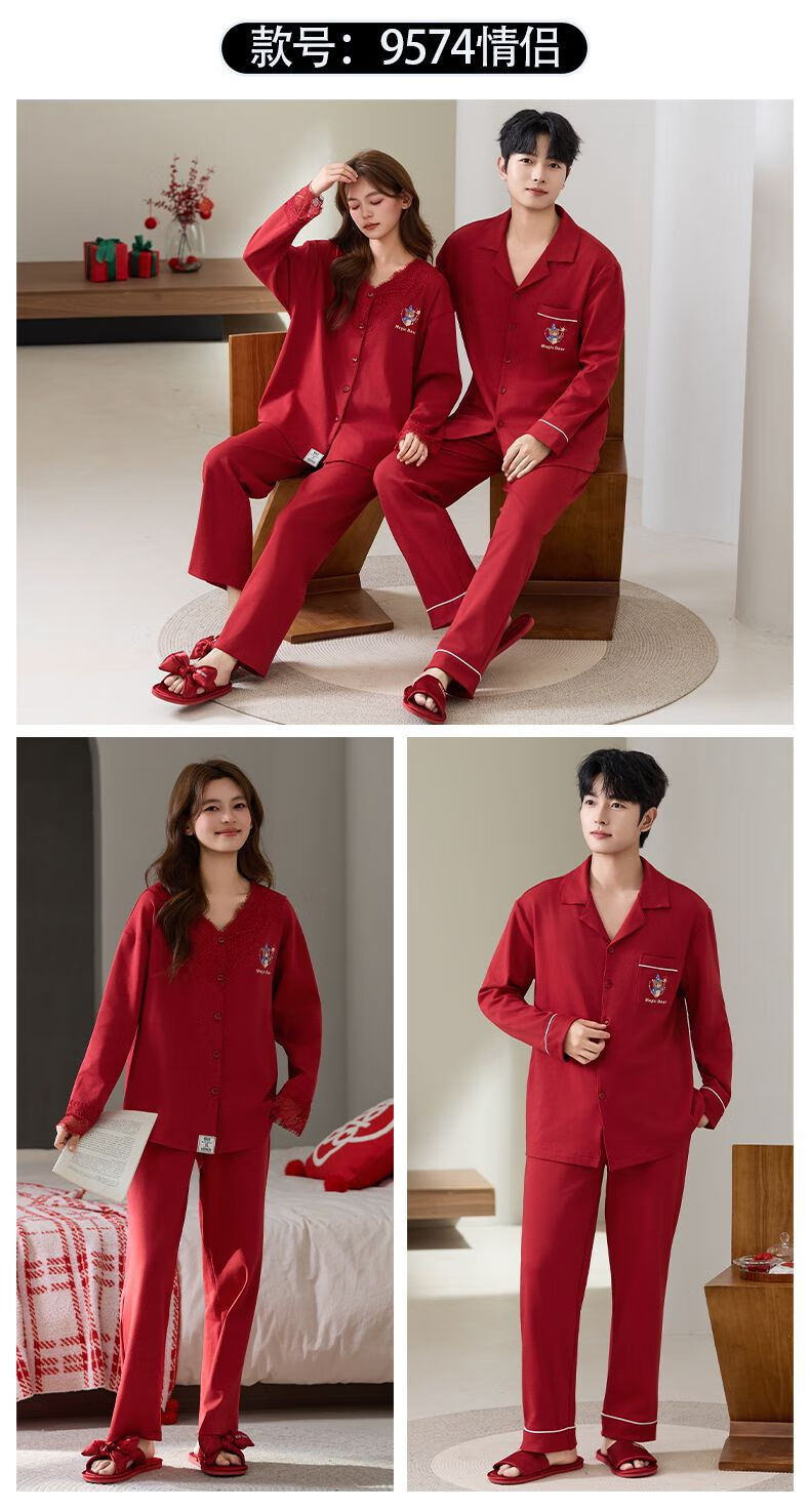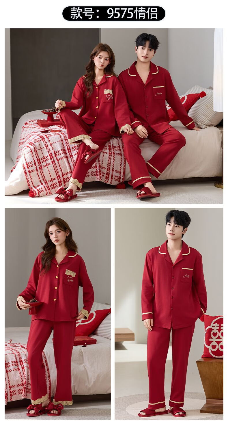 Modal Red Pajamas Spring and Autumn Wedding Newlyweds Couple Set Pure Cotton Home Clothes Animal Year Cardigan Set High Quality Couple 9557 M Women's