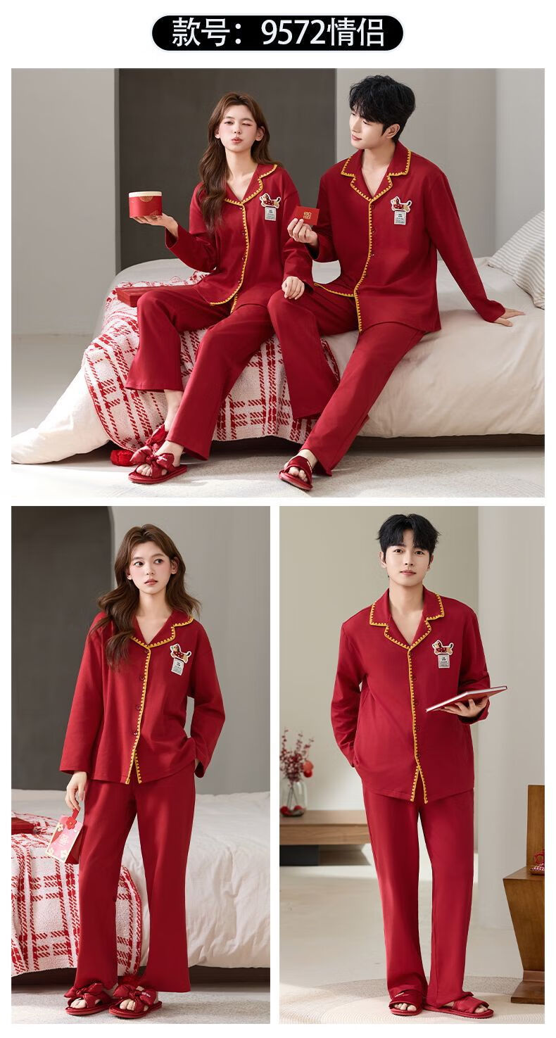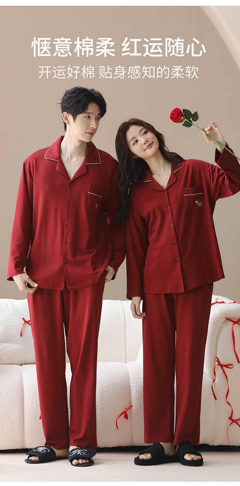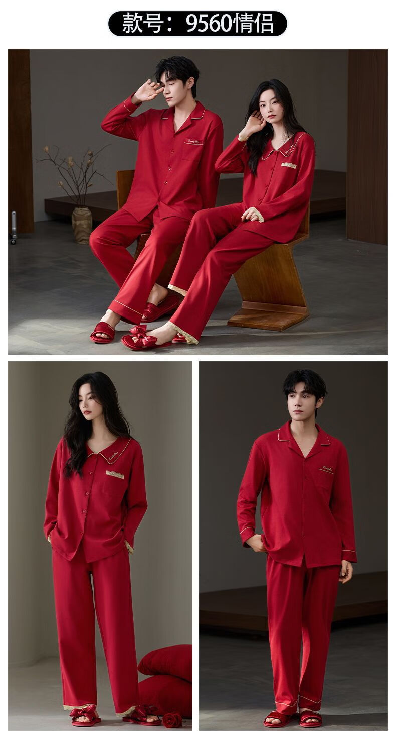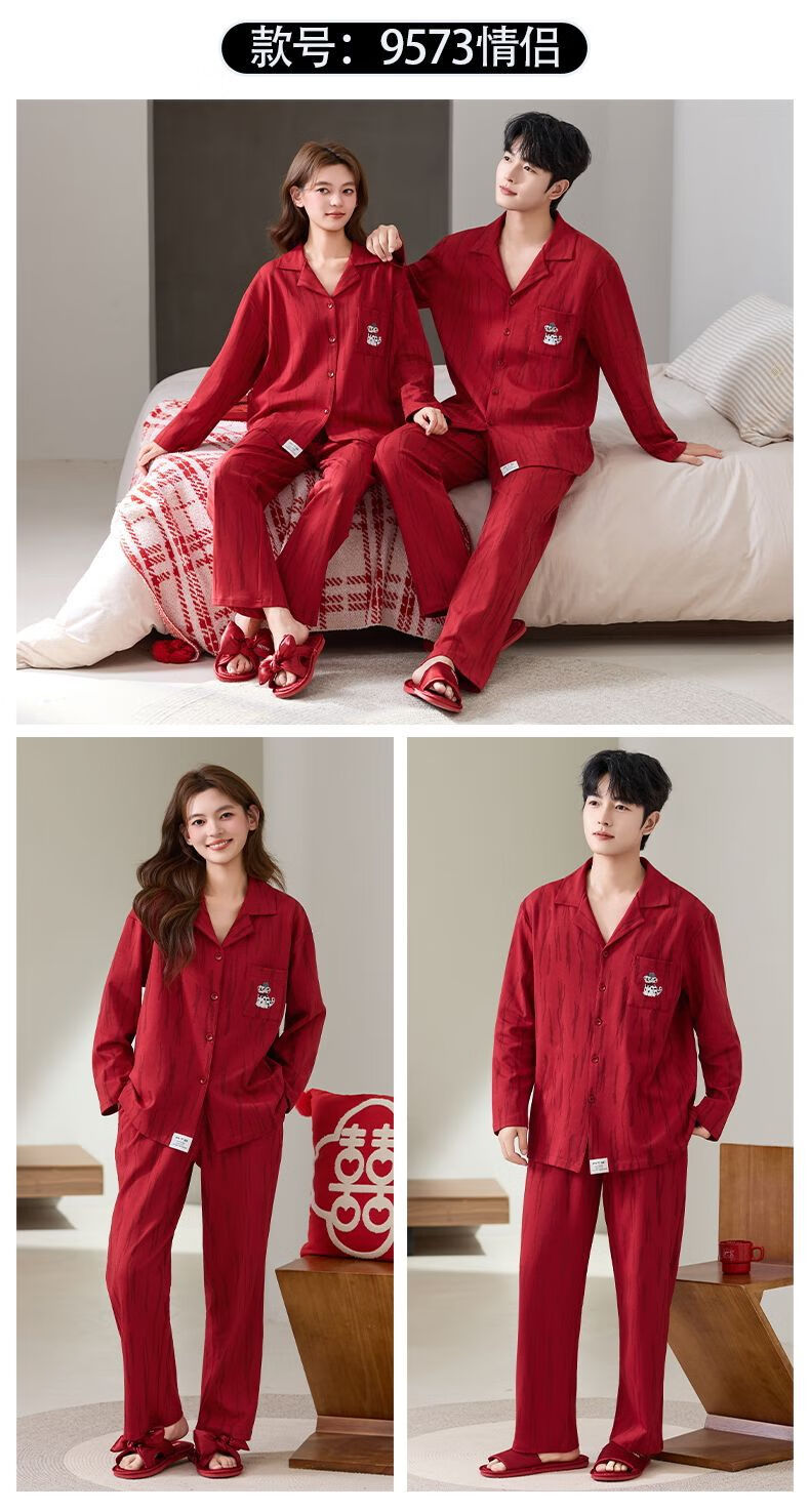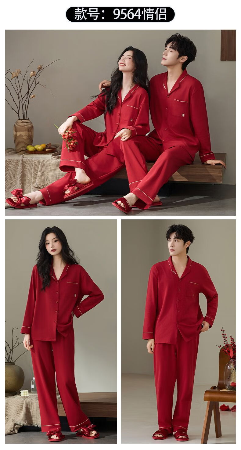 Modal Red Pajamas Spring and Autumn Wedding Newlyweds Couple Set Pure Cotton Home Clothes Animal Year Cardigan Set High Quality Couple 9557 M Women's