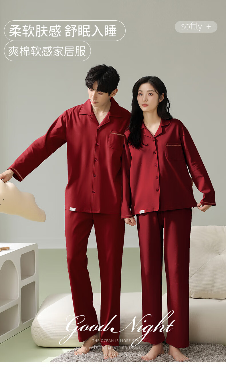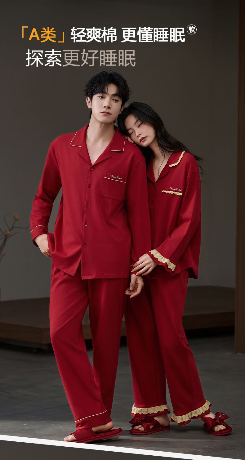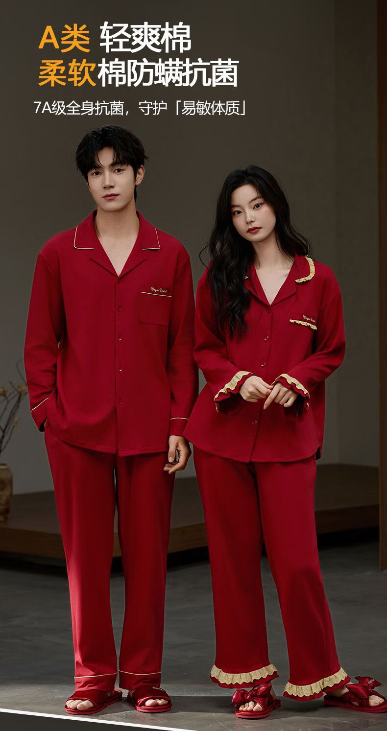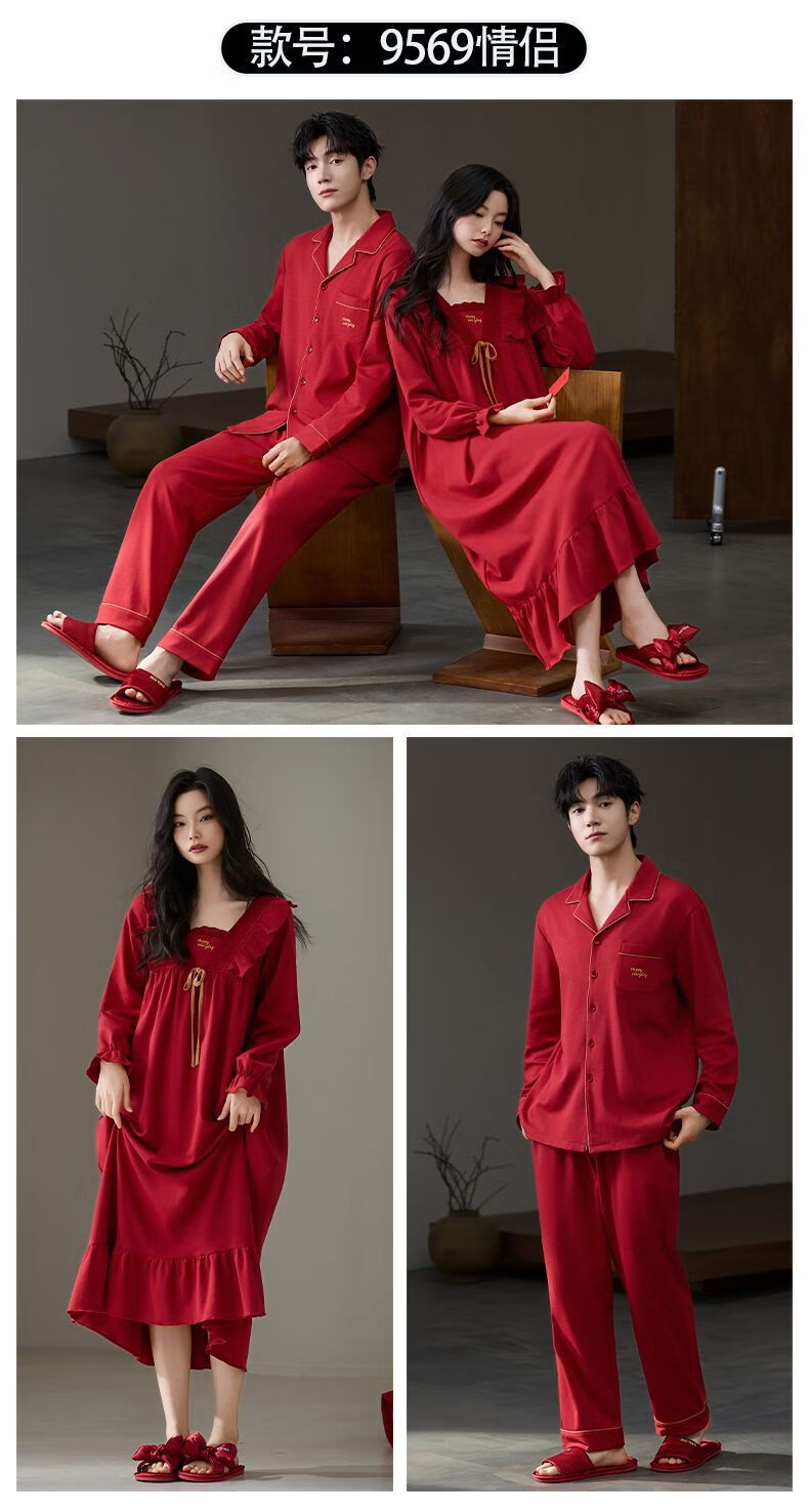Modal Red Pajamas Spring and Autumn Wedding Newlyweds Couple Set Pure Cotton Home Clothes Animal Year Cardigan Set High Quality Couple 9557 M Women's