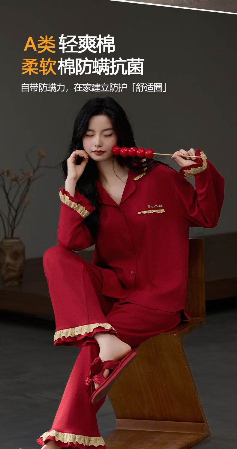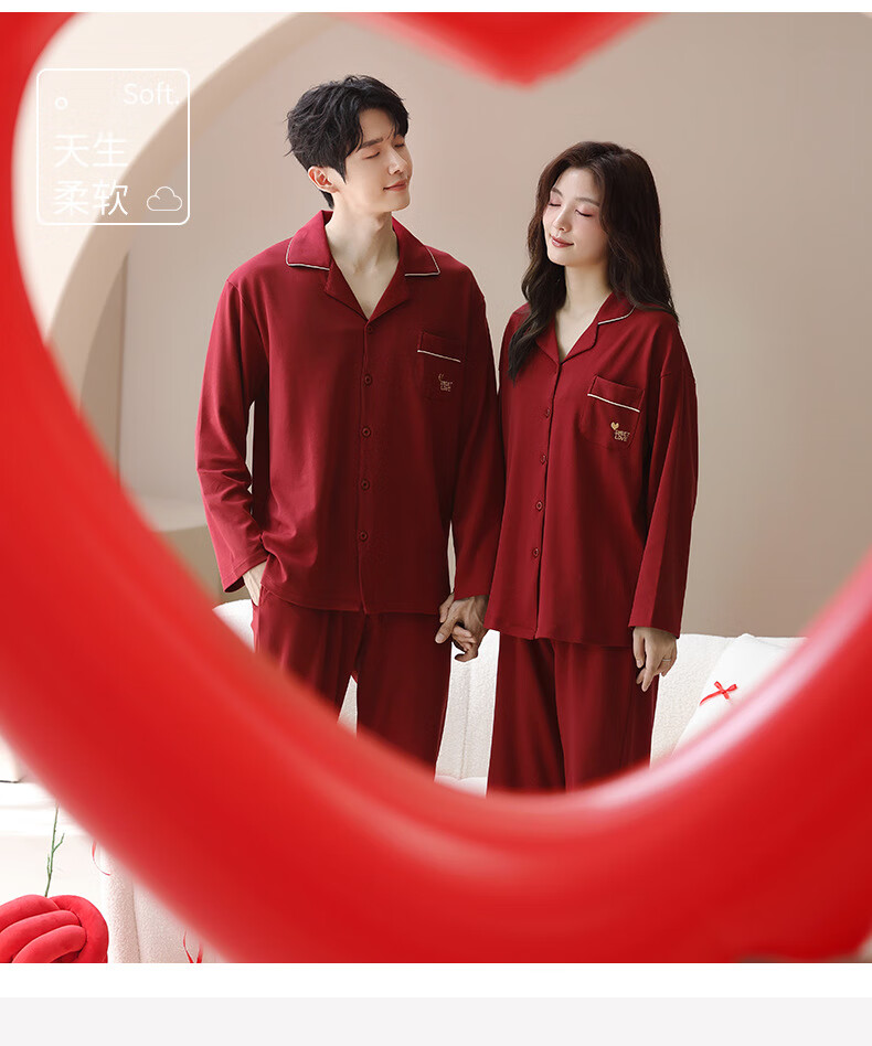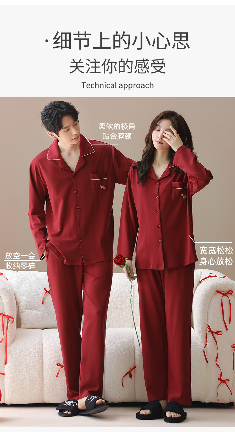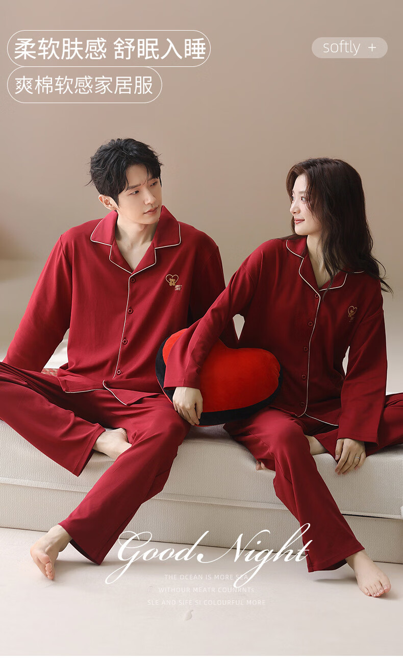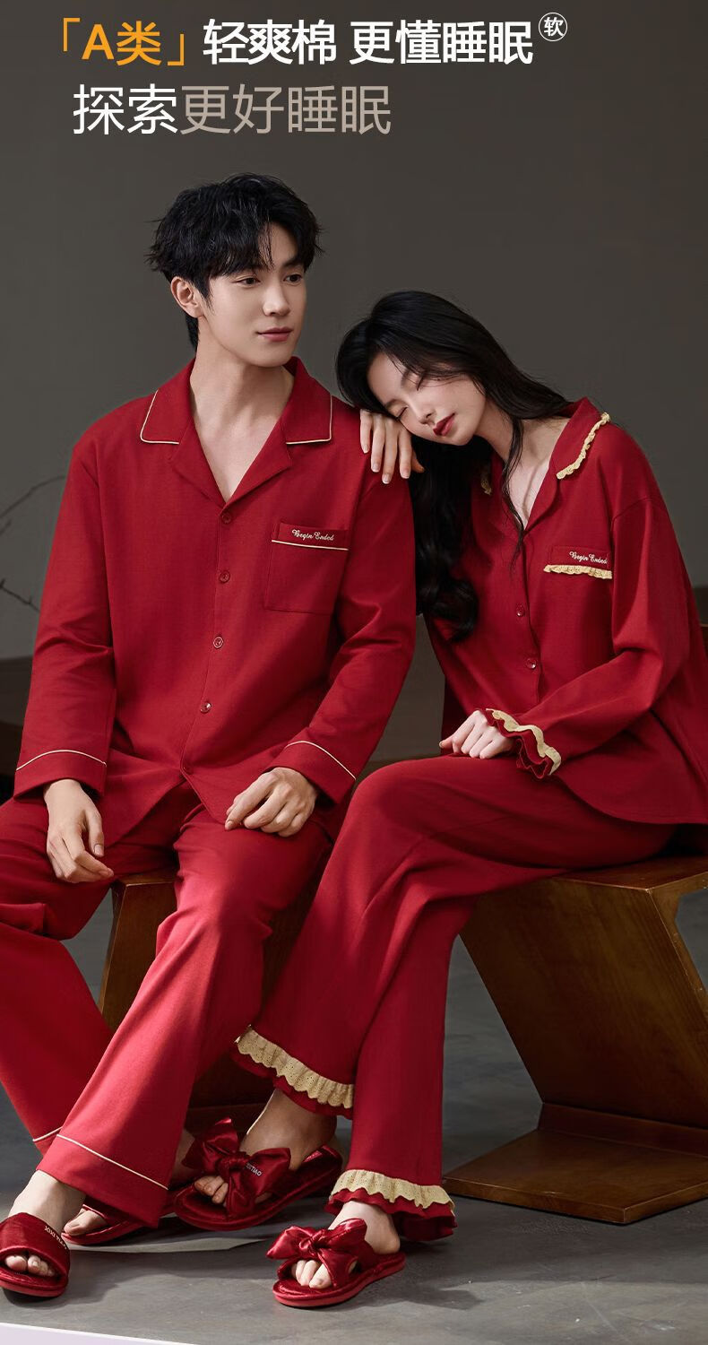 Modal Red Pajamas Spring and Autumn Wedding Newlyweds Couple Set Pure Cotton Home Clothes Animal Year Cardigan Set High Quality Couple 9557 M Women's