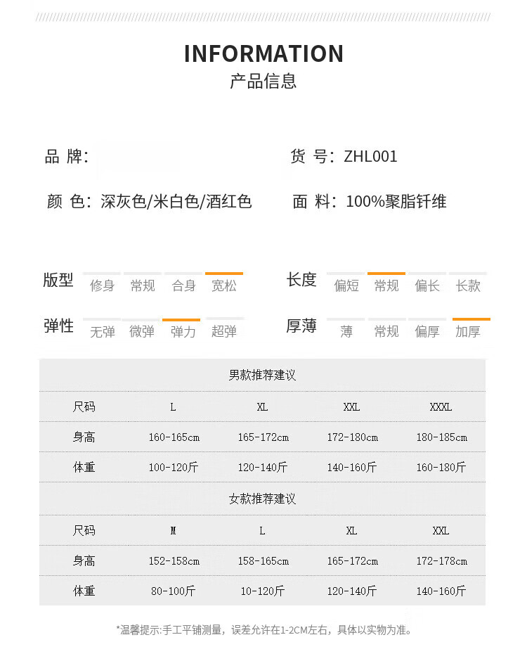 China (cm) 165 / 88-90 170 / 96-98 175 / 108-110 180 / 118-122 185 / 126-130