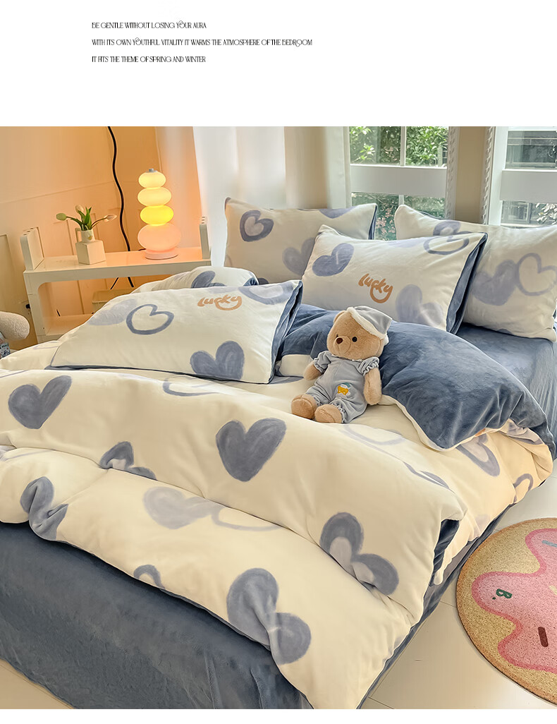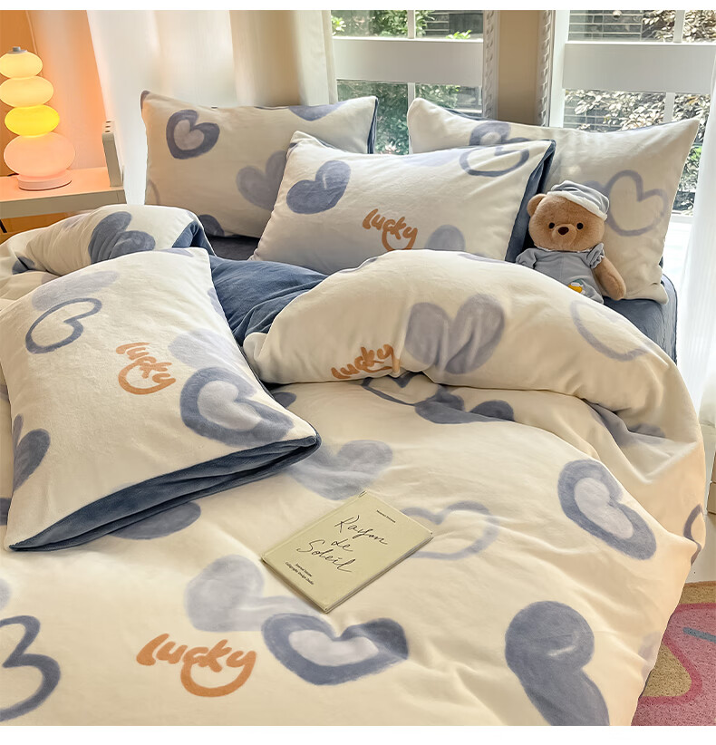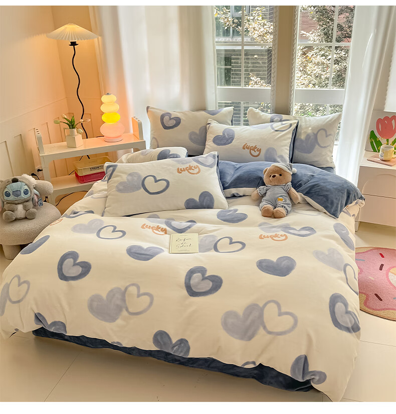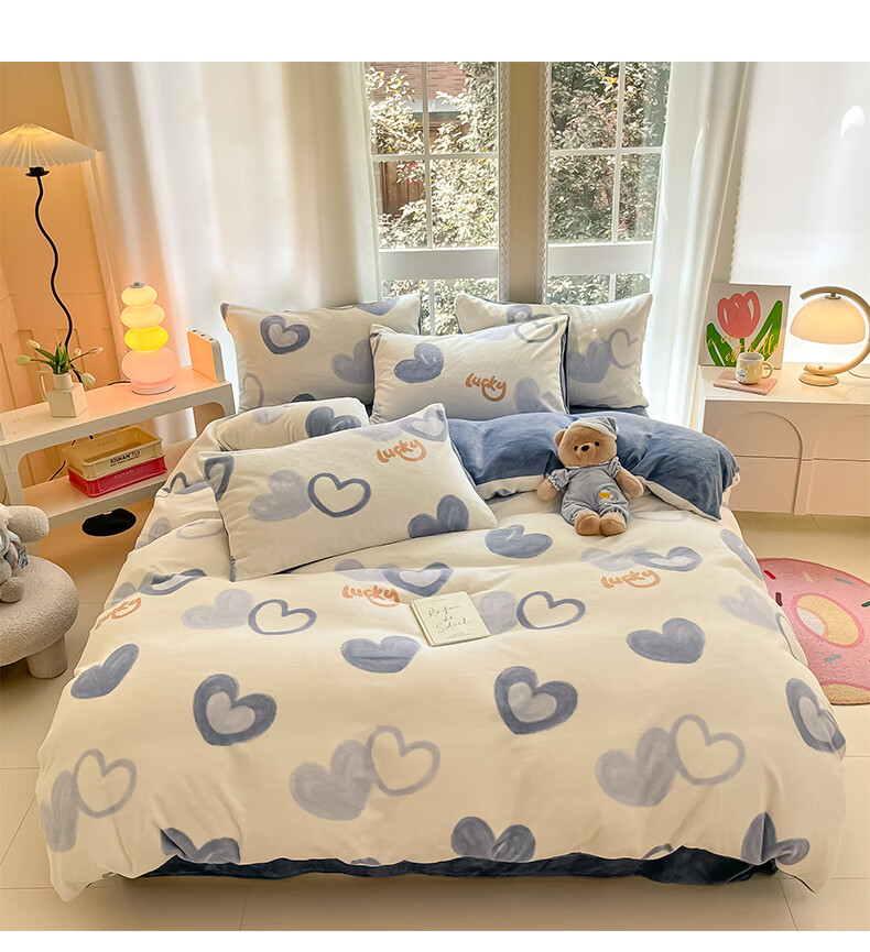 Hongdou Home Textiles Winter Thickened Warm Milk Velvet Bed Four-piece Set Double-sided Velvet Bed Sheets and Quilt Covers Flannel Coral Velvet Bed Sheet Covers Colorful Flower + Baby Blue Velvet Warmth Skin Friendly Anti-static Suitable for 1.2m Bed Sheets - Quilt Cover 150*200cm