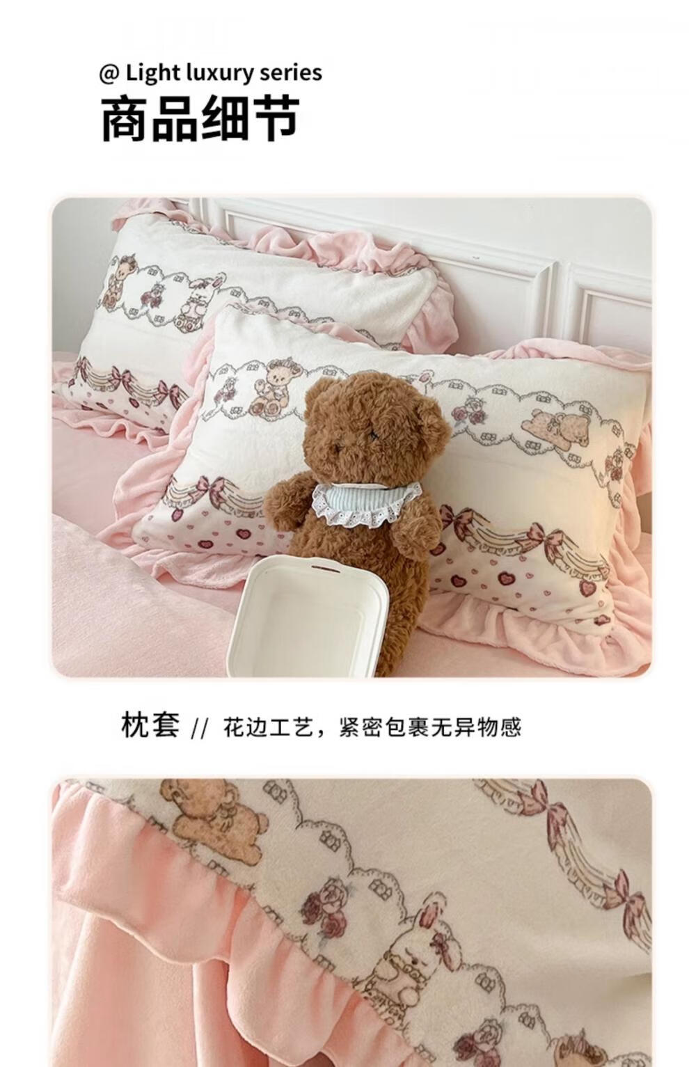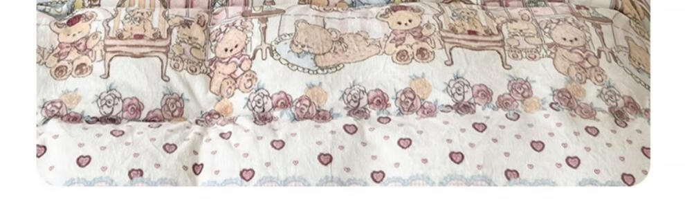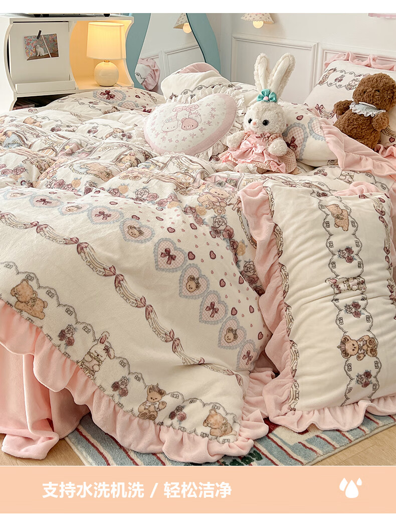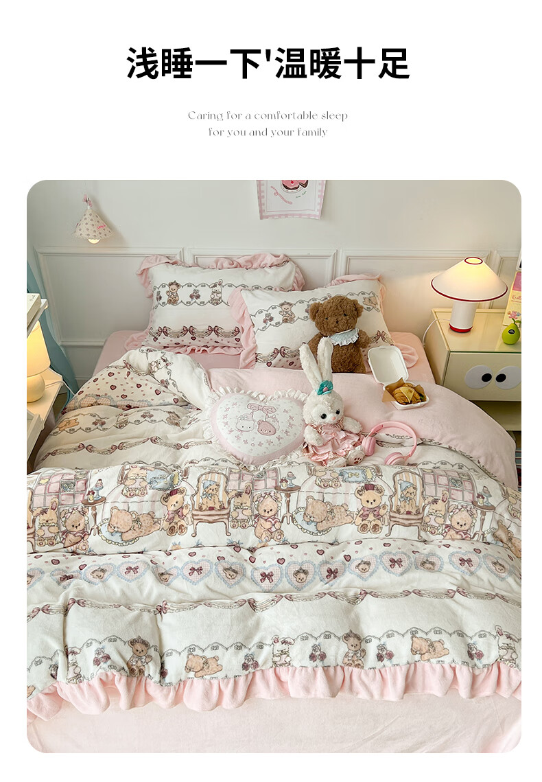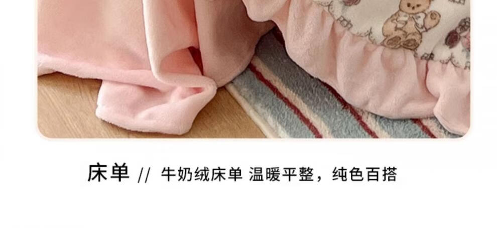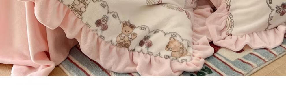 Cheng Baobao winter thickened Lolita milk velvet bed four-piece set plus velvet coral velvet quilt cover three-piece bed sheet princess style Sweetheart Coco Bear bed sheet style student three-piece set suitable for 150x200cm quilt