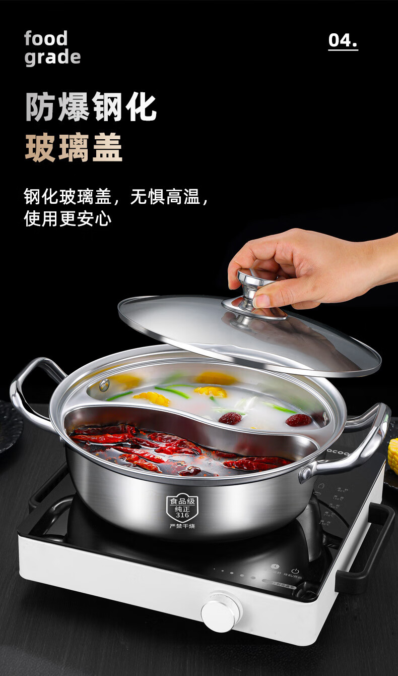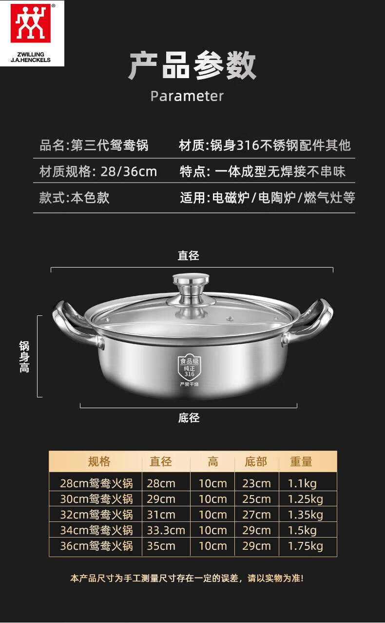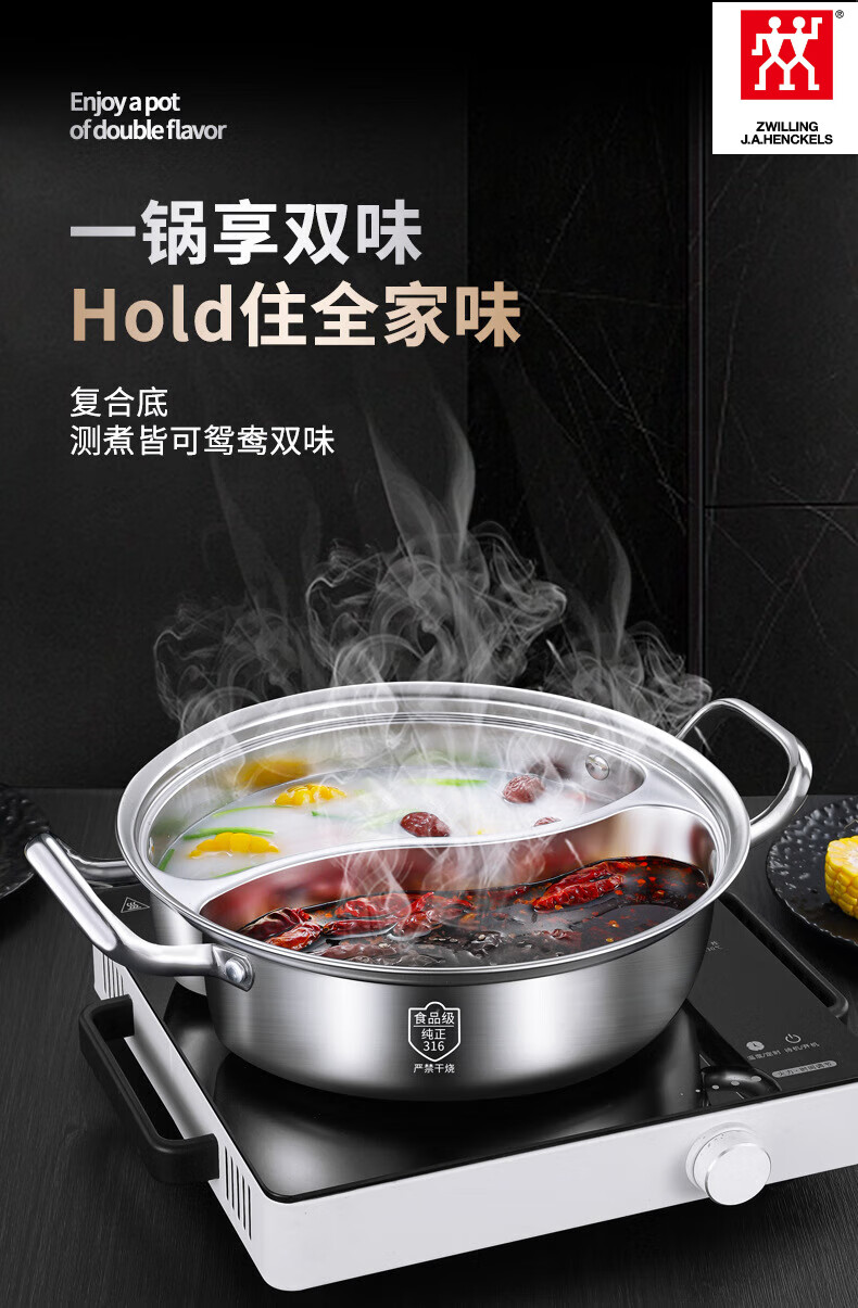 ZWILLING 316 stainless steel Yuanyang large-capacity soup pot special pot induction cooker hot pot household thickened thickened Yuanyang pot steel SUS316L 28cm