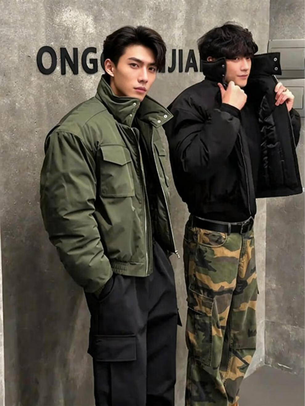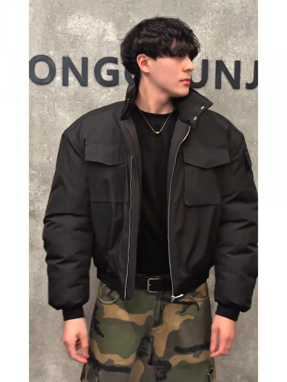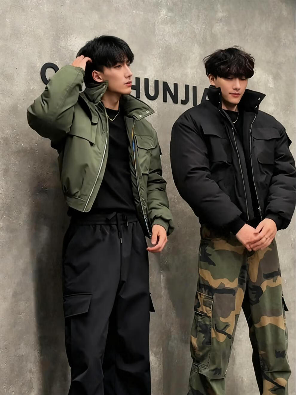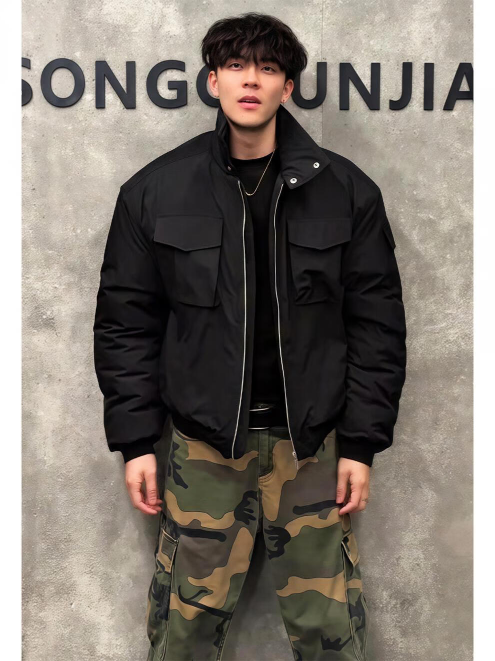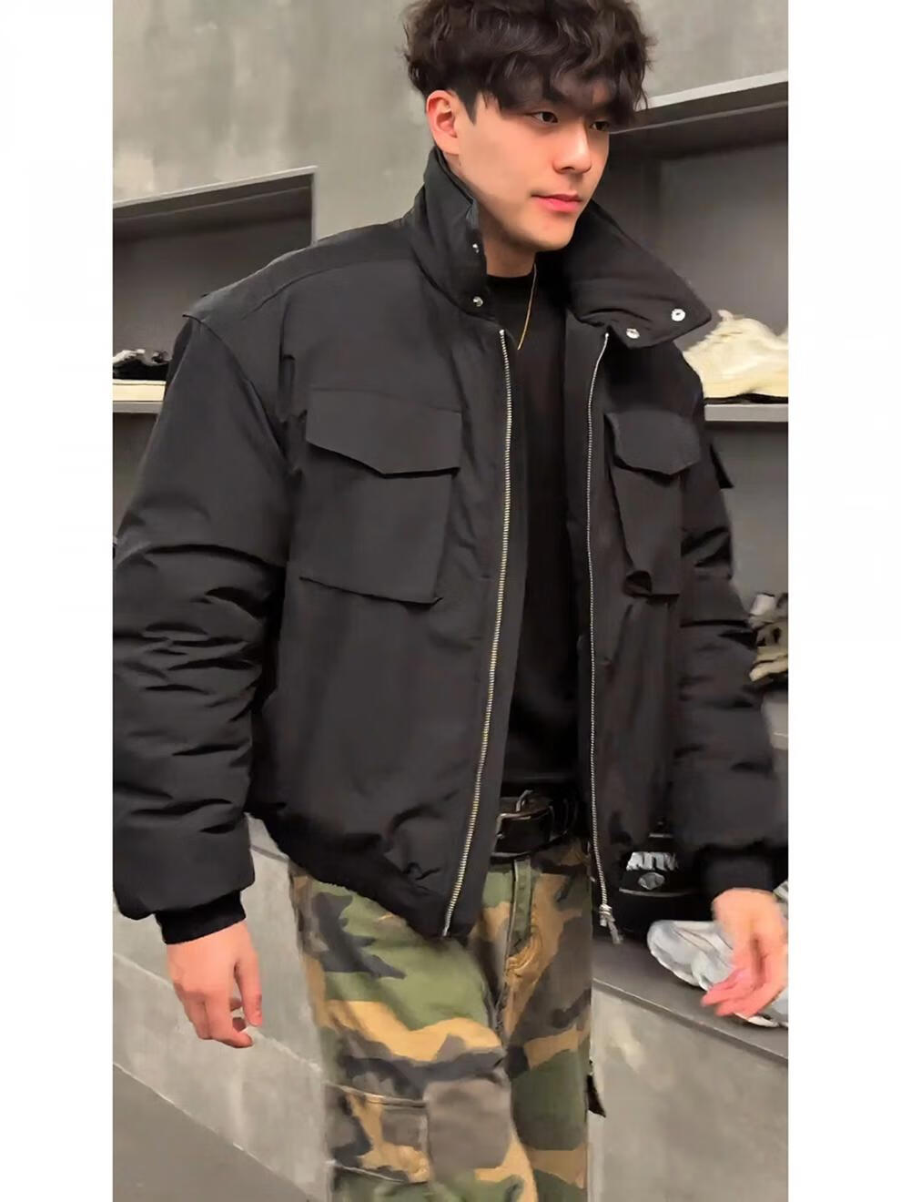 XUANSENTU American short high-collar light cavalry cotton coat men's autumn and winter tough guy wear work clothes stand-up collar jacket cotton coat A233-S378 black cotton coat upgraded version 2XL
