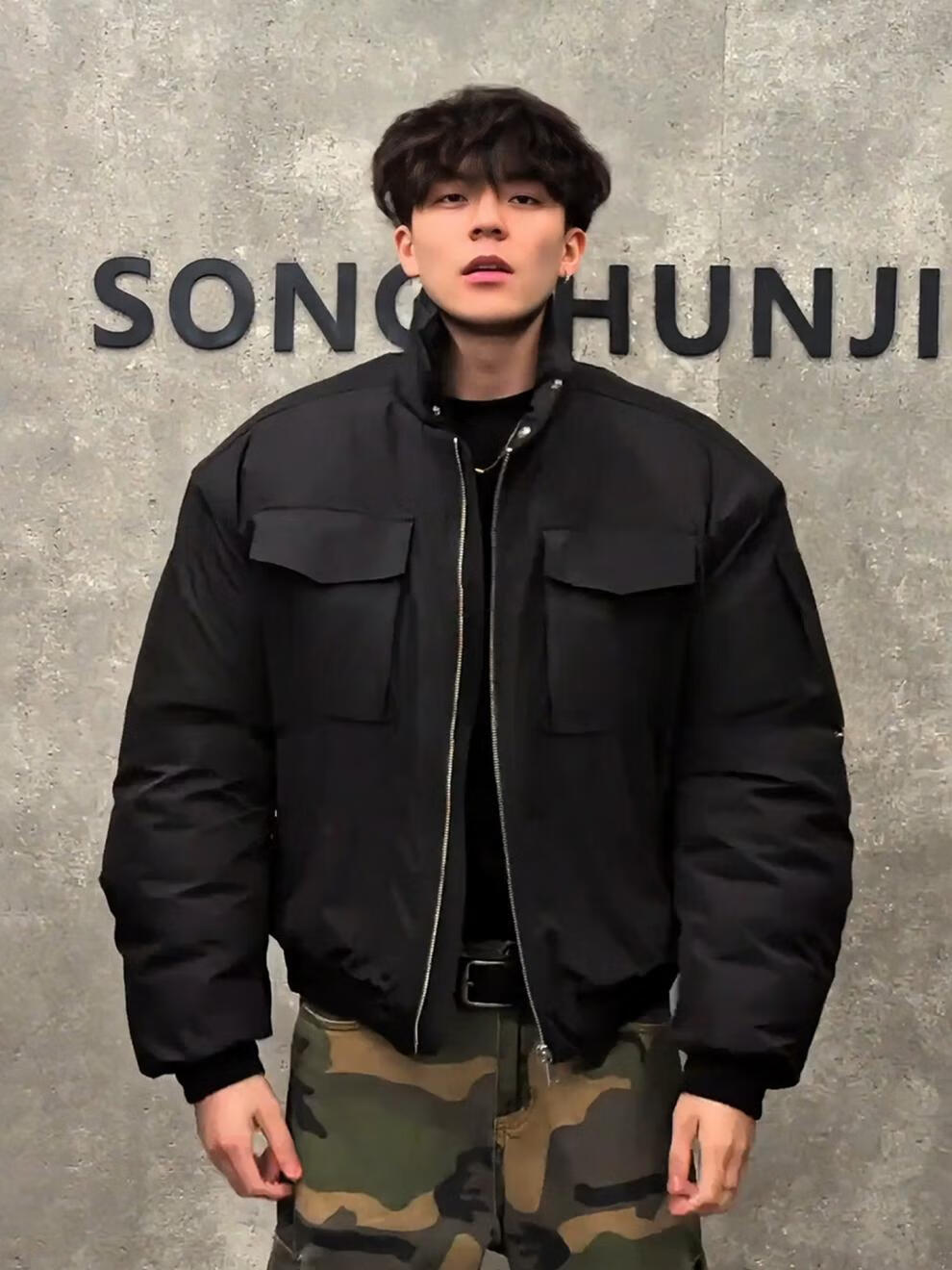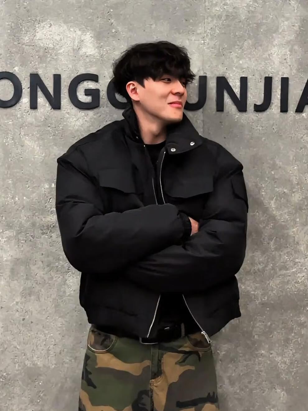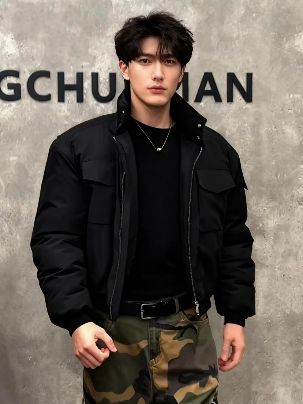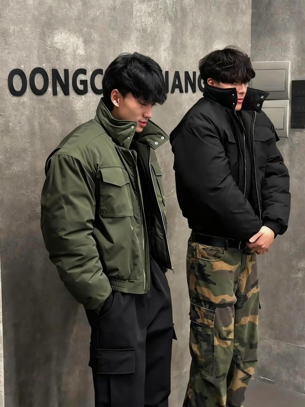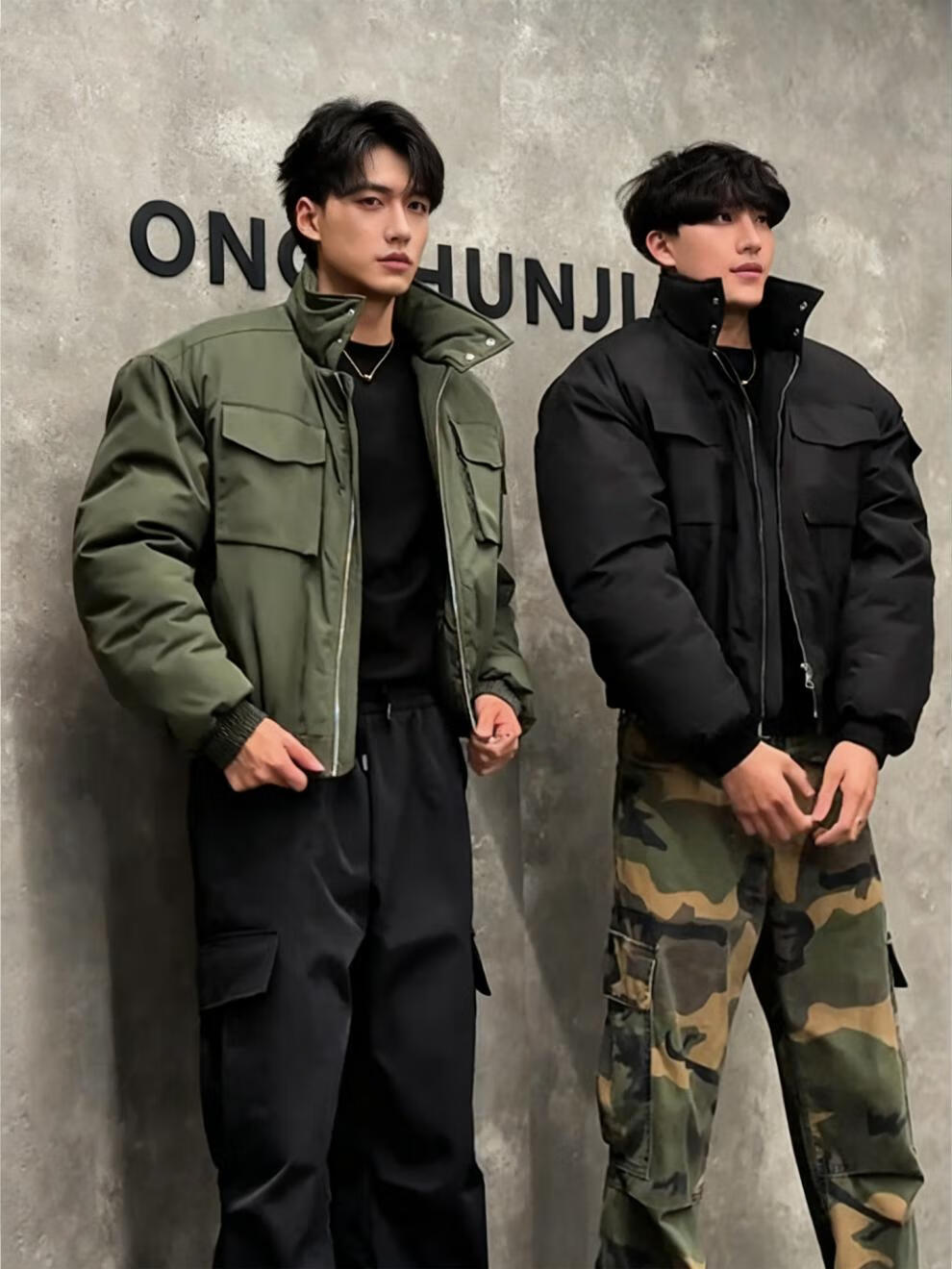 XUANSENTU American short high-collar light cavalry cotton coat men's autumn and winter tough guy wear work clothes stand-up collar jacket cotton coat A233-S378 black cotton coat upgraded version 2XL