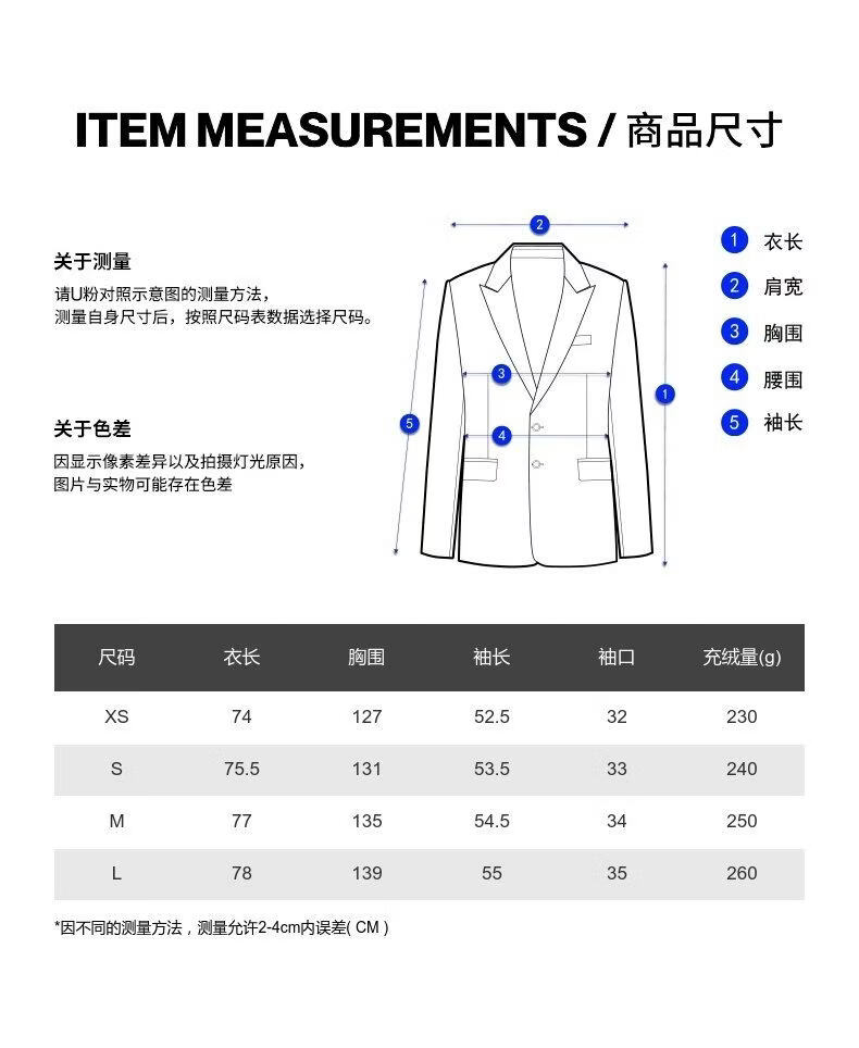 China (cm) 165 / 88-90 170 / 96-98 175 / 108-110 180 / 118-122 185 / 126-130