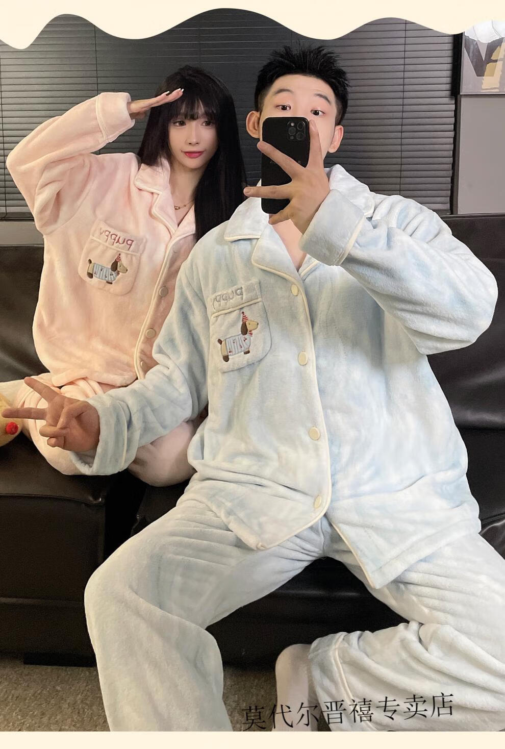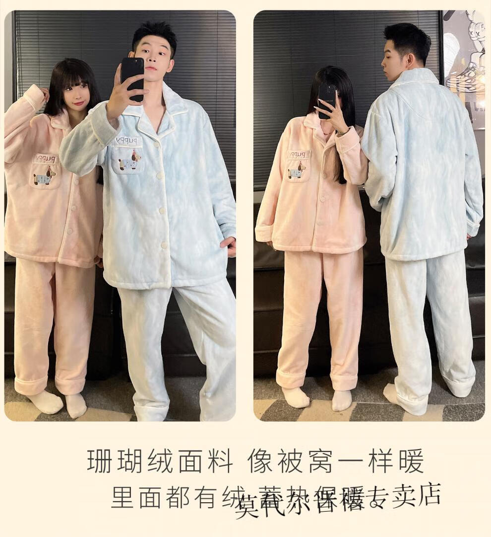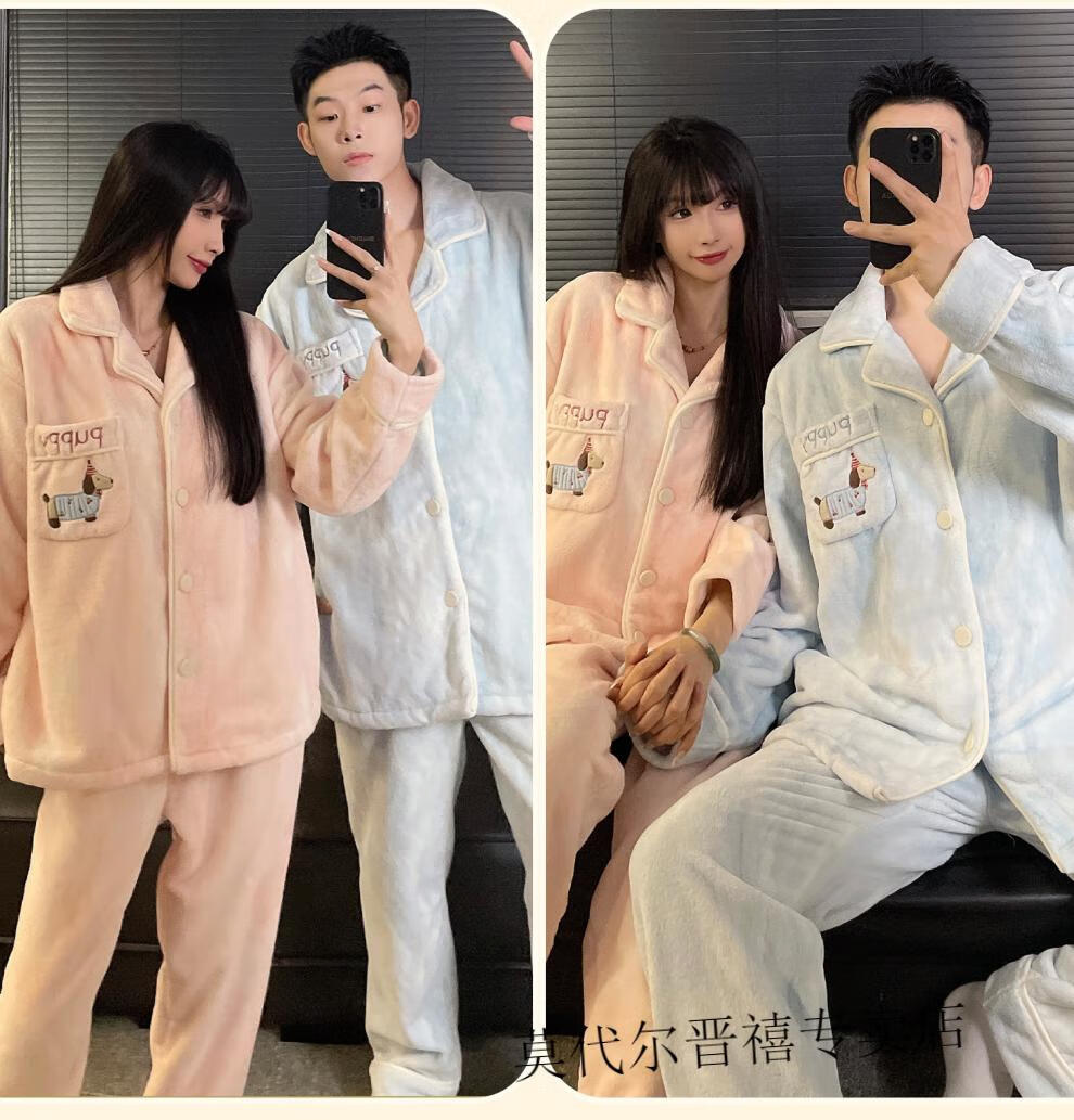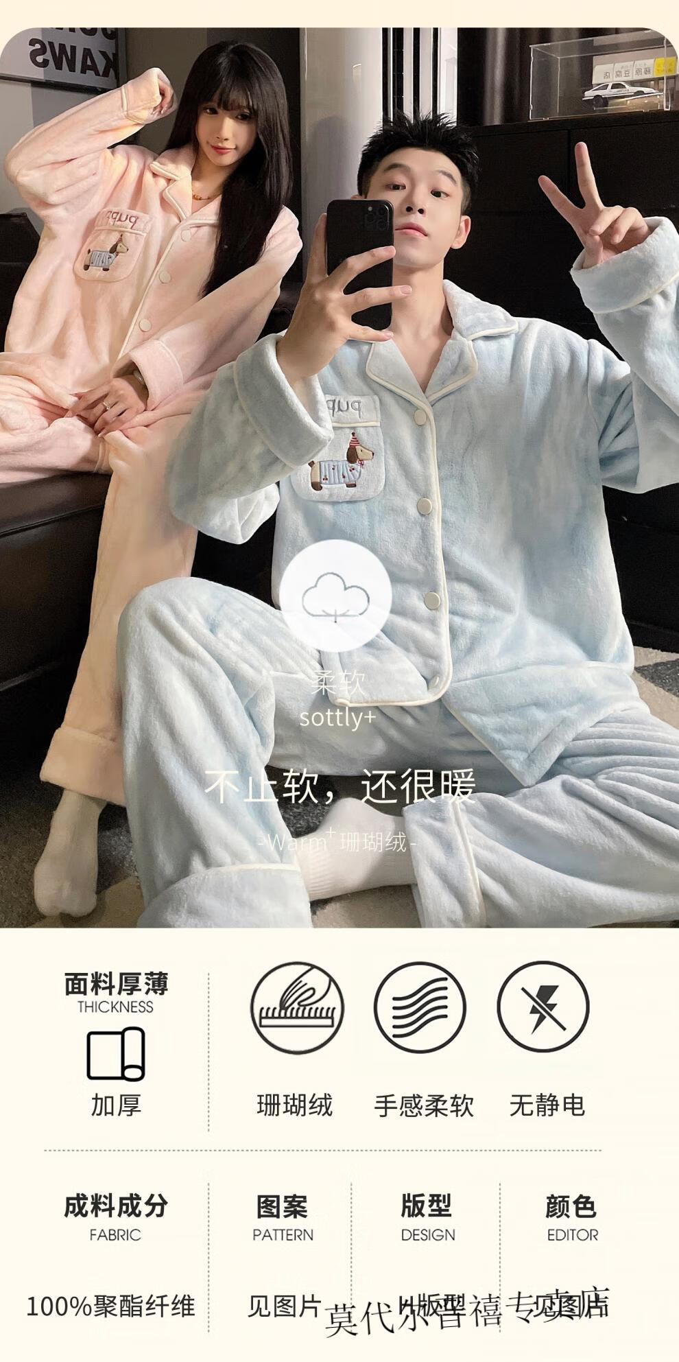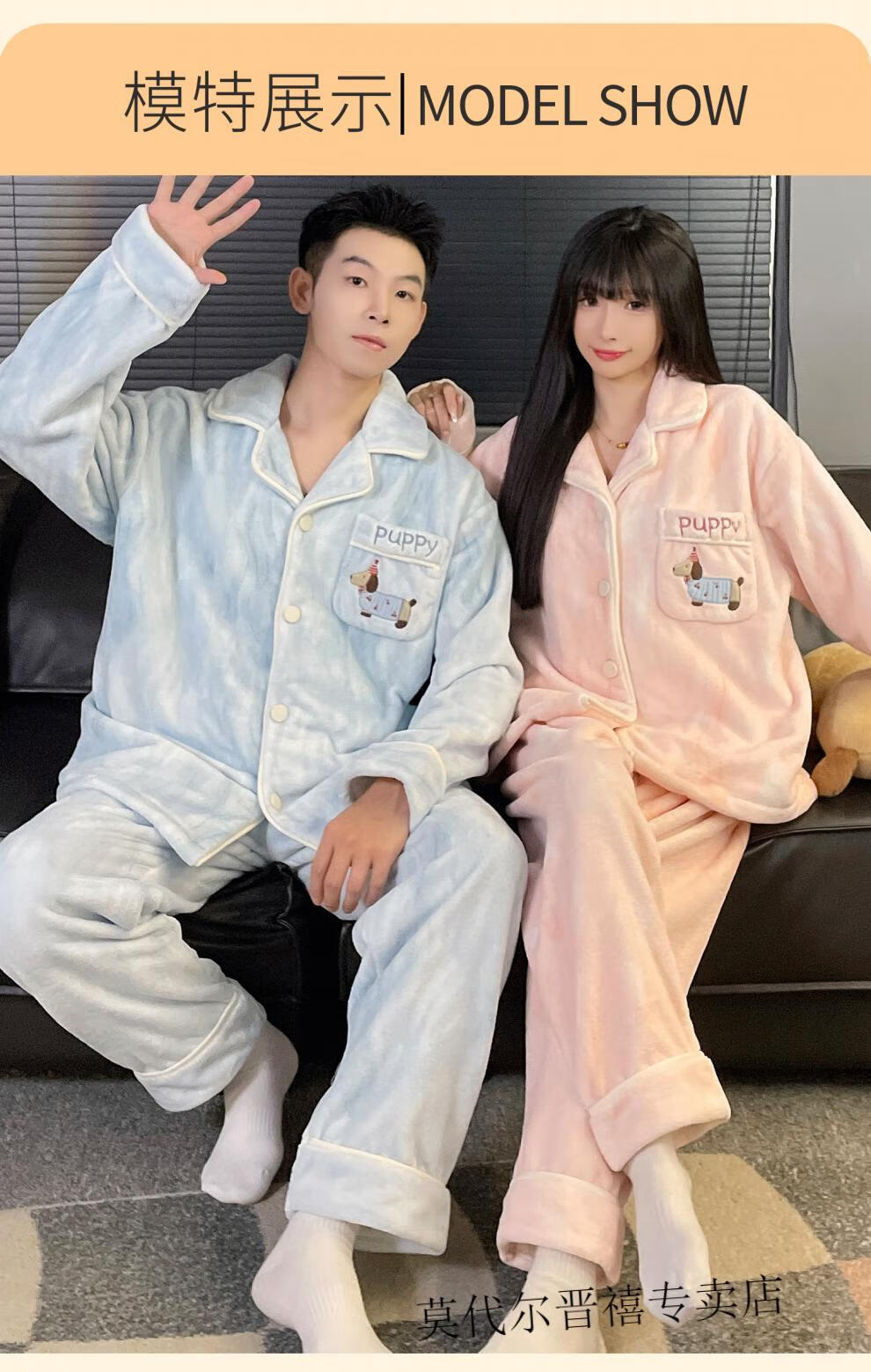 Modal Autumn and Winter Coral Fleece Couple Pajamas Women's Plus Velvet Thickened 2025 New Cartoon Dachshund Men's Home Clothes Set Dachshund Men's Blue * Women's Pink Couples need to take two sets L Female Recommended height 155-165c, weight 100-115Jin Jin equals 0.5 kg