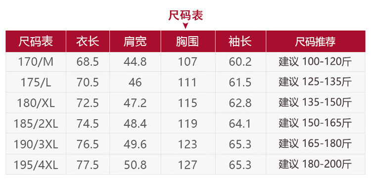 China (cm) 165 / 88-90 170 / 96-98 175 / 108-110 180 / 118-122 185 / 126-130