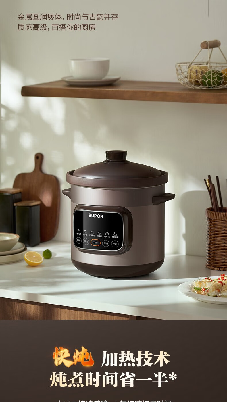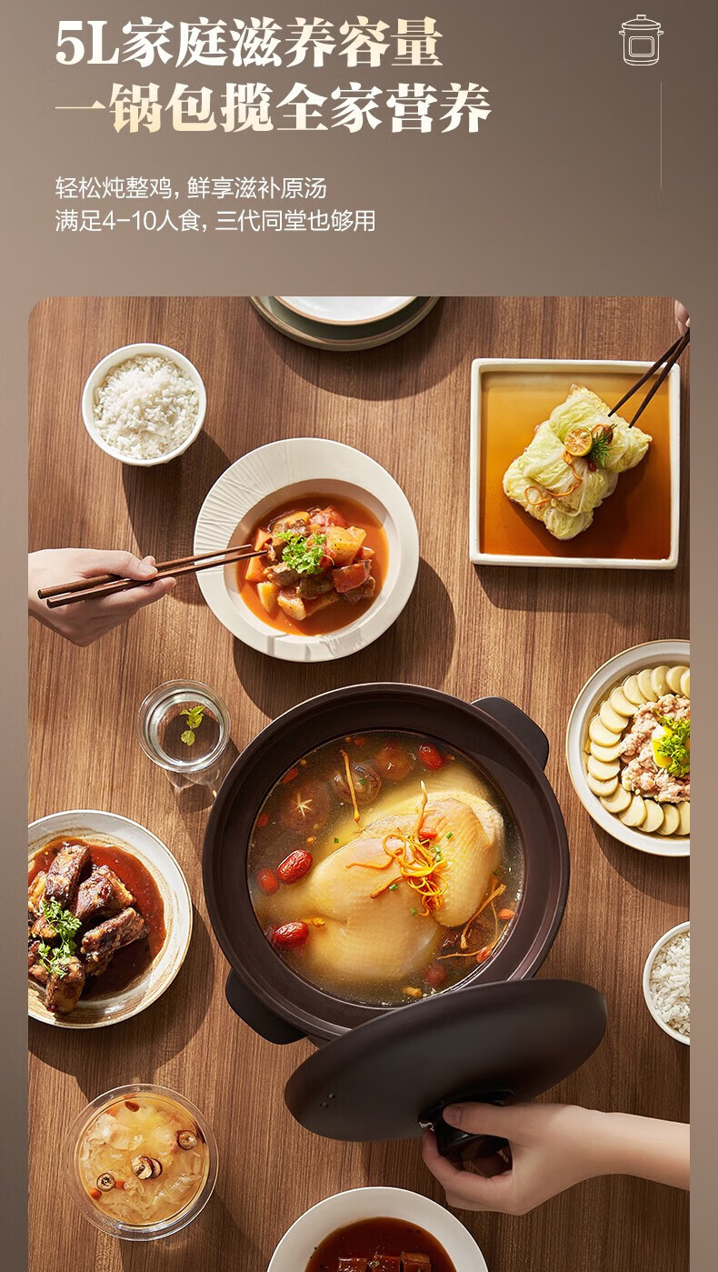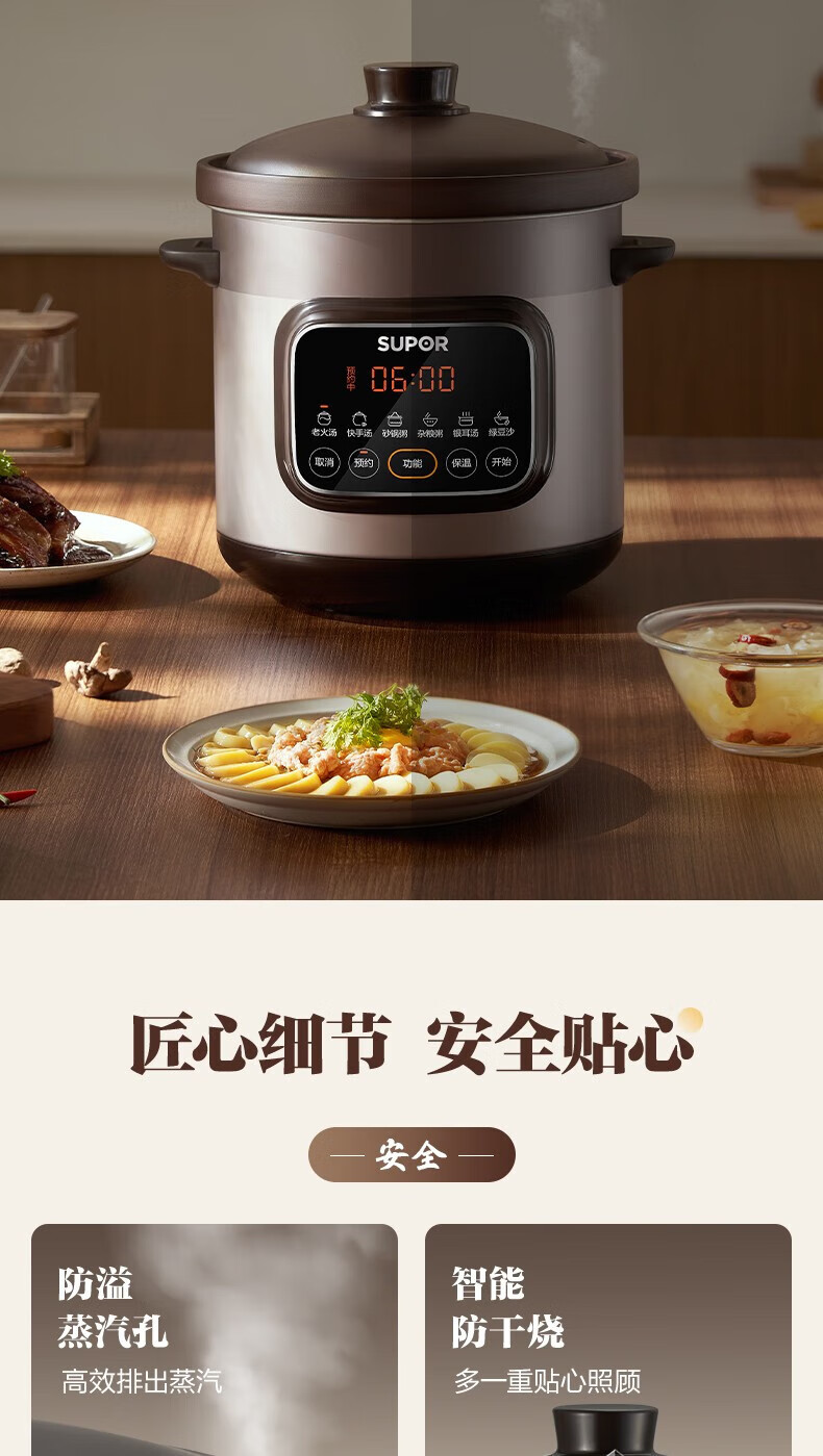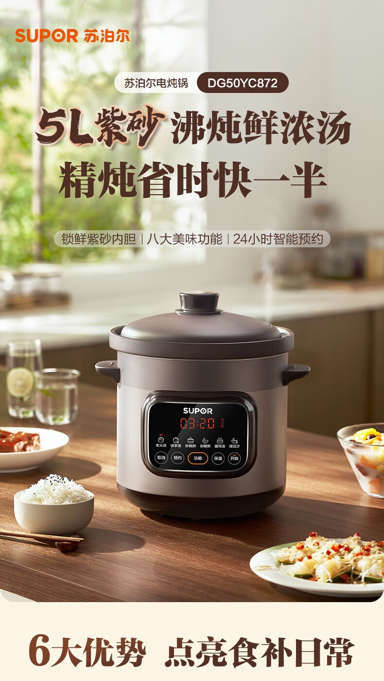 SUPOR Electric Stew Pot Purple Clay Pot 5L Large Capacity Quick Stew Pot Multifunctional Porridge Pot Electric Casserole Home Intelligent Reservation Stew Pot Electric Stew Cup Porridge Special Pot Purple Pottery Liner 5L 500W Fast and Slow Stew