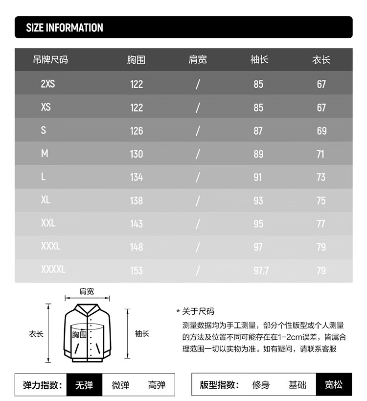 China (cm) 165 / 88-90 170 / 96-98 175 / 108-110 180 / 118-122 185 / 126-130