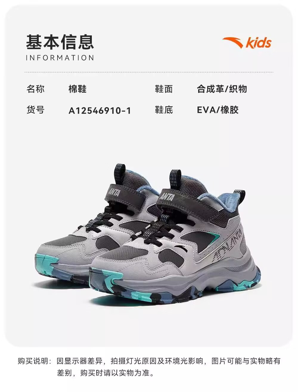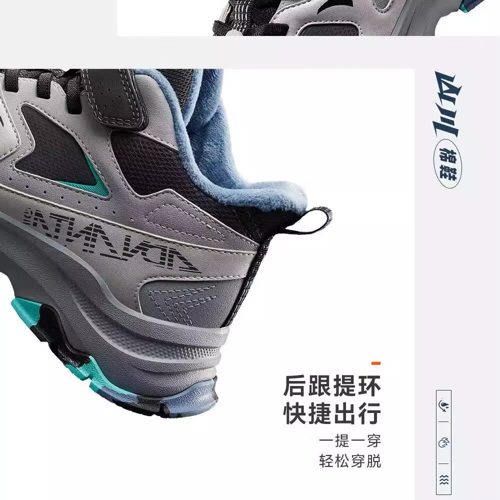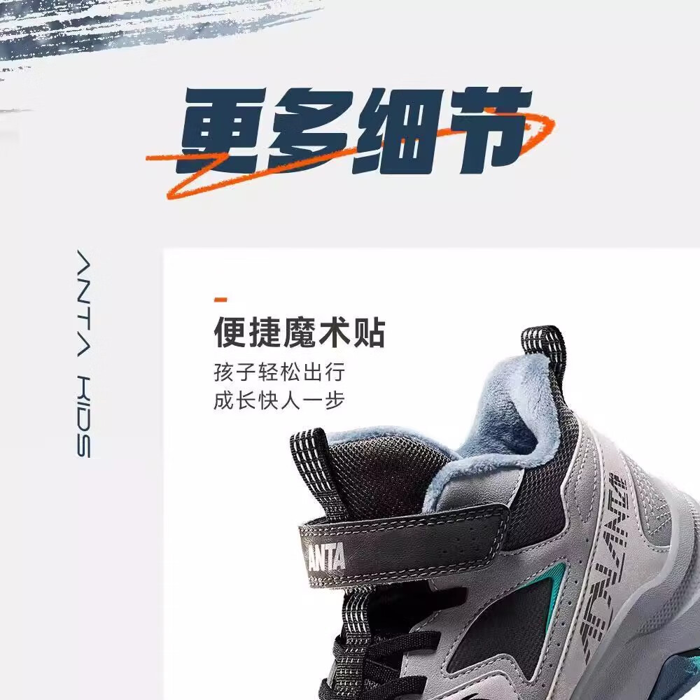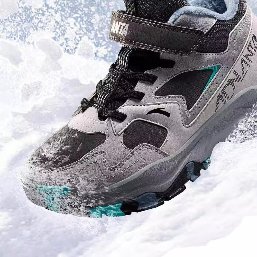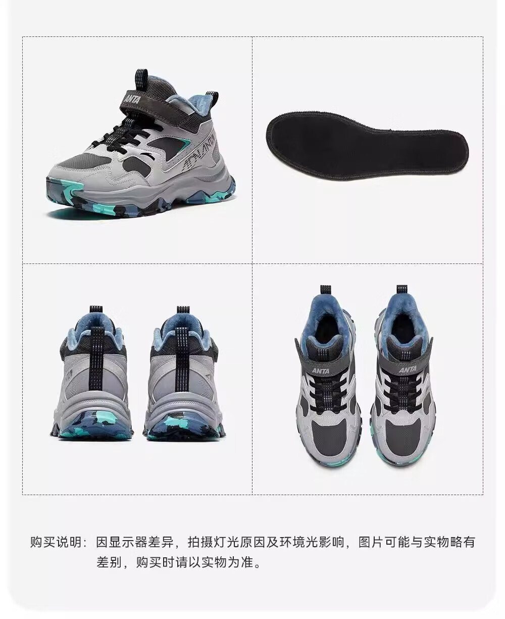 Anta children's cotton shoes for boys, middle and large children, 2026 winter new style plus velvet cotton shoes, high-top comfortable and warm snow boots, castle gray/fog gray/silver-1 Velcro 36, foot length about 23cm