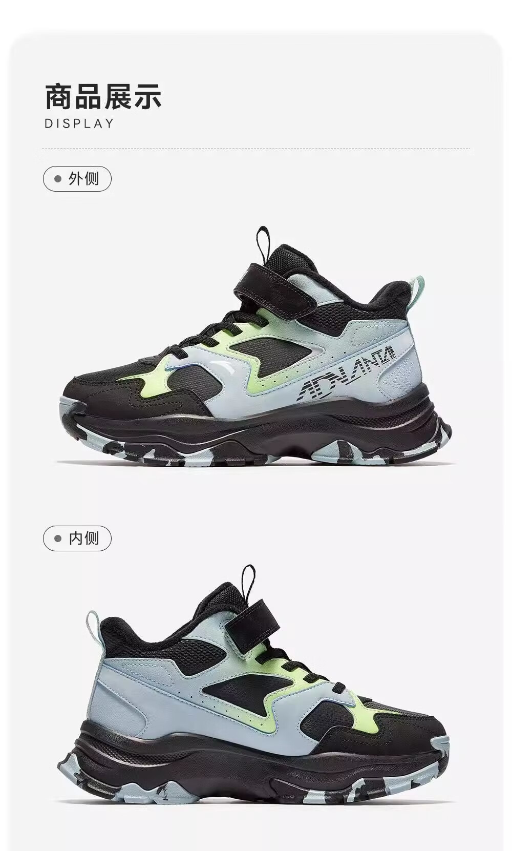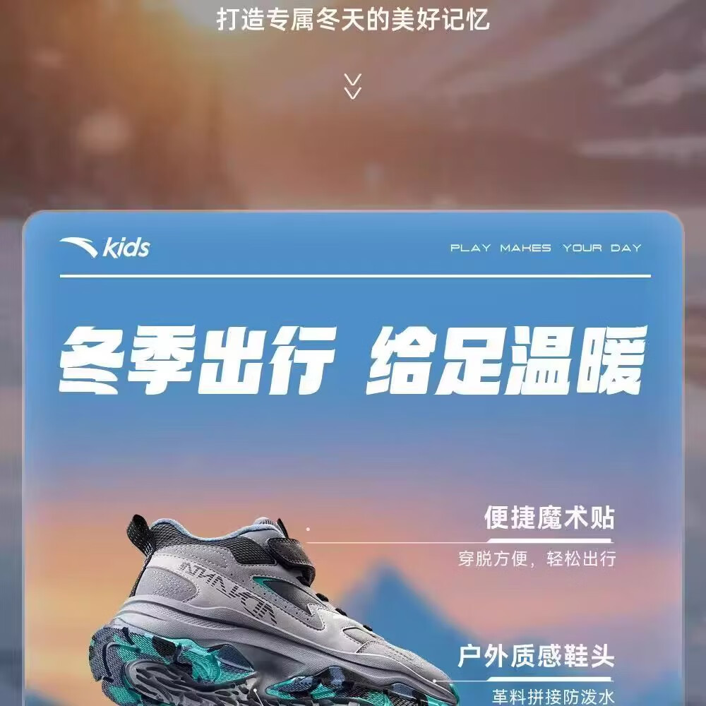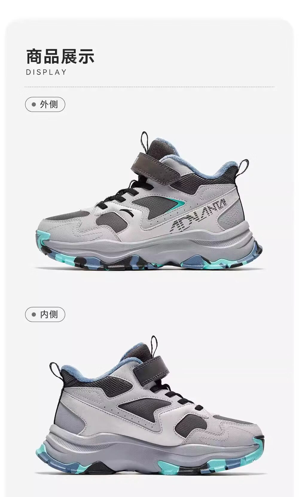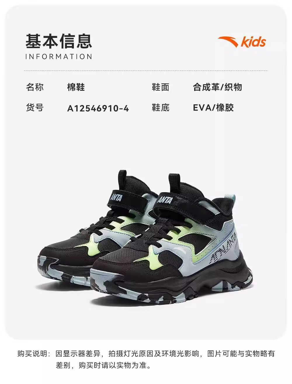 Anta children's cotton shoes for boys, middle and large children, 2026 winter new style plus velvet cotton shoes, high-top comfortable and warm snow boots, castle gray/fog gray/silver-1 Velcro 36, foot length about 23cm