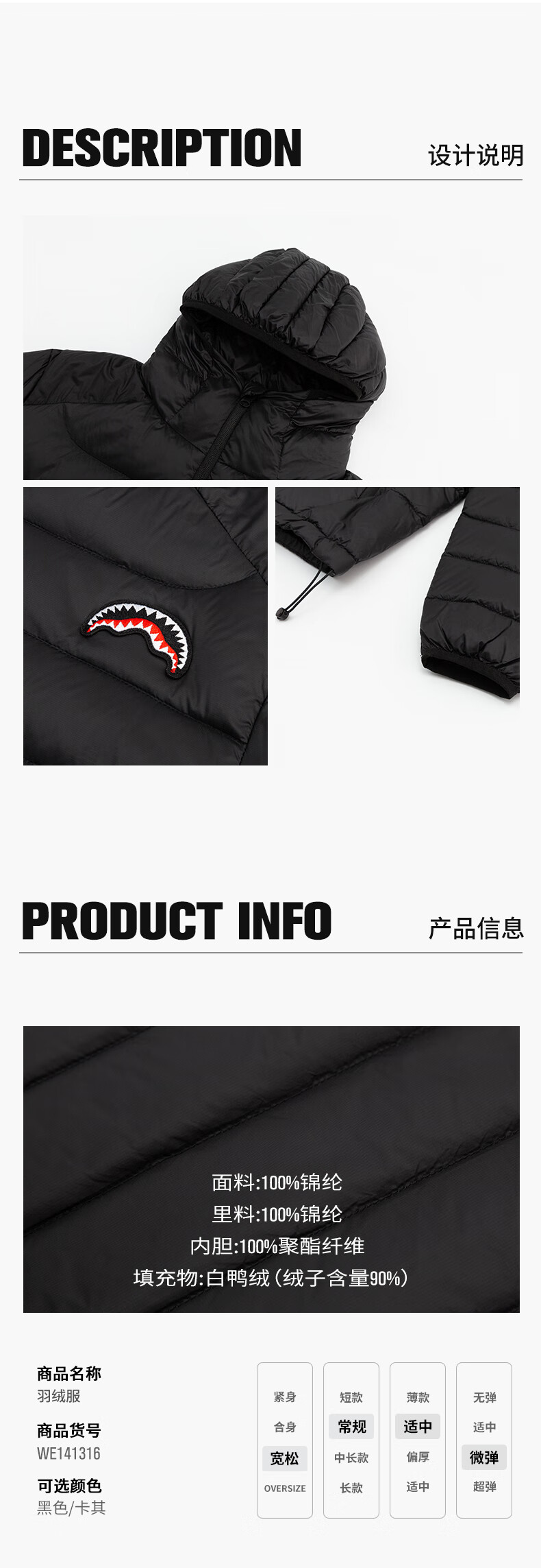SPRAYGROUND shark mouth 90 white duck down light rib down jacket men and women winter warm hooded jacket Khaki XL