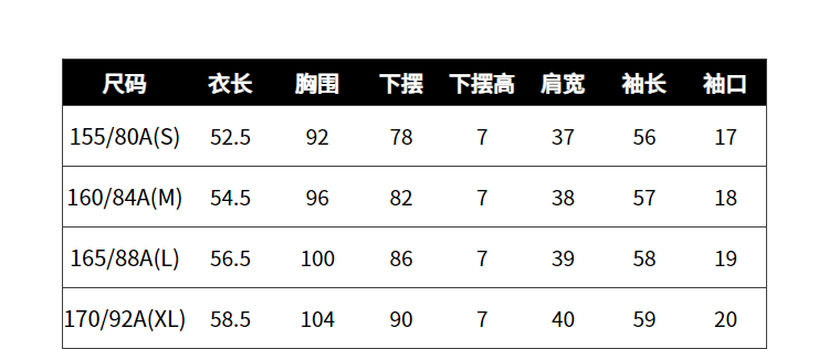 China (cm) 160-165/84-86 165-170 / 88-90 167-172 / 92-96 168-173 / 98-102 170-176 / 106-110
