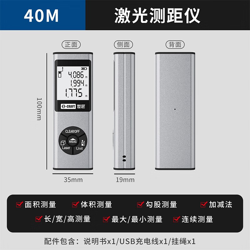 Shijiang Laser Tape Distance Meter Measurement Ruler Intelligent Digital Display Tape Measure Three-in-One Room Measurement Alloy Model 40 Meters USB Rechargeable Laser Cross