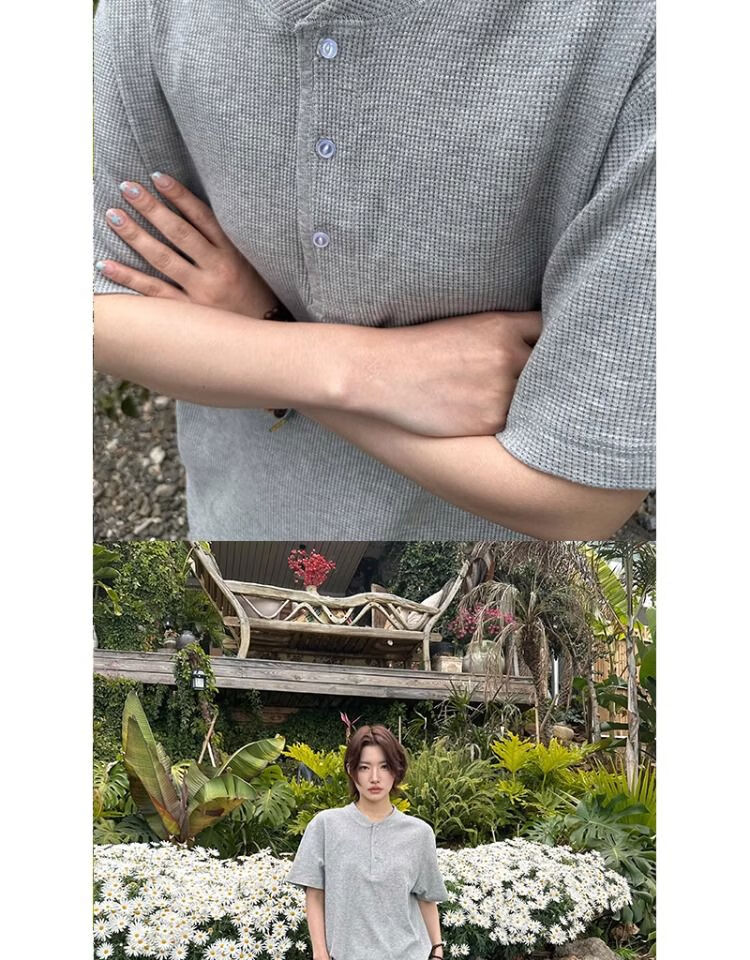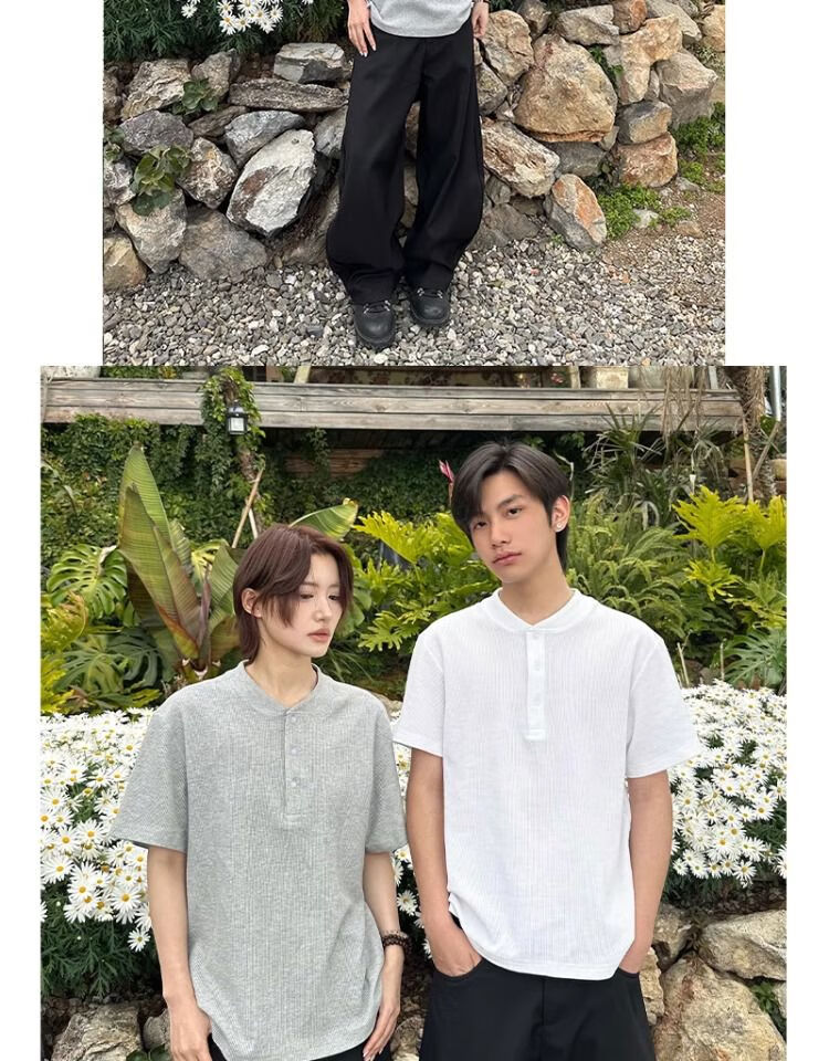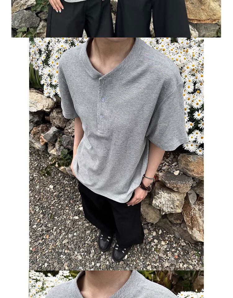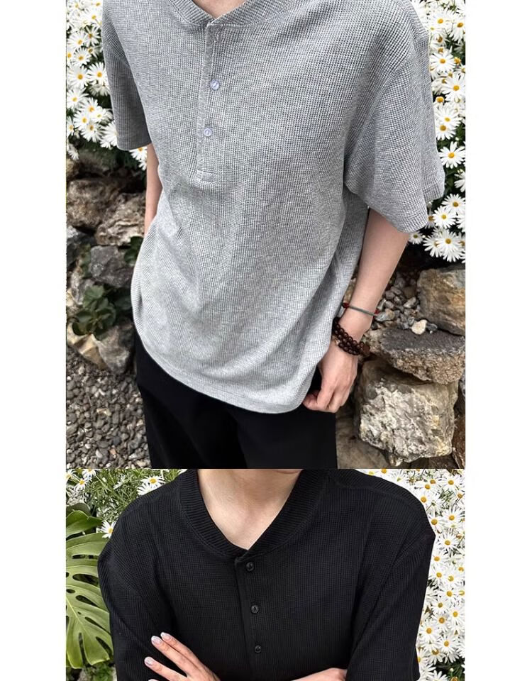 Black waffle Henry collar short-sleeved men's handsome T-shirt American polo shirt cleanfit bottoming shirt floral gray upgraded model XL XL recommended 135-150Jin Jin equals 0.5 kg