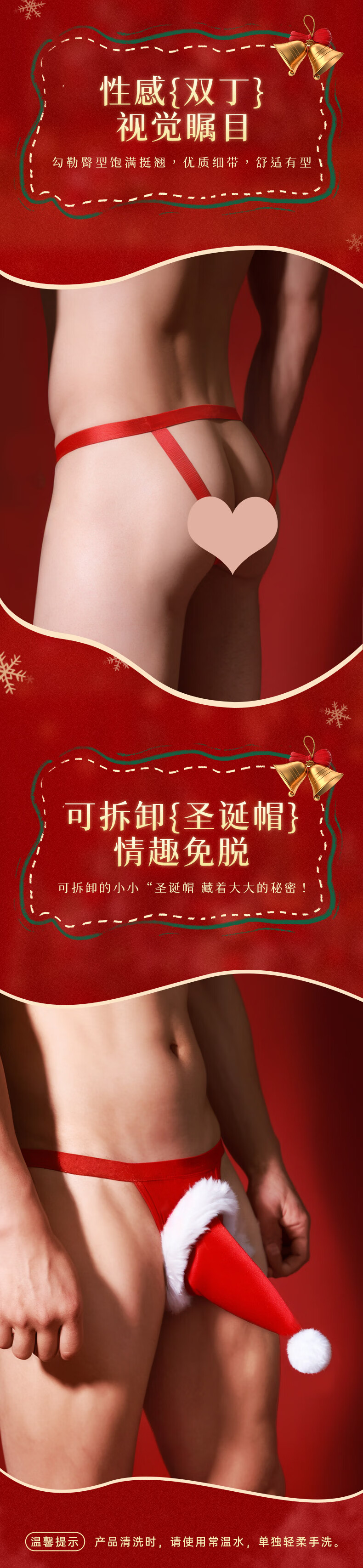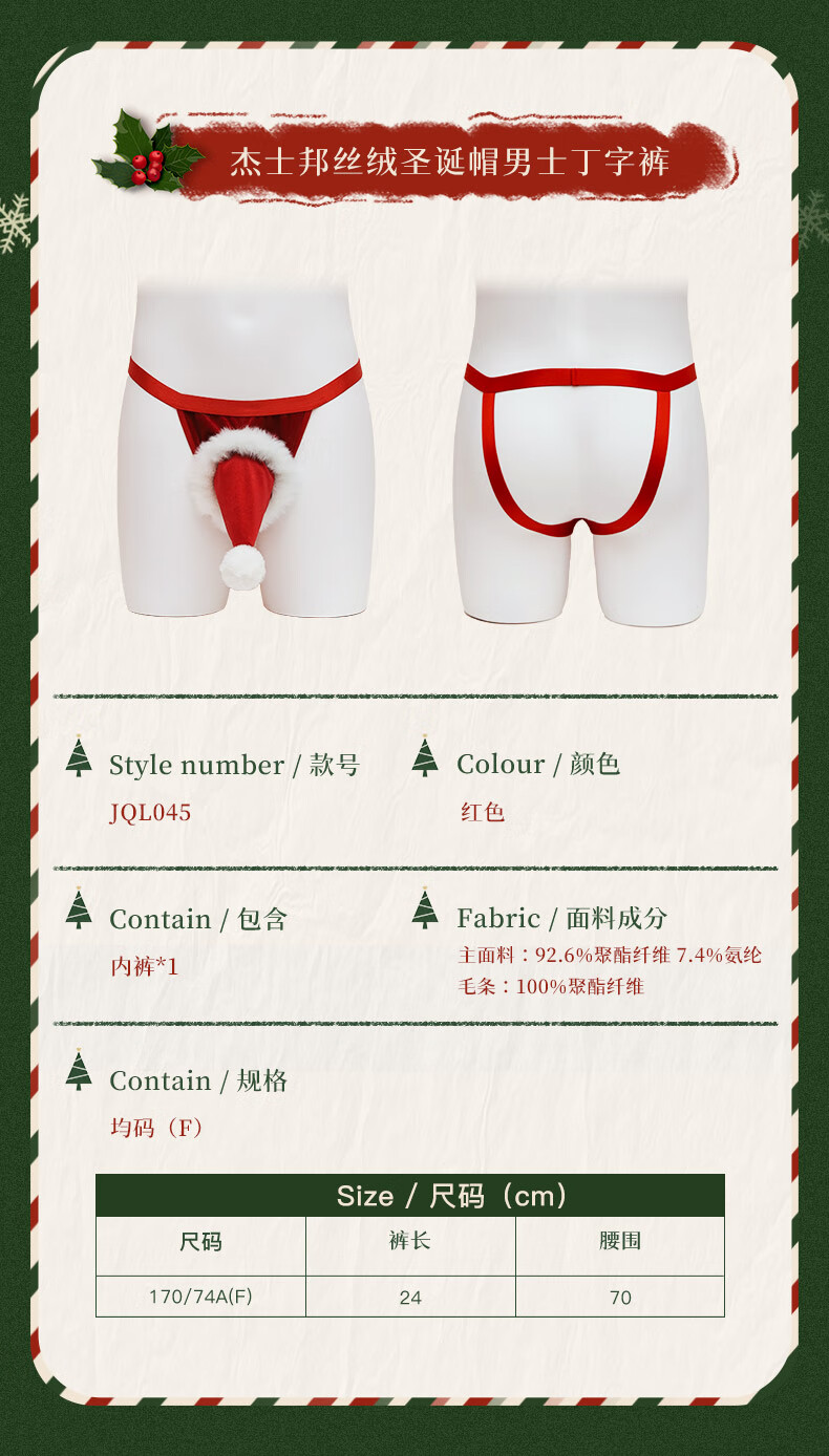 Jesse Bond Velvet Christmas Gift Sexy Underwear Men's Double Thong Party Performance Cosplay Underwear One Size Men's Red Santa Hat Thong