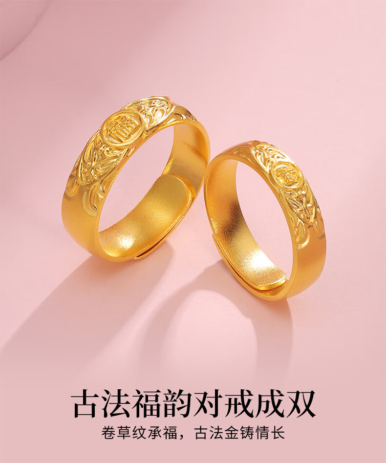 Jinzhifu inheritance gold ring for men and women, curly grass pattern blessing ring, solid gold ancient method ring, couple ring, gift for husband, wife, curly grass pattern blessing ring 18.8g (pair)