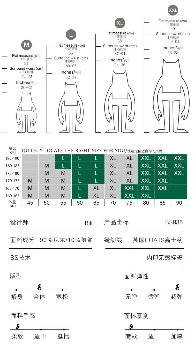 China (cm) 165 / 88-90 170 / 96-98 175 / 108-110 180 / 118-122 185 / 126-130