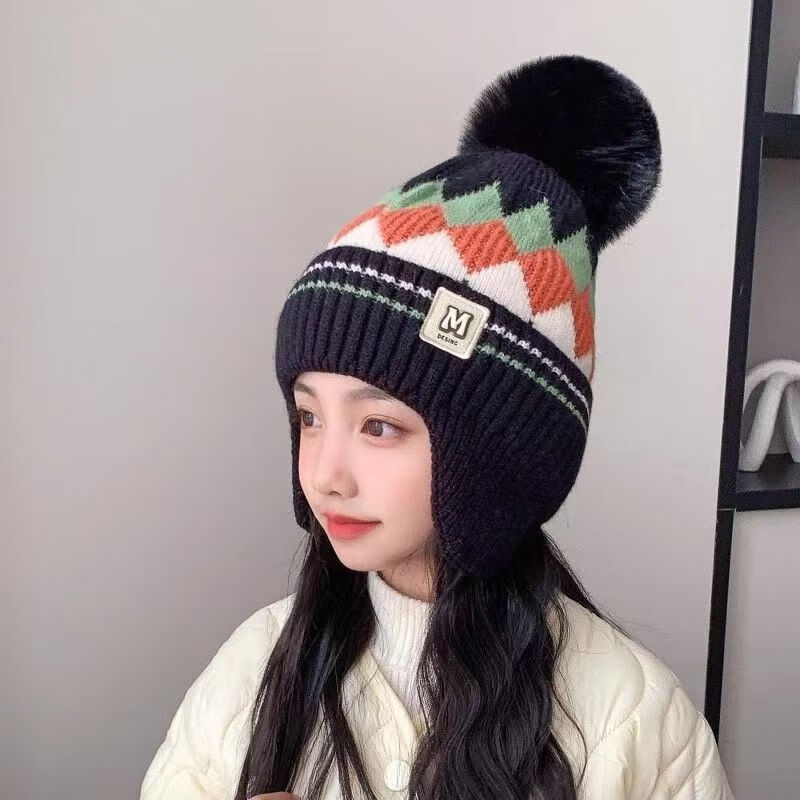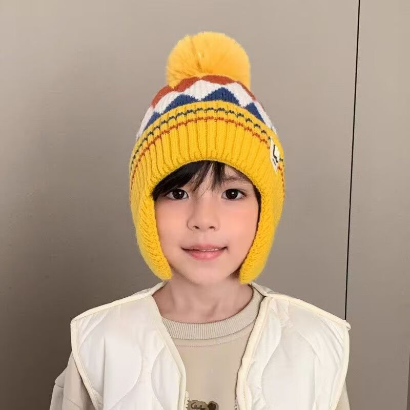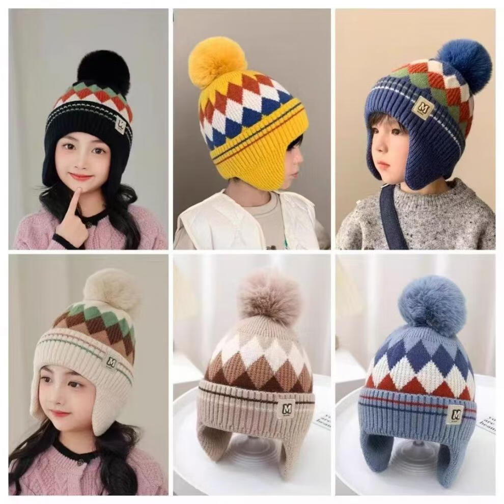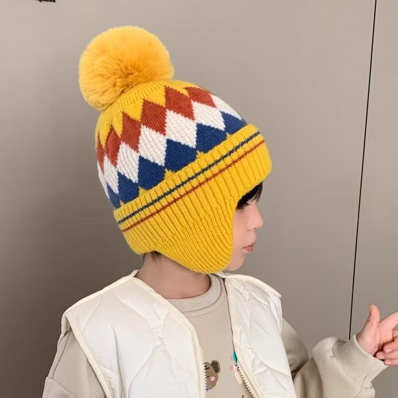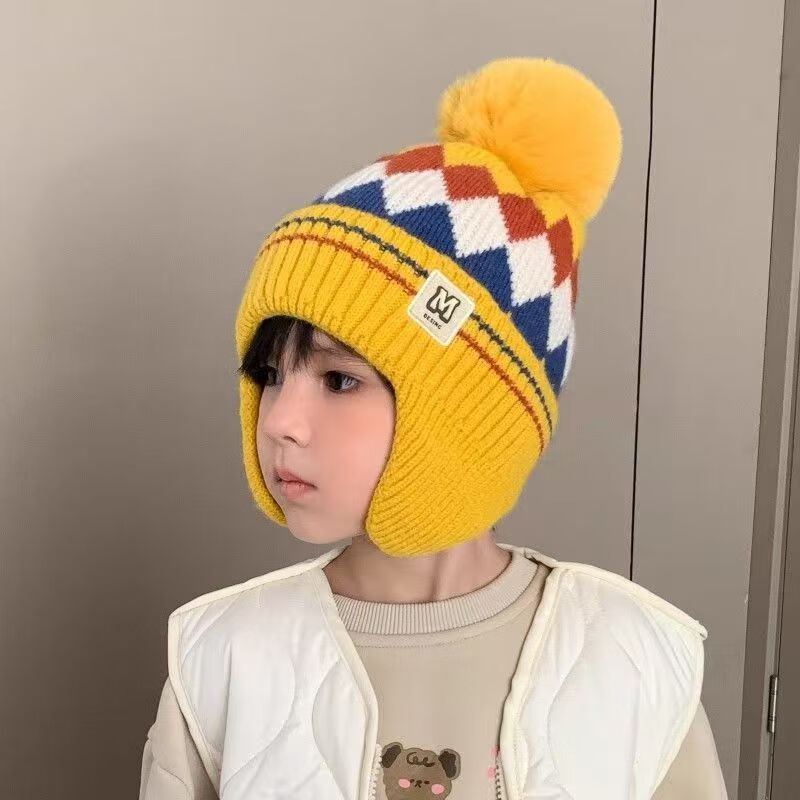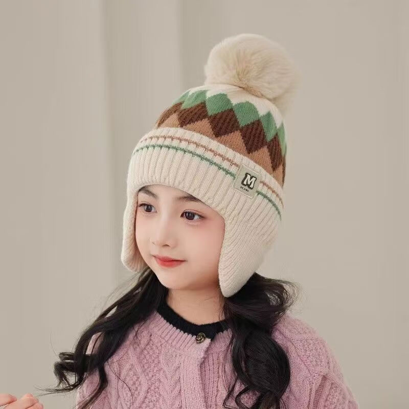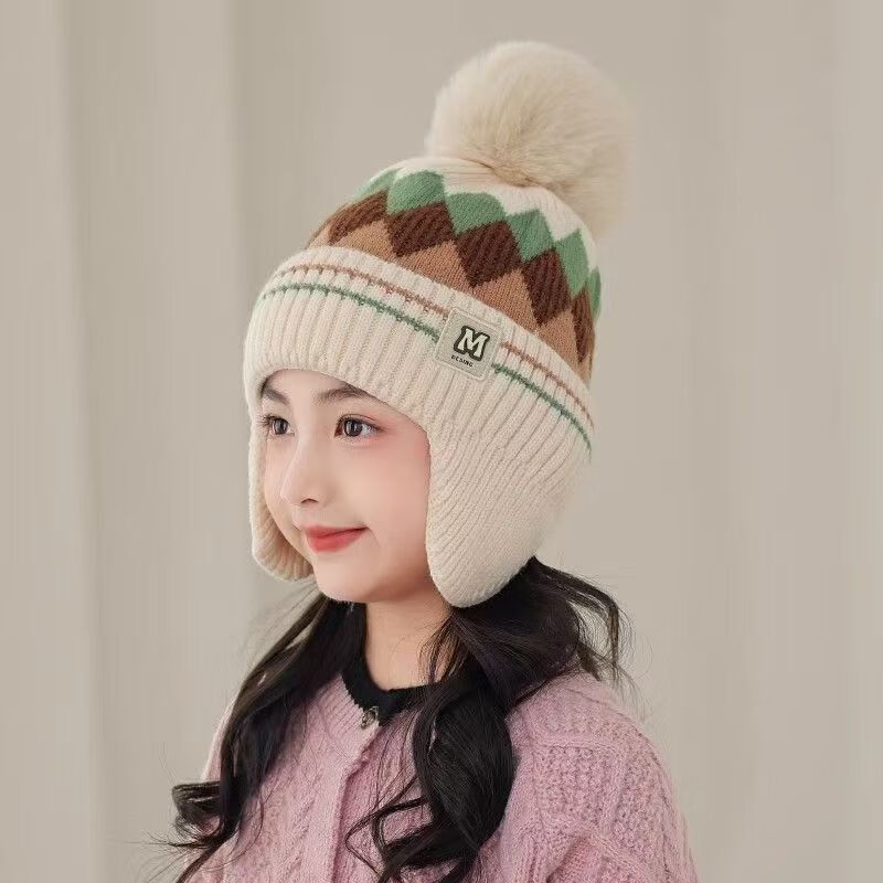 Wen Xiaoying (HELLO YING) winter children's warm hat autumn and winter rhombus windproof ear protection hat for boys and girls baby knitted thickened woolen hat children's knitted rhombus M-beige