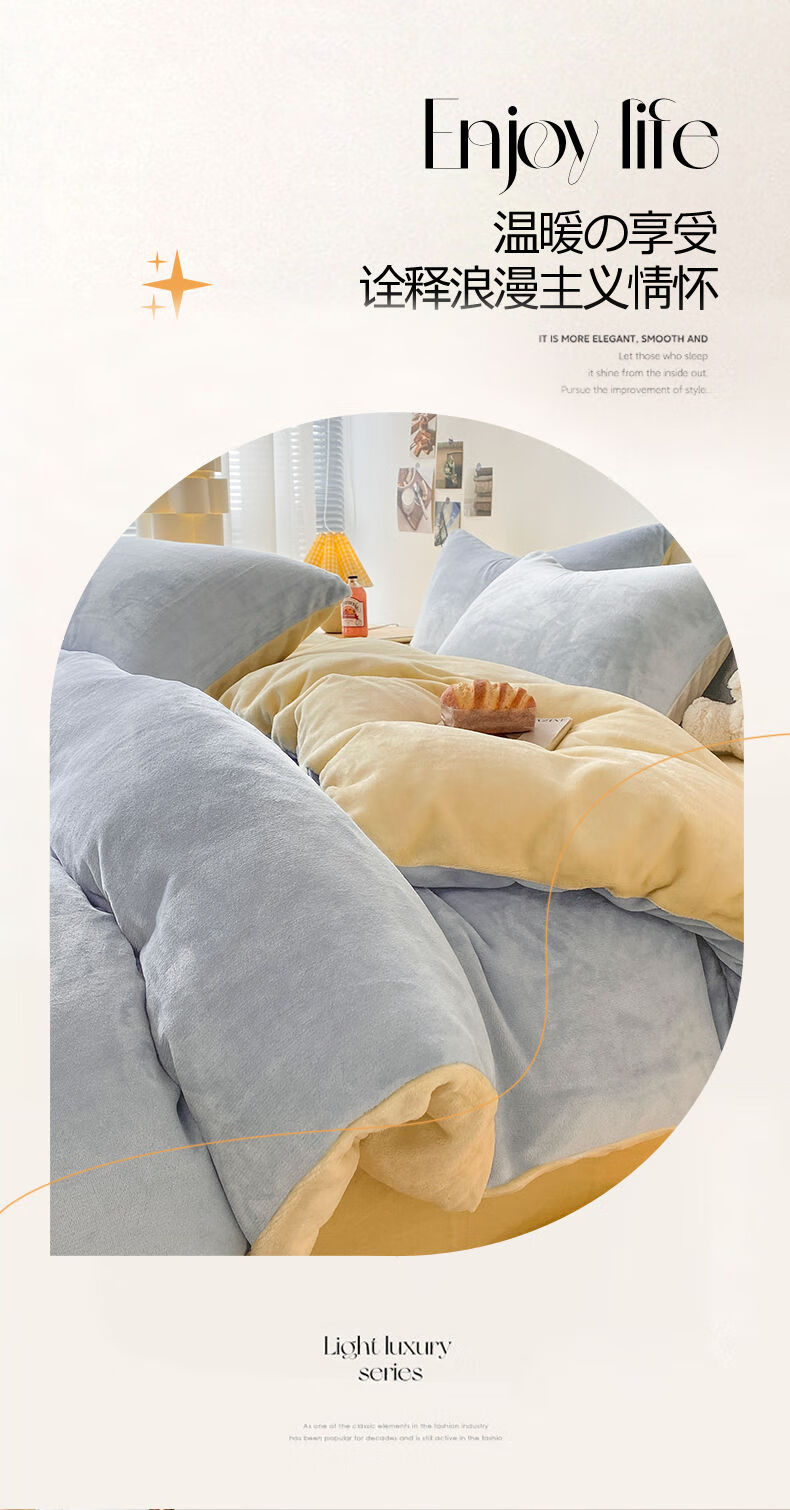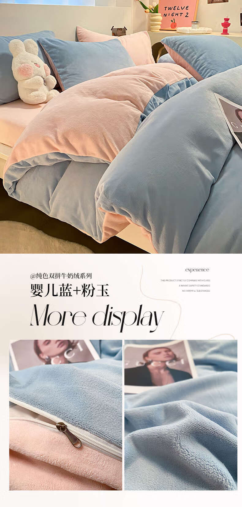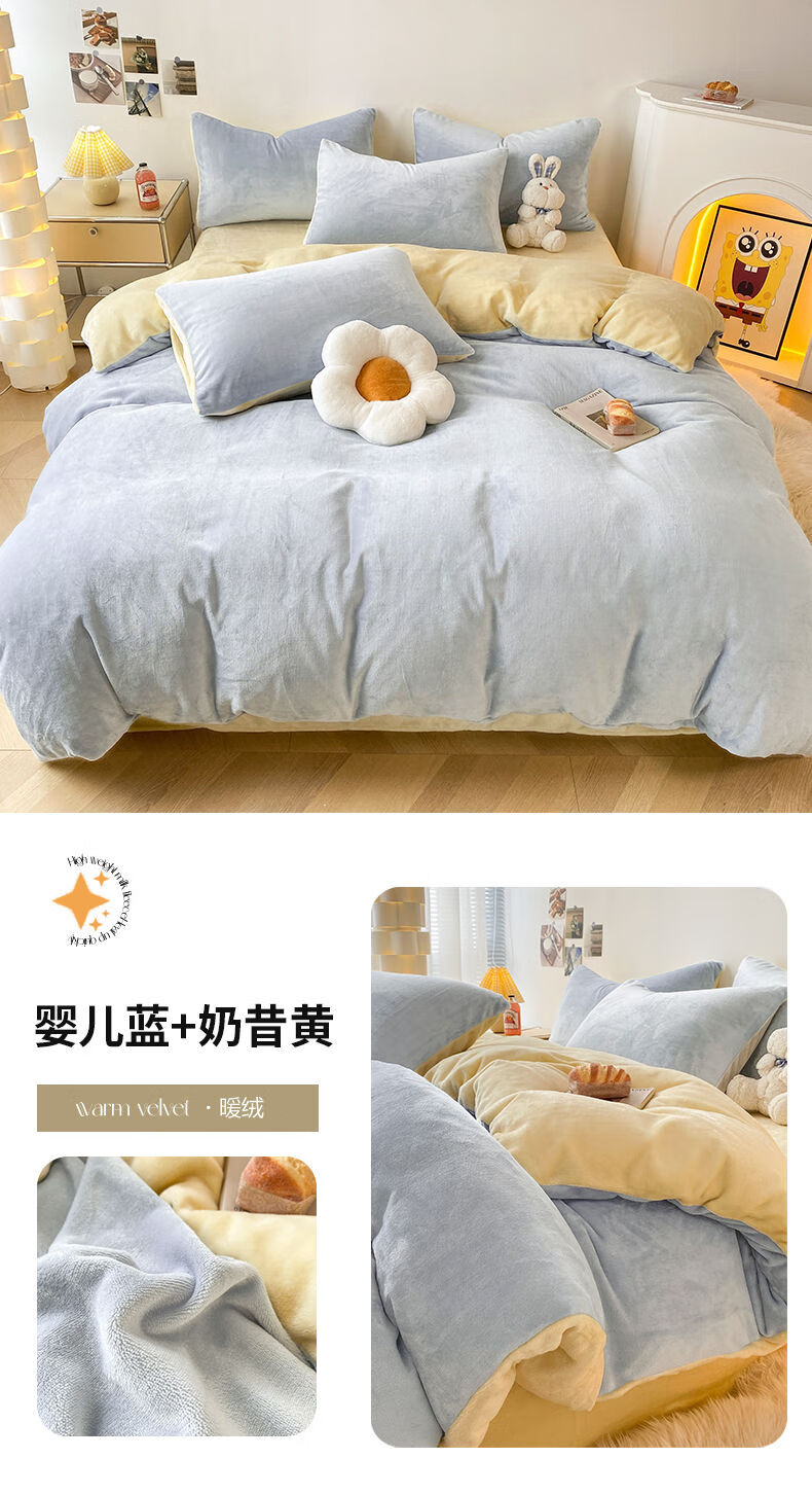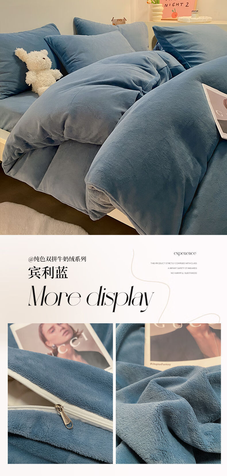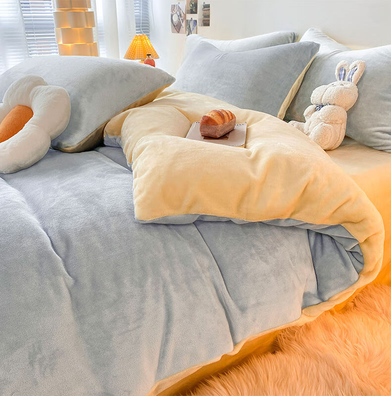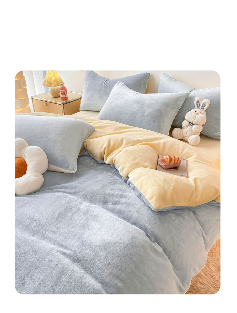 Blanket quilt winter four-piece milk velvet bed thickened coral velvet double-sided plus velvet flannel three-piece bed set baby blue + light gray double-sided warm velvet skin-friendly and delicate bed cover 220x240cm milk velvet quilt cover single piece