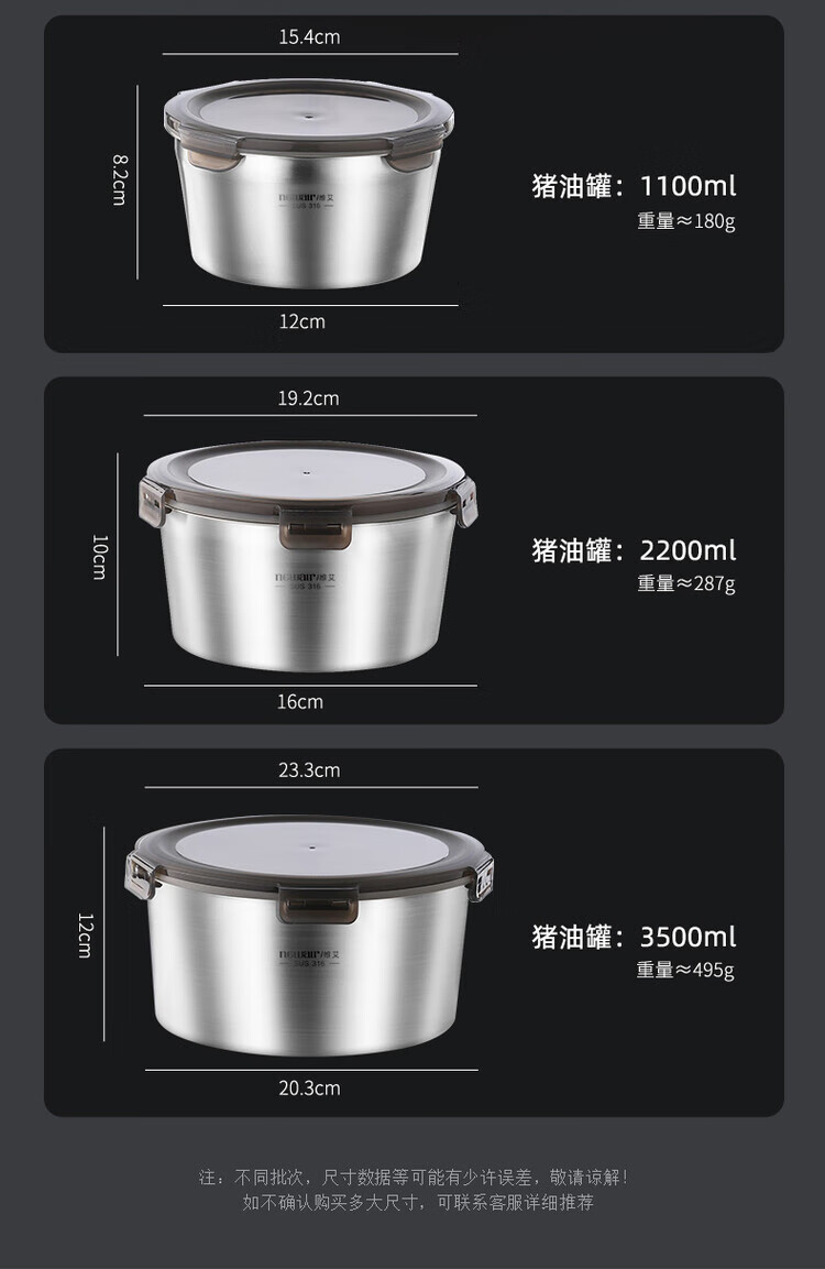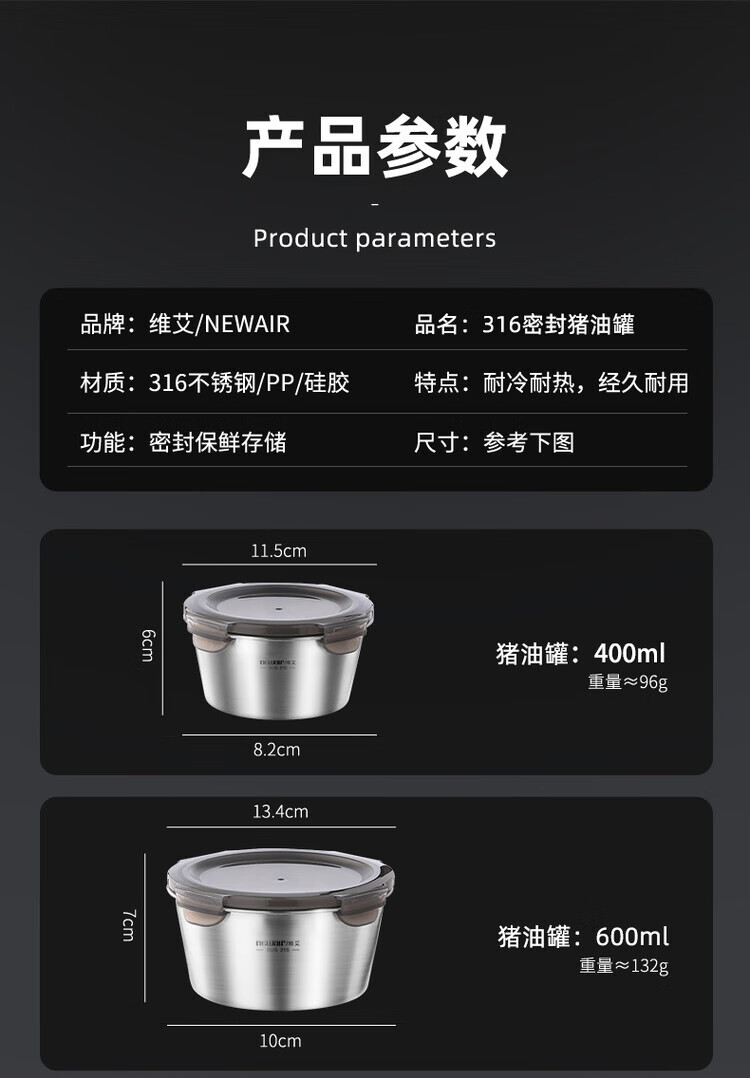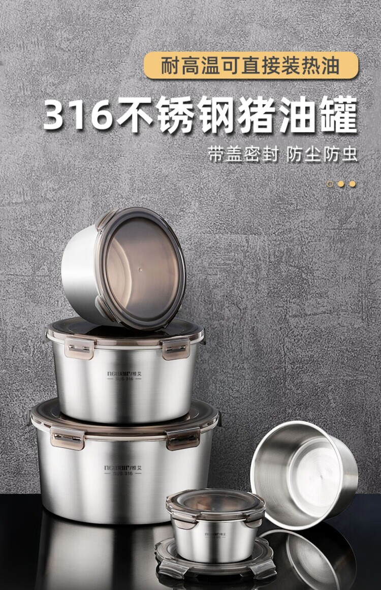 Weiai lard jar household food grade 316 stainless steel seasoning jar chili oil special storage sealed jar can be placed in the refrigerator thickened 316 lard jar with lid-2200ml 2 pieces