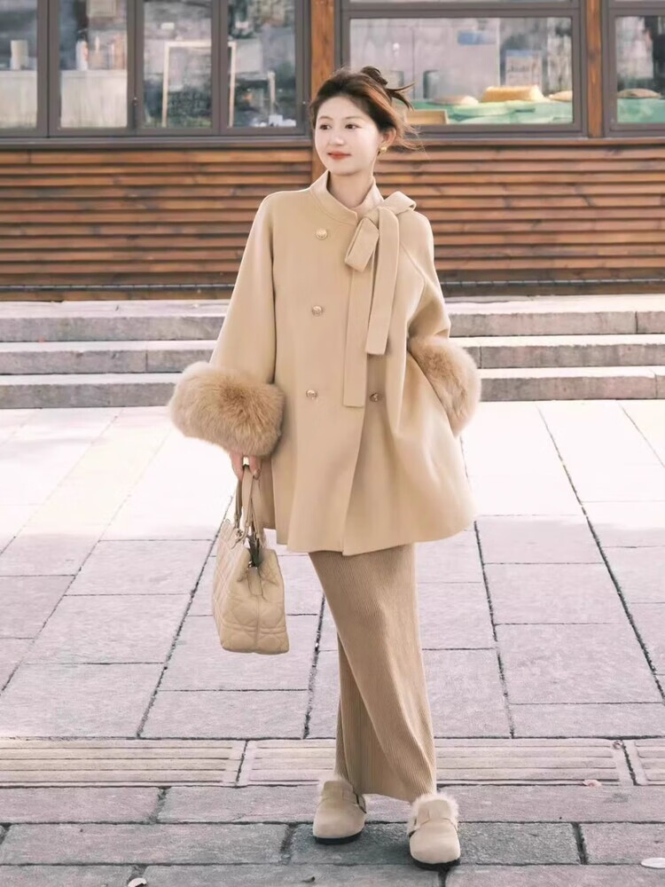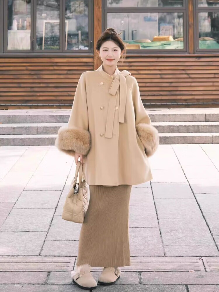 The bold and spicy lady's plus size women's woolen coat autumn and winter new style fat mm slimming temperament royal sister's age-reducing small fragrant skirt two-piece set khaki apricot woolen + skirt suit 3XL (recommended 160-180Jin Jin is equal to 0.5 kg)
