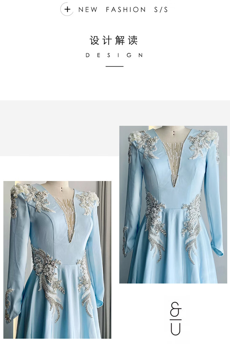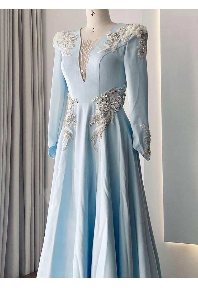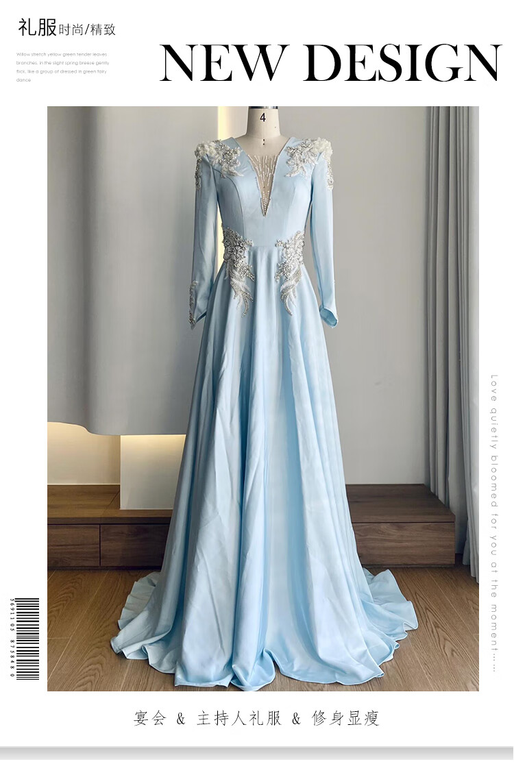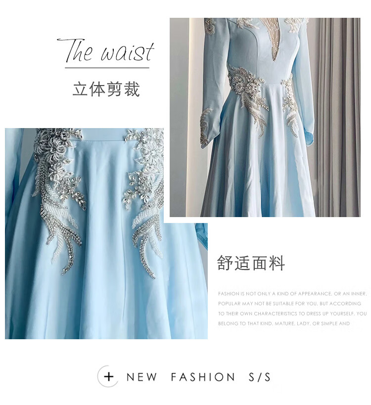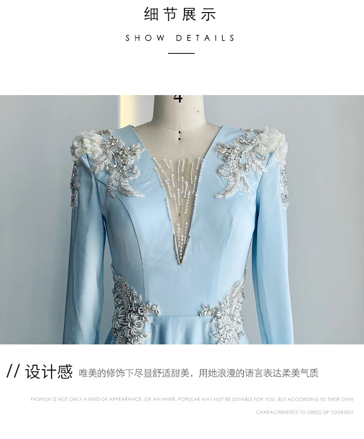 High-end host performance evening dress female dignified atmosphere evening party chorus guzheng long skirt vocal music test dress light blue 2XL