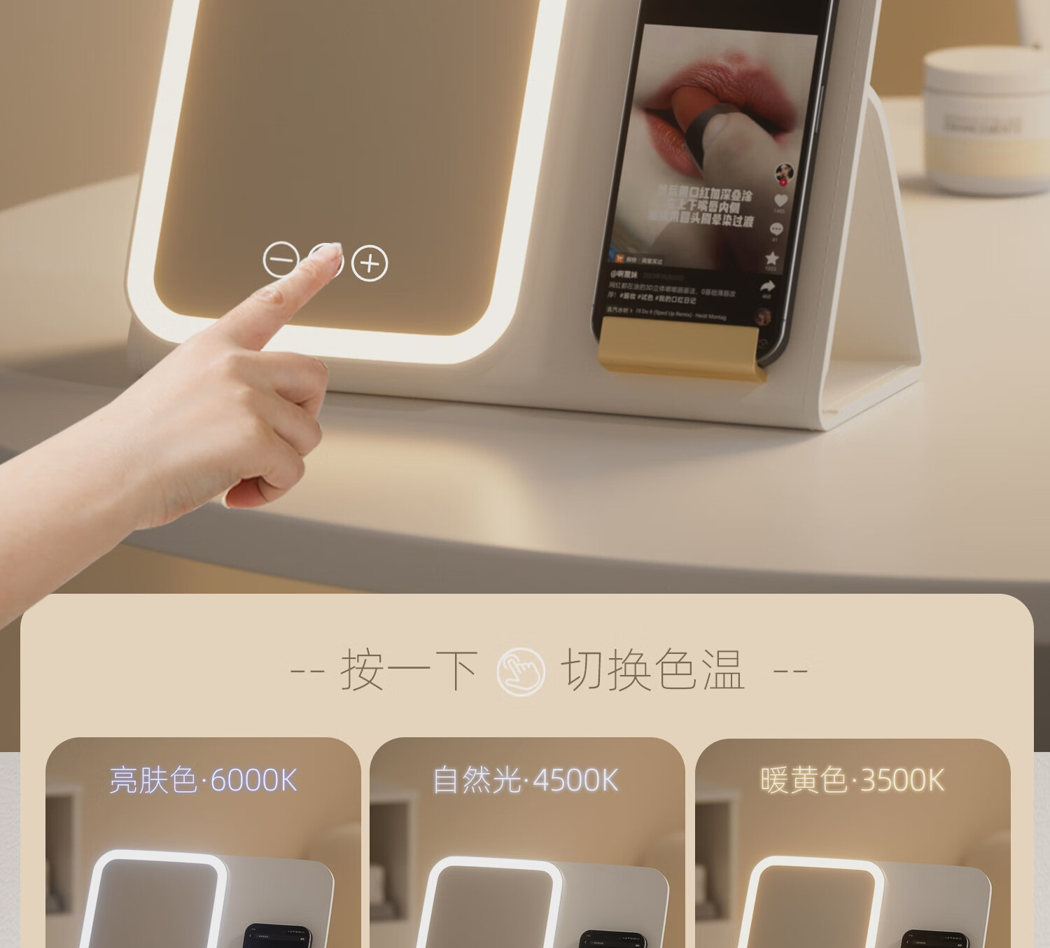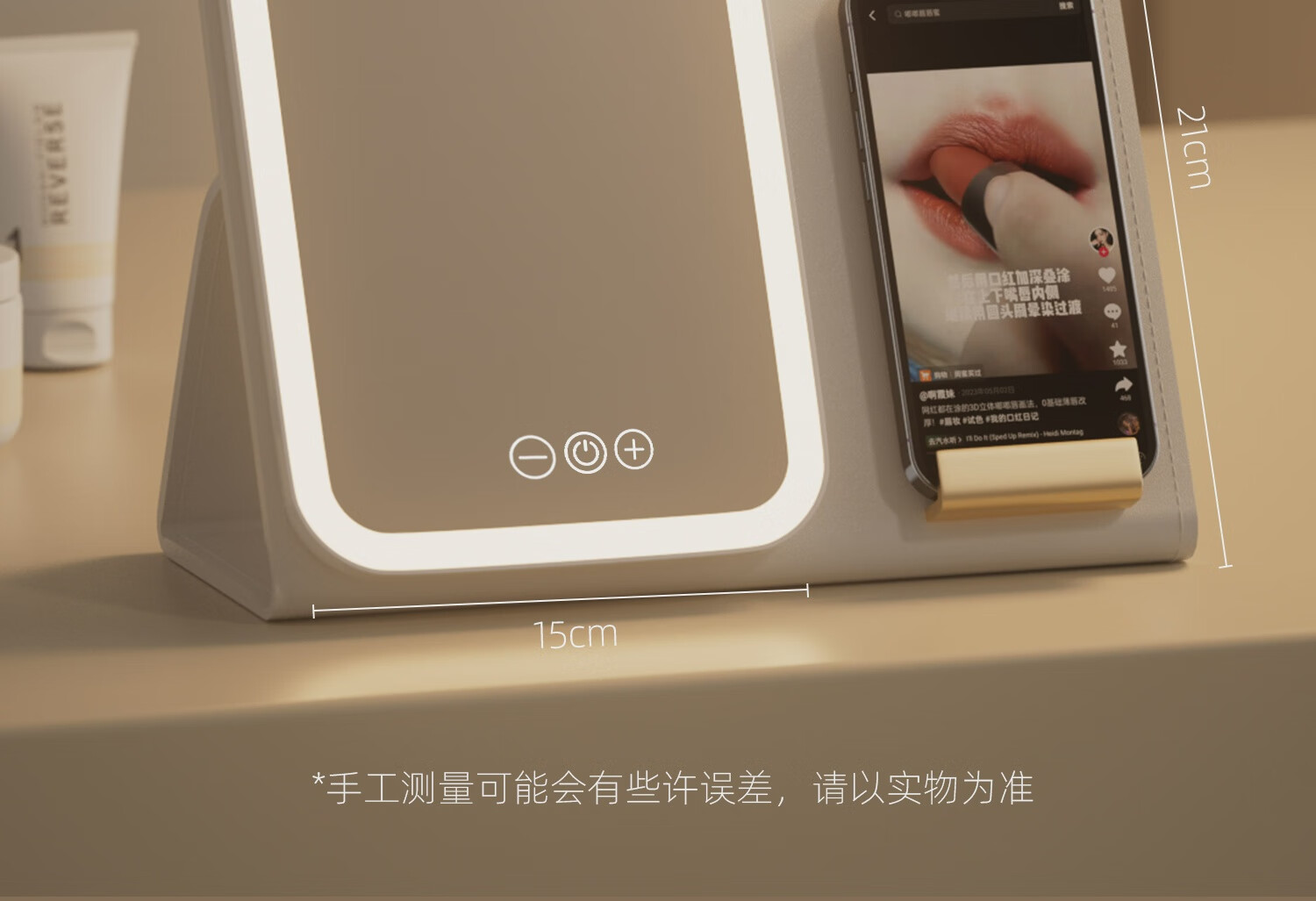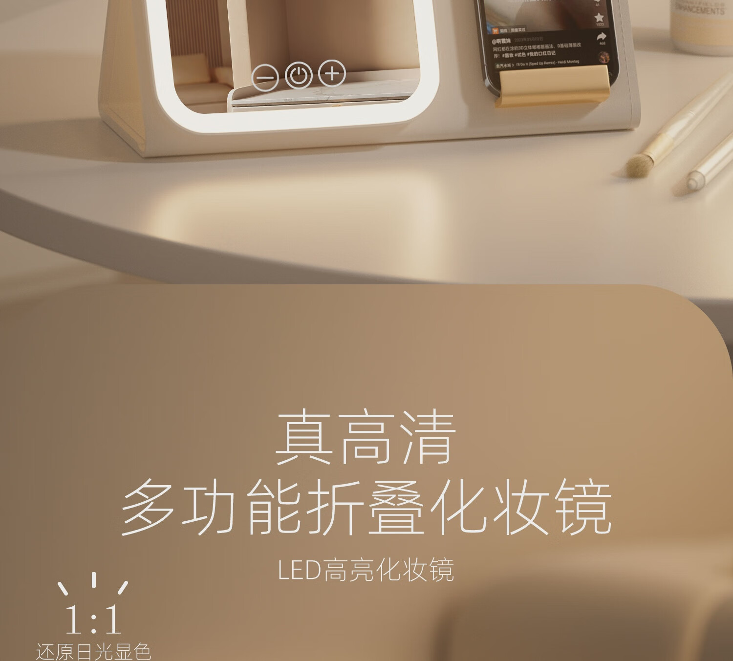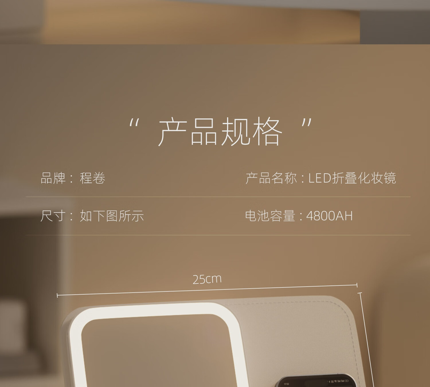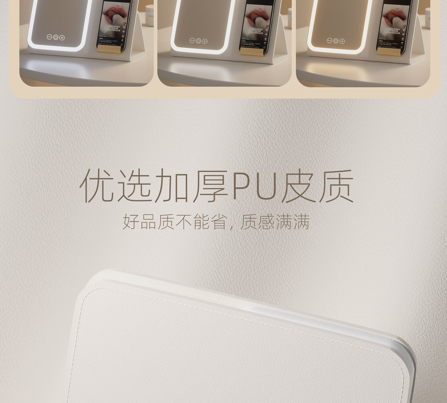 Mirror makeup mirror LED with light portable folding desktop desktop student dormitory home travel white large size three-button control folding portable -4800AH