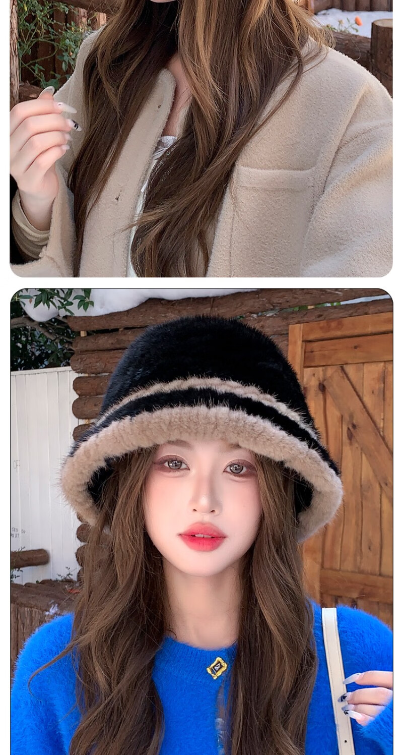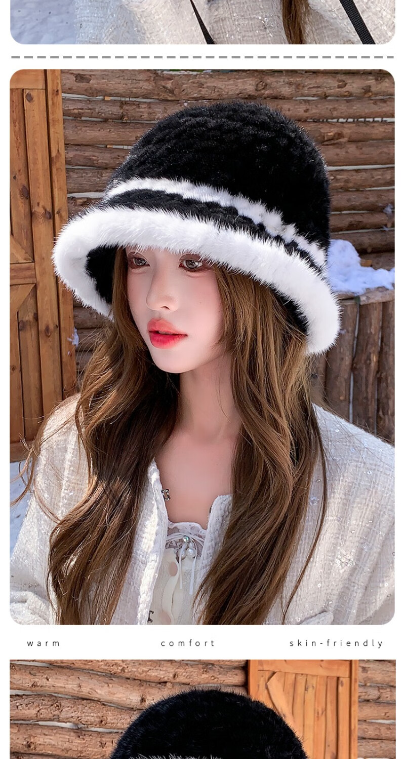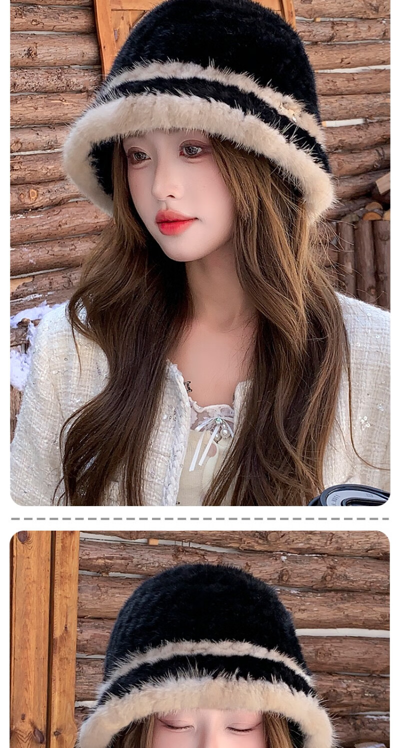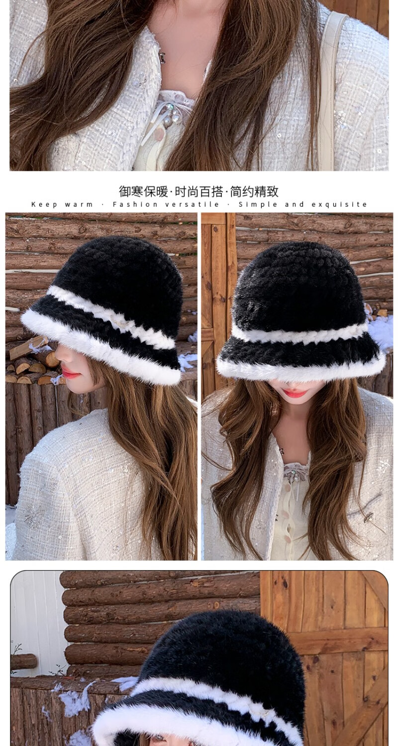 Princess Mink Korean Mink Fur Braided Fur Hat Women's Colorblock Fisherman Hat Mink Fur Top Hat Women's Winter Warm Black Gami One Size, Elastic