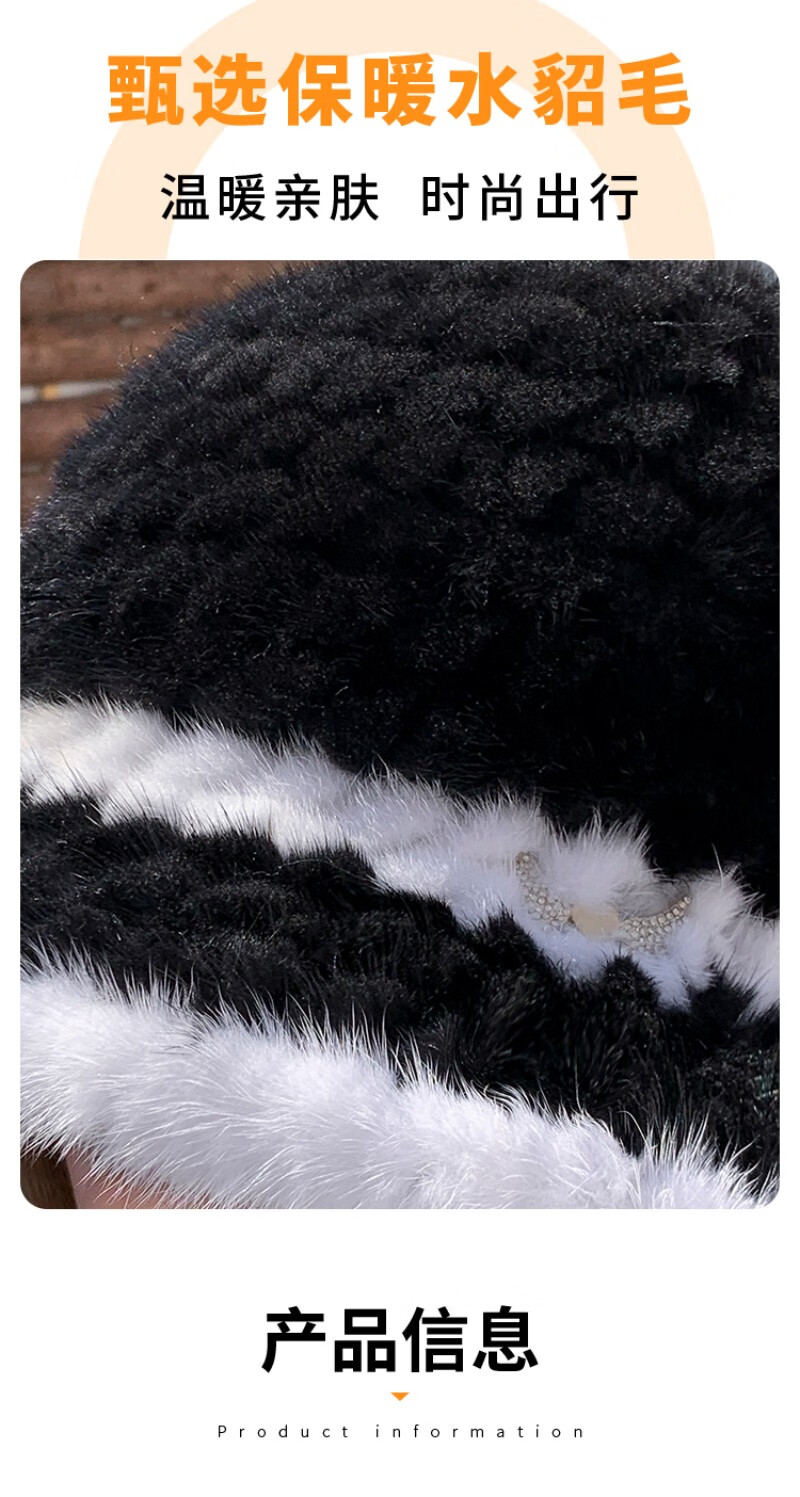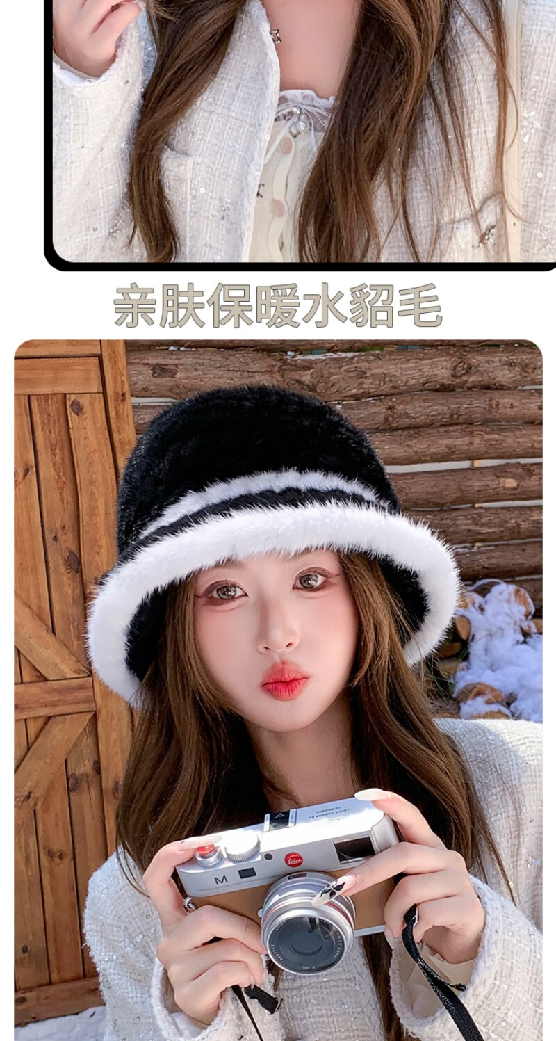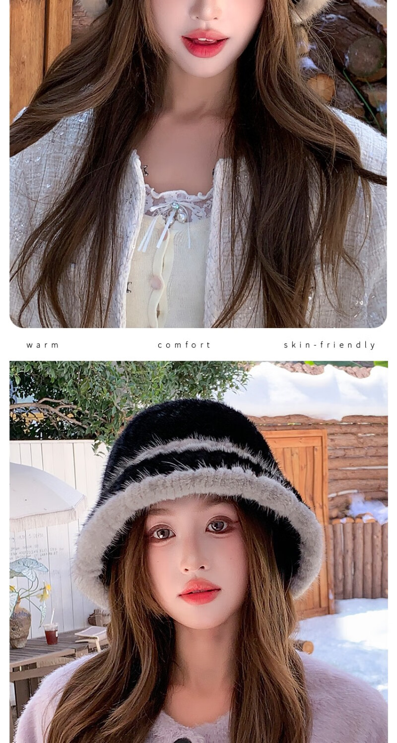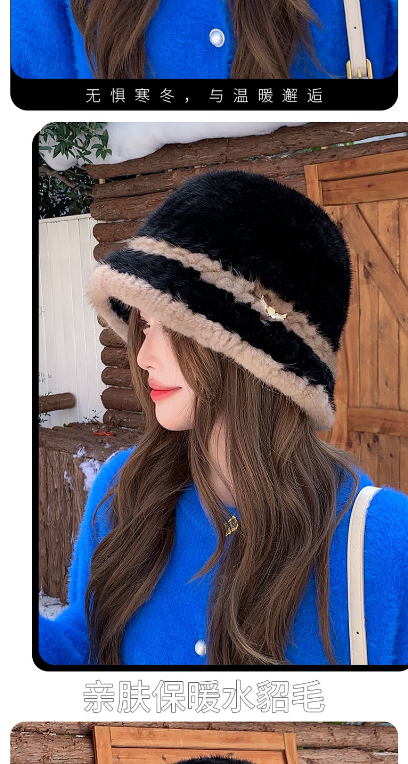 Princess Mink Korean Mink Fur Braided Fur Hat Women's Colorblock Fisherman Hat Mink Fur Top Hat Women's Winter Warm Black Gami One Size, Elastic