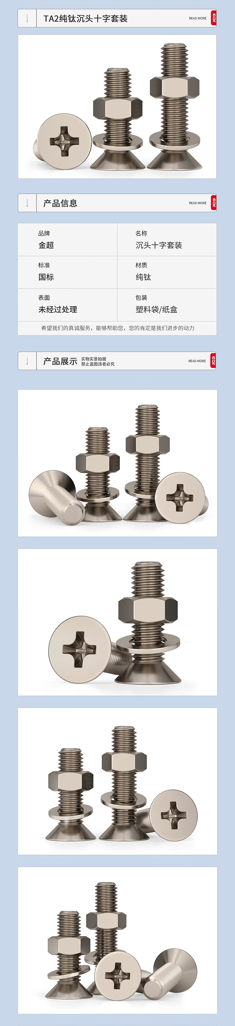 Jinchao national standard TA2 pure titanium countersunk head cross screw nut set combination flat head screw nut flat washer M3*45 (1 set)