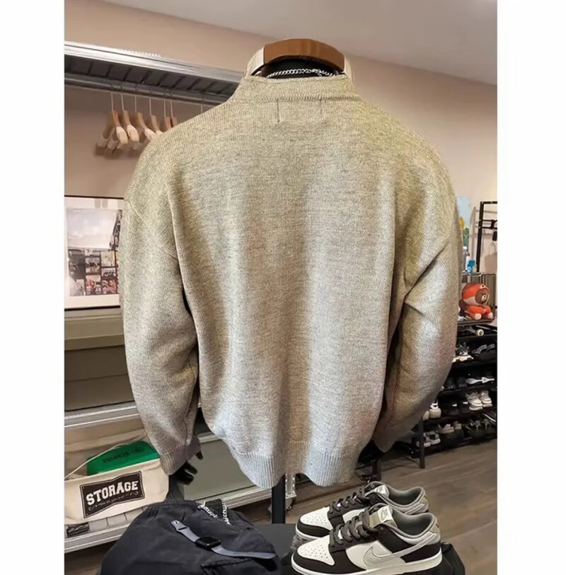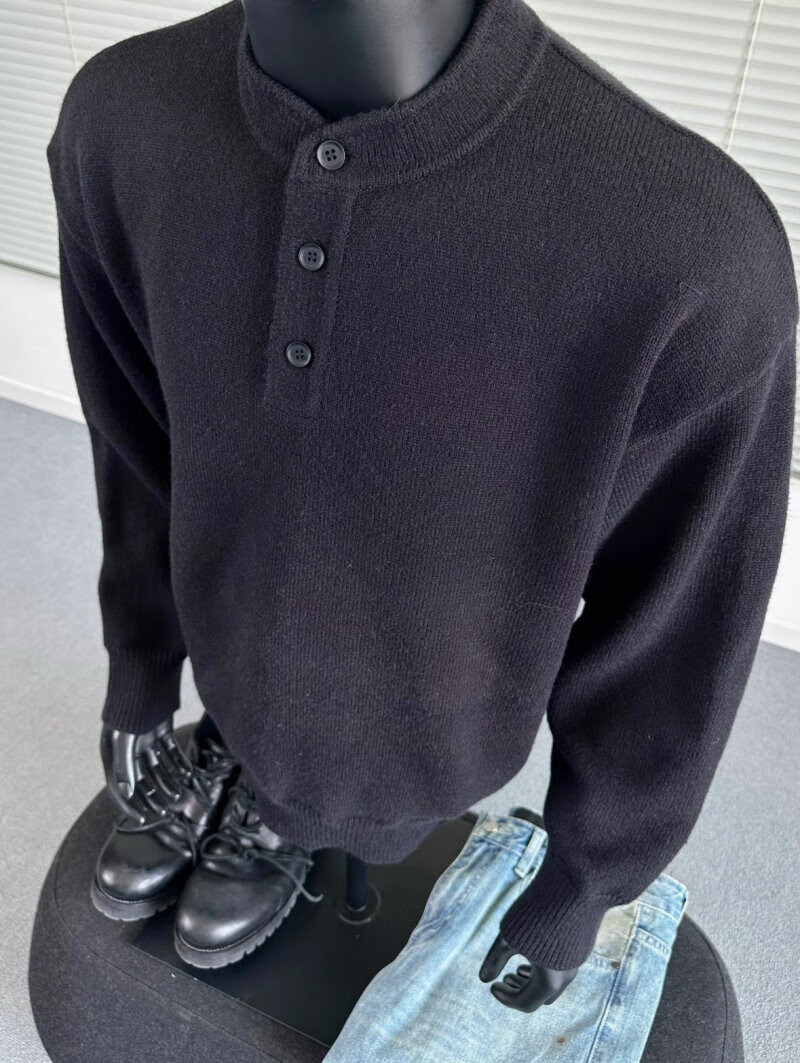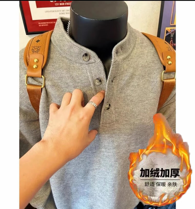 Fearlessly move forward cleanfit gray henley collar sweater for men in autumn and winter American lazy style sweater with velvet and thick inner base Gray S