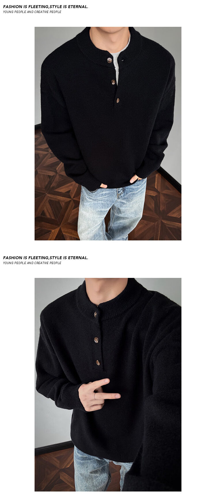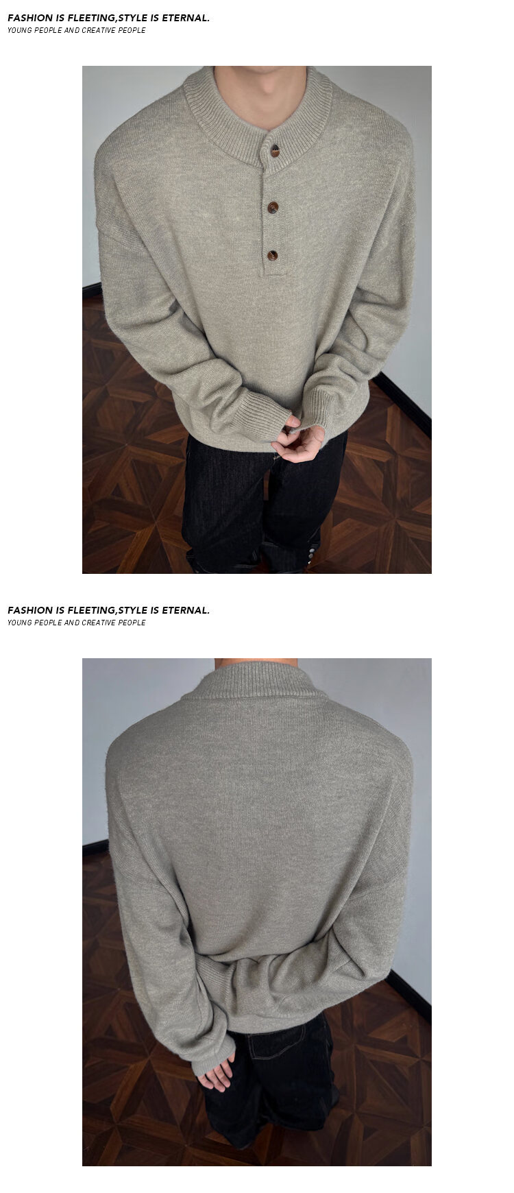 AKRJOKDKN American retro Henry collar button-up sweater for men in winter, high-end sweater, loose casual bottoming top, floral gray, high quality XL