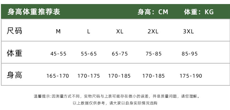 China (cm) 165 / 88-90 170 / 96-98 175 / 108-110 180 / 118-122 185 / 126-130