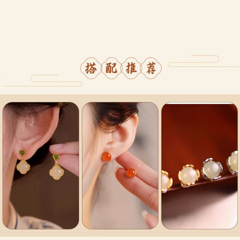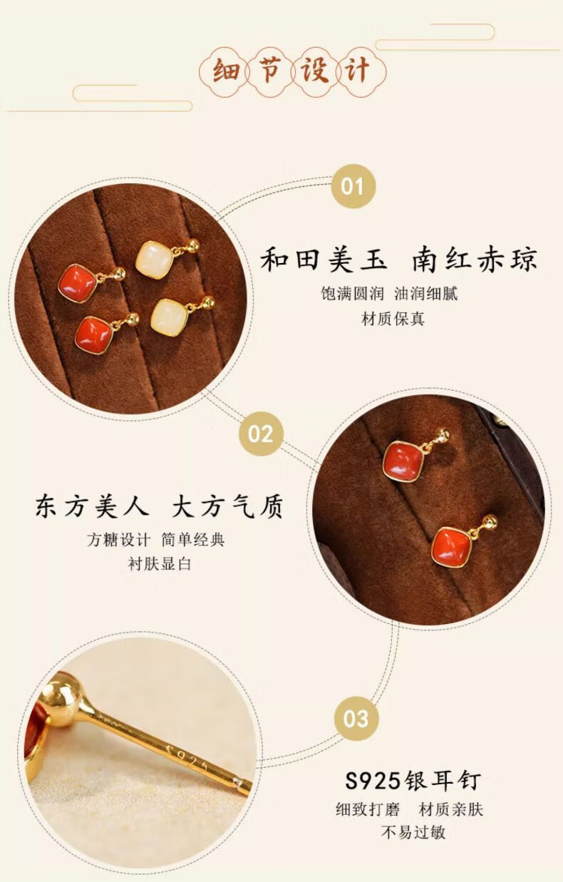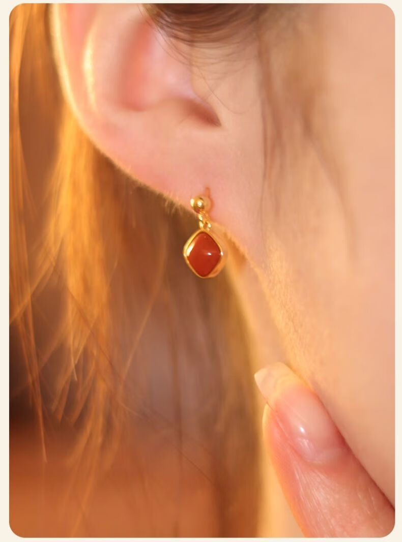 Shengxima Nanhong earrings for women, small sugar cubes, light luxury, niche, high-end, wealth and fortune earrings, sterling silver, metaphysics, ice red agate earrings, 925 silver + Nanhong agate, 1 pair