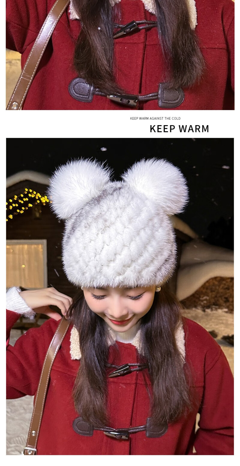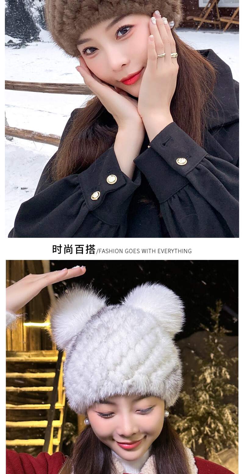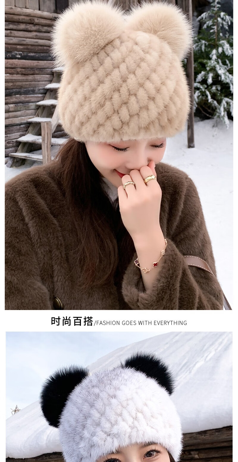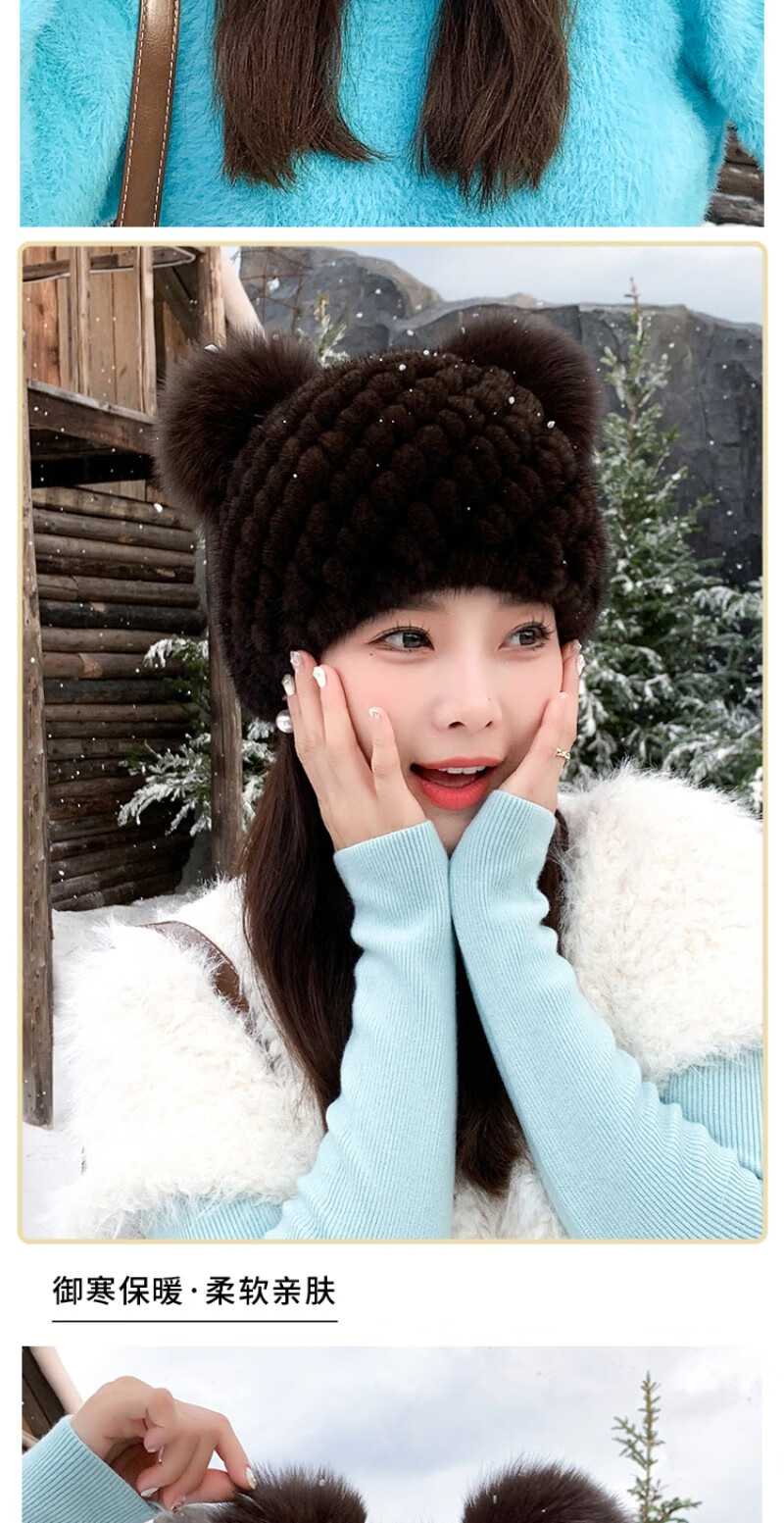 Princess mink fur braided cute ear protection hat for women winter warm casual parent-child fox fur ball real fur straw hat black one size fits all and elastic