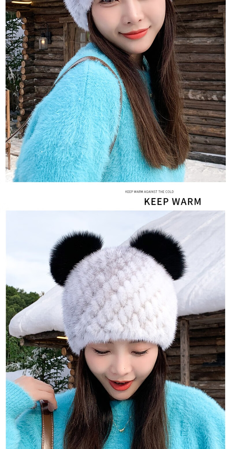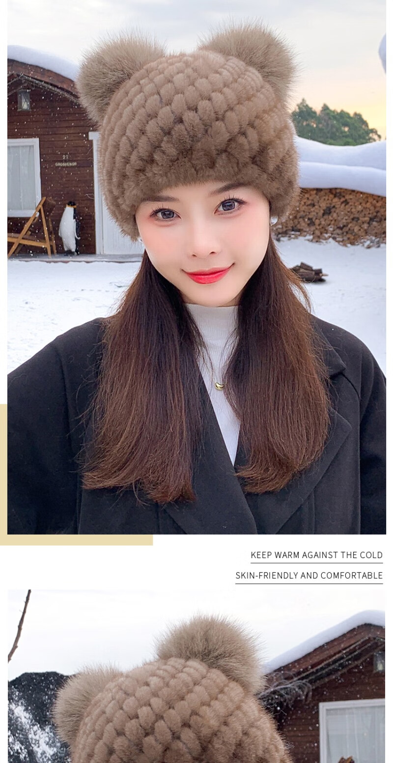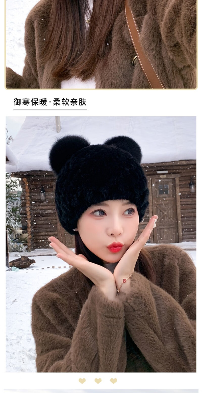 Princess mink fur braided cute ear protection hat for women winter warm casual parent-child fox fur ball real fur straw hat black one size fits all and elastic