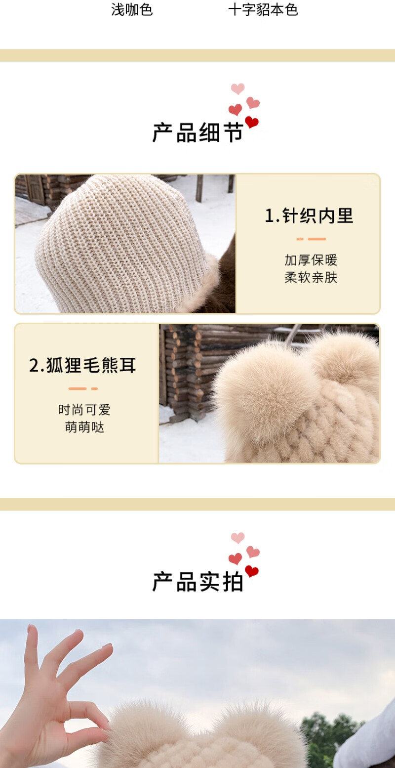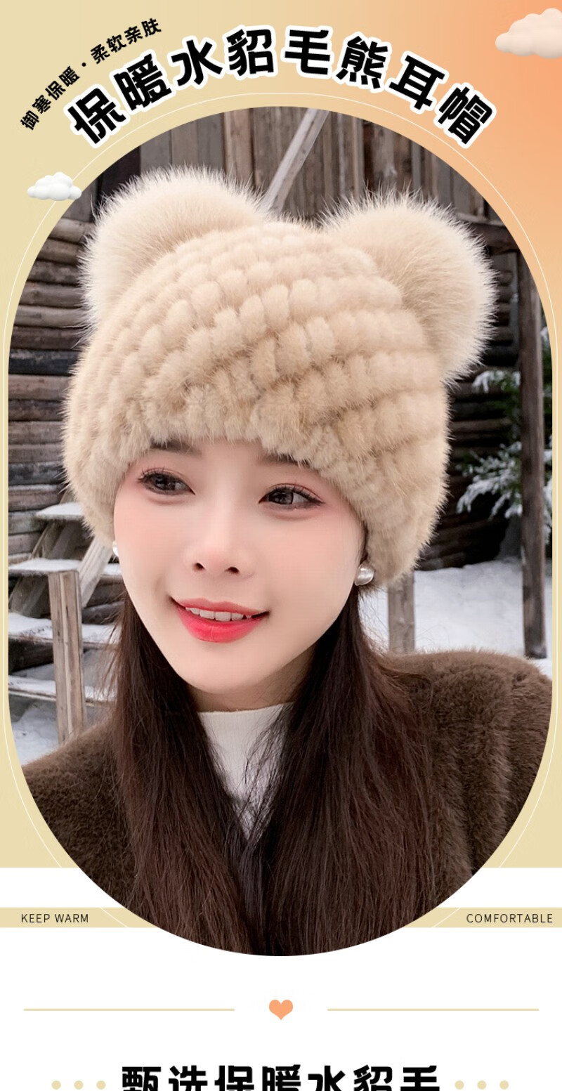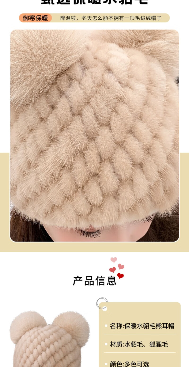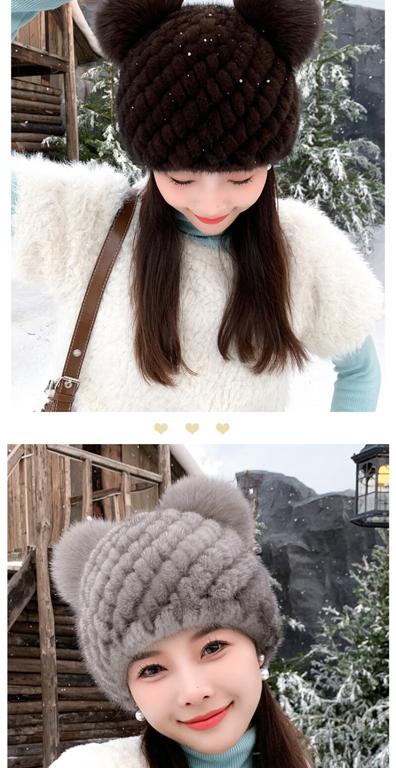 Princess mink fur braided cute ear protection hat for women winter warm casual parent-child fox fur ball real fur straw hat black one size fits all and elastic