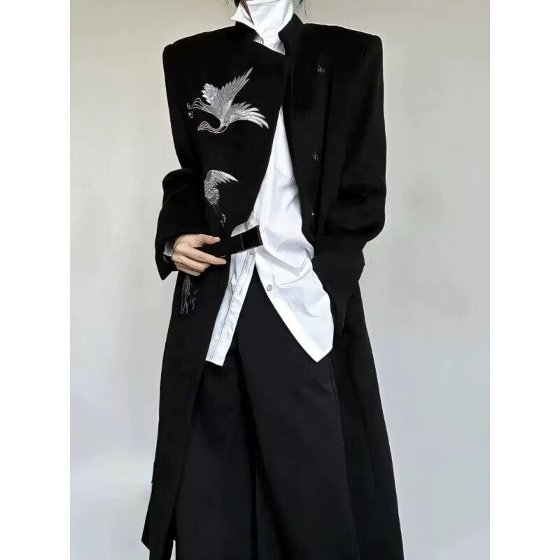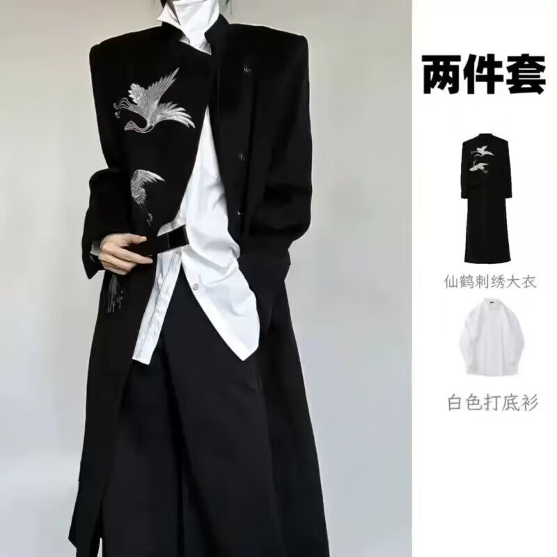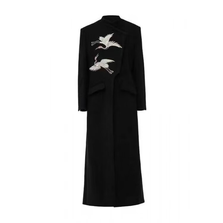 The new Chinese style men's crane embroidered woolen coat men's autumn and winter hidden button mid-length stand-up collar windbreaker jacket suit Crane embroidered jacket + white bottoming shirt + black trousers M recommended 90-105 Jin Jin equals 0.5 kg