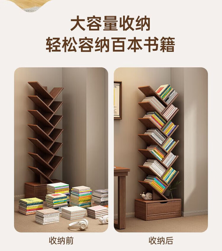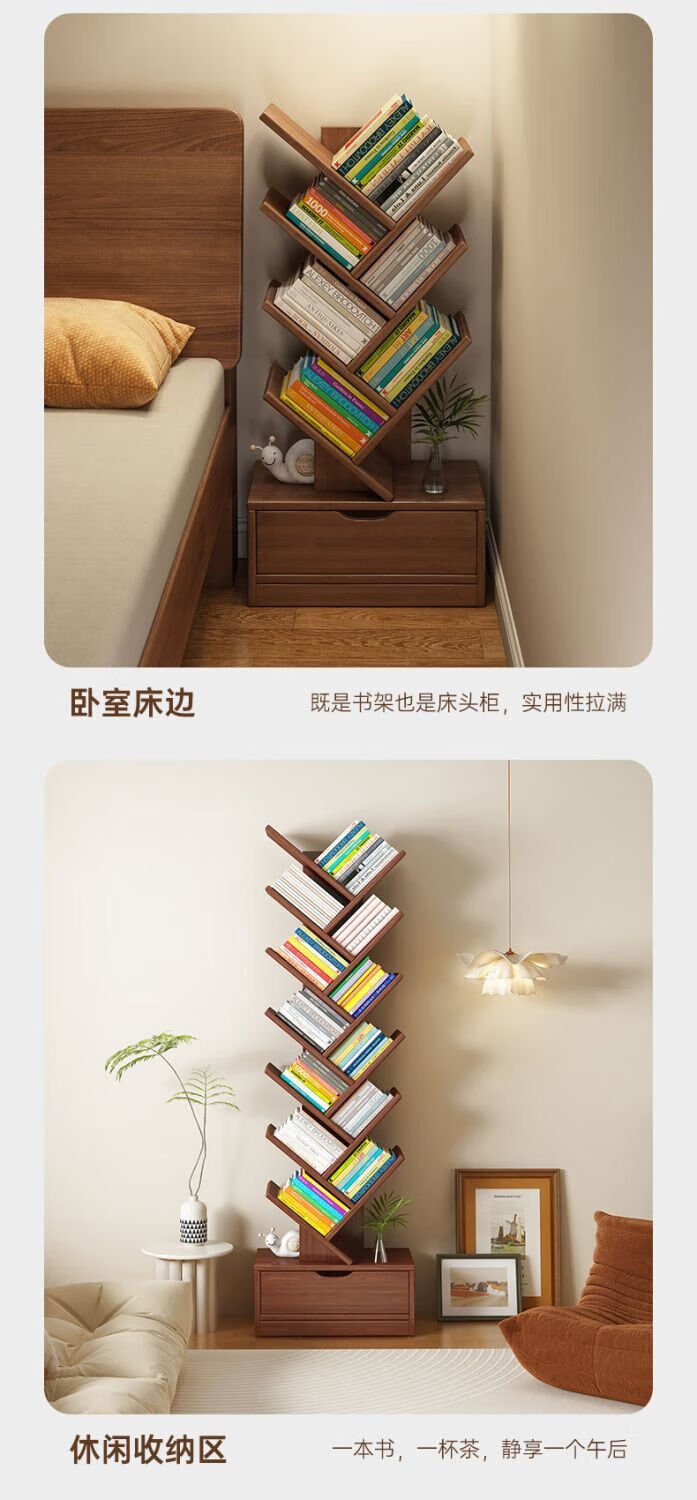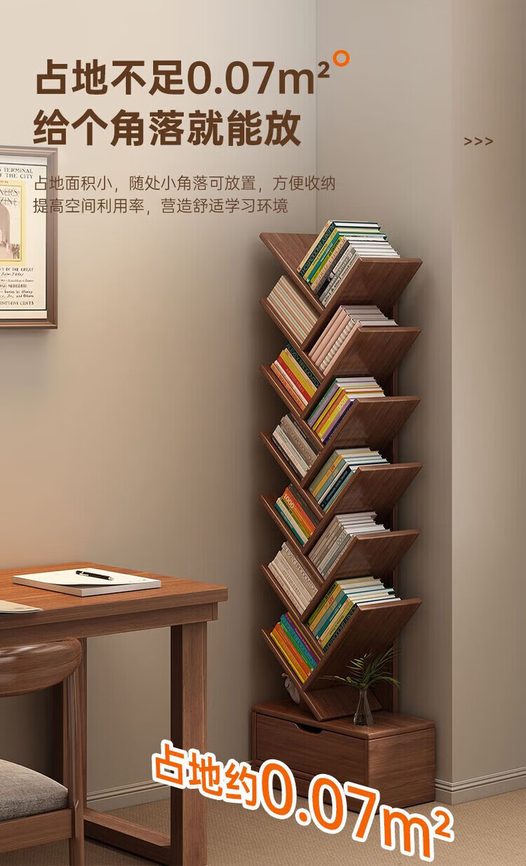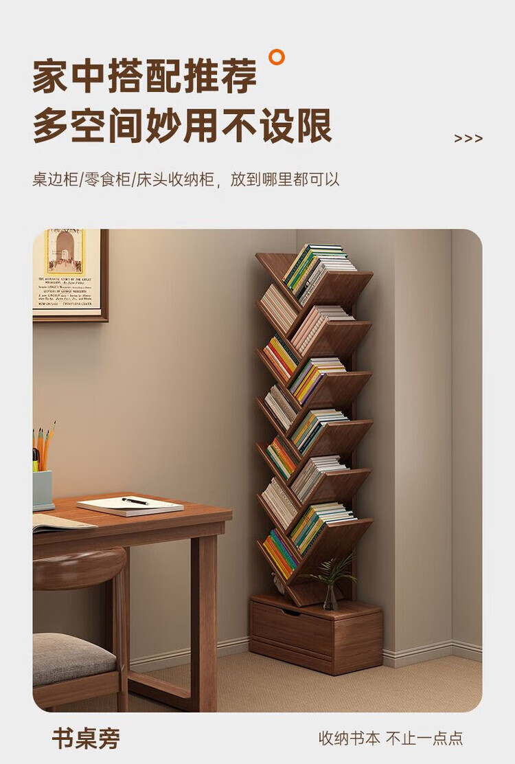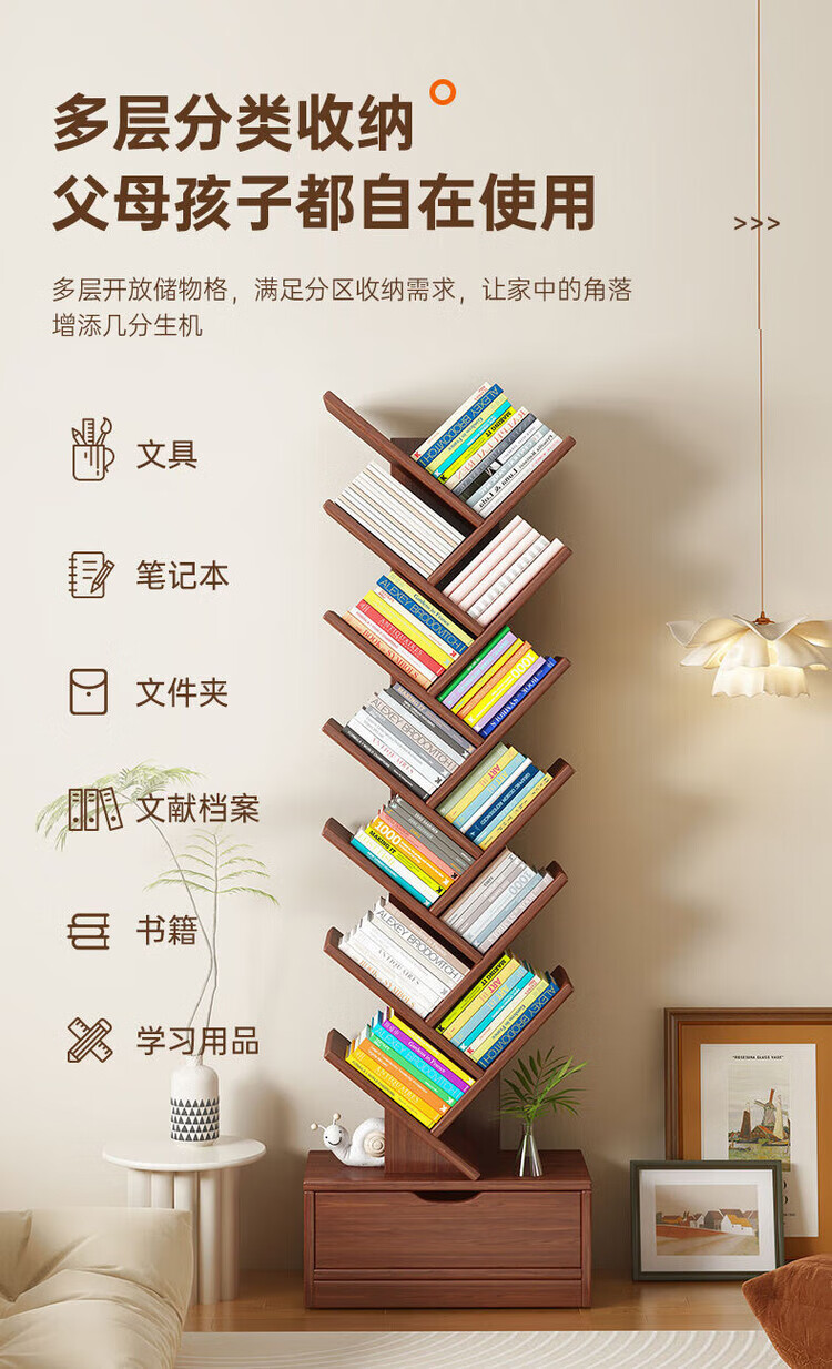 Solid wood bookshelf floor-standing wall storage shelf living room home simple creative tree-shaped student bedroom layered shelf main picture 8-layer pastoral oak color high 100cm