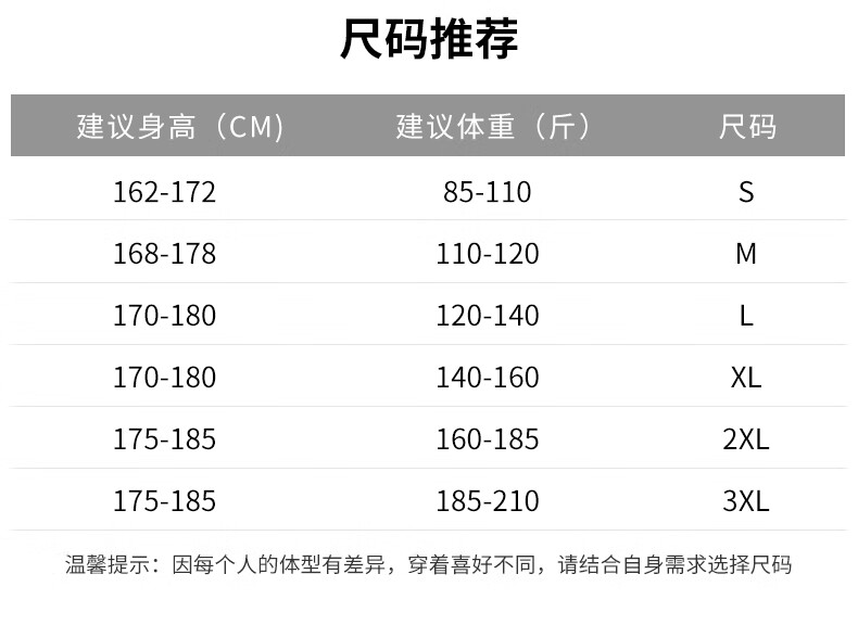 China (cm) 165 / 88-90 170 / 96-98 175 / 108-110 180 / 118-122 185 / 126-130