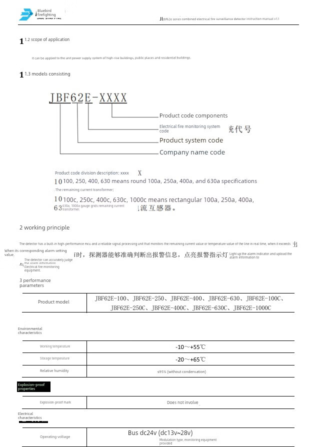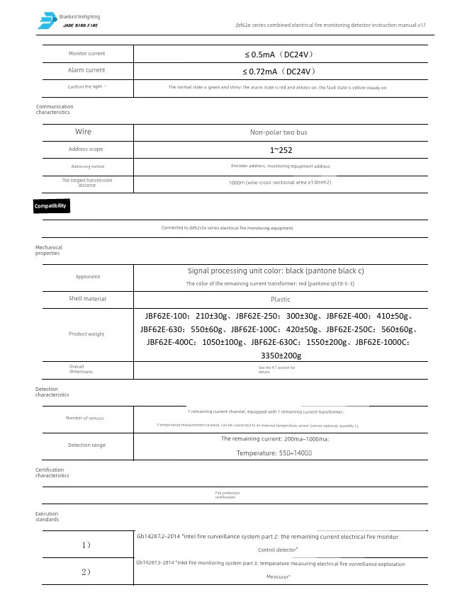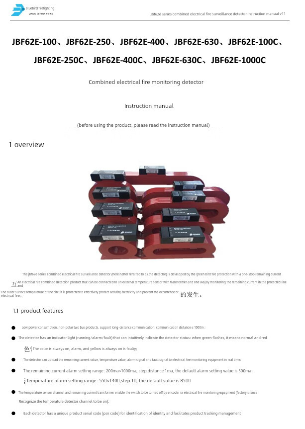 Jbf62E-100-250-400-630-1000C combined electrical fire monitoring detector JBF62E-1000C