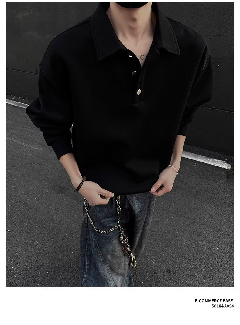 Cleanfit Henry collar sweatshirt men's spring and autumn American retro polo shirt handsome trendy loose long-sleeved inner wear black M