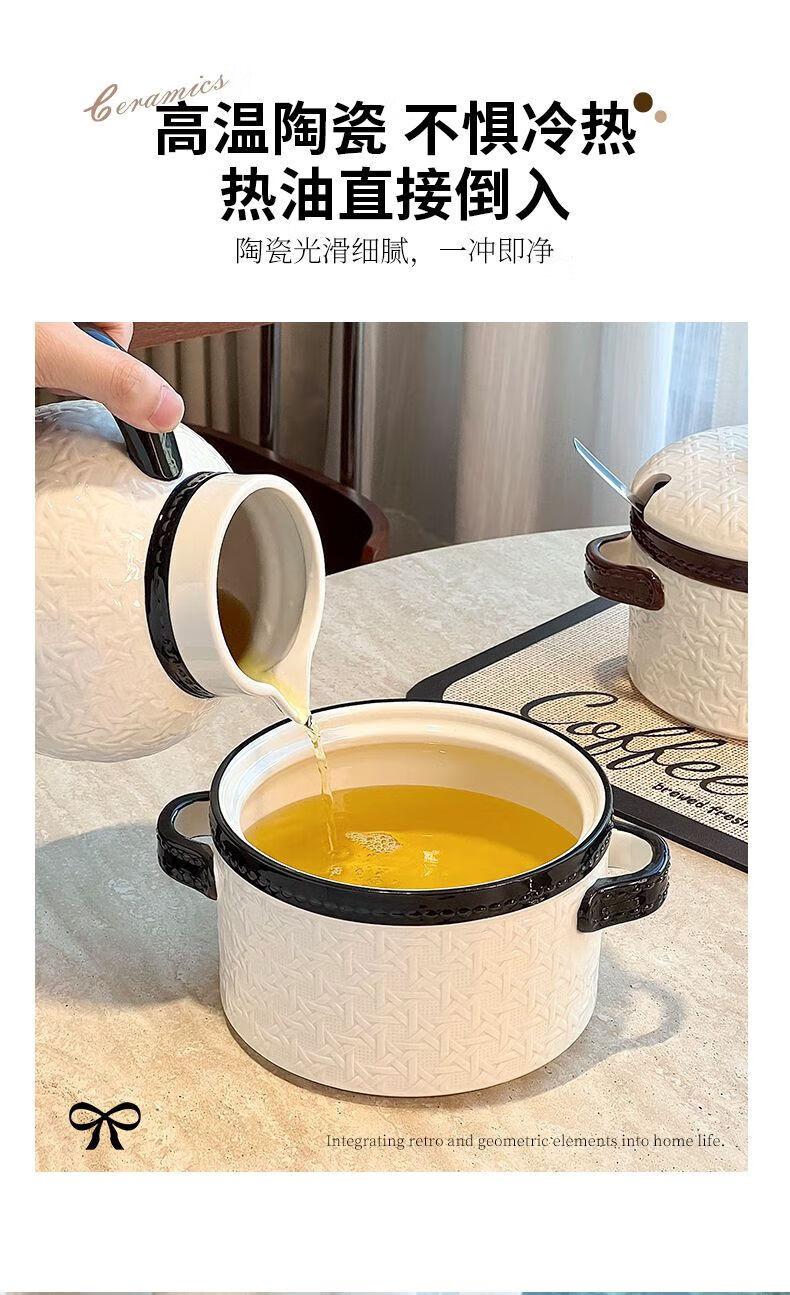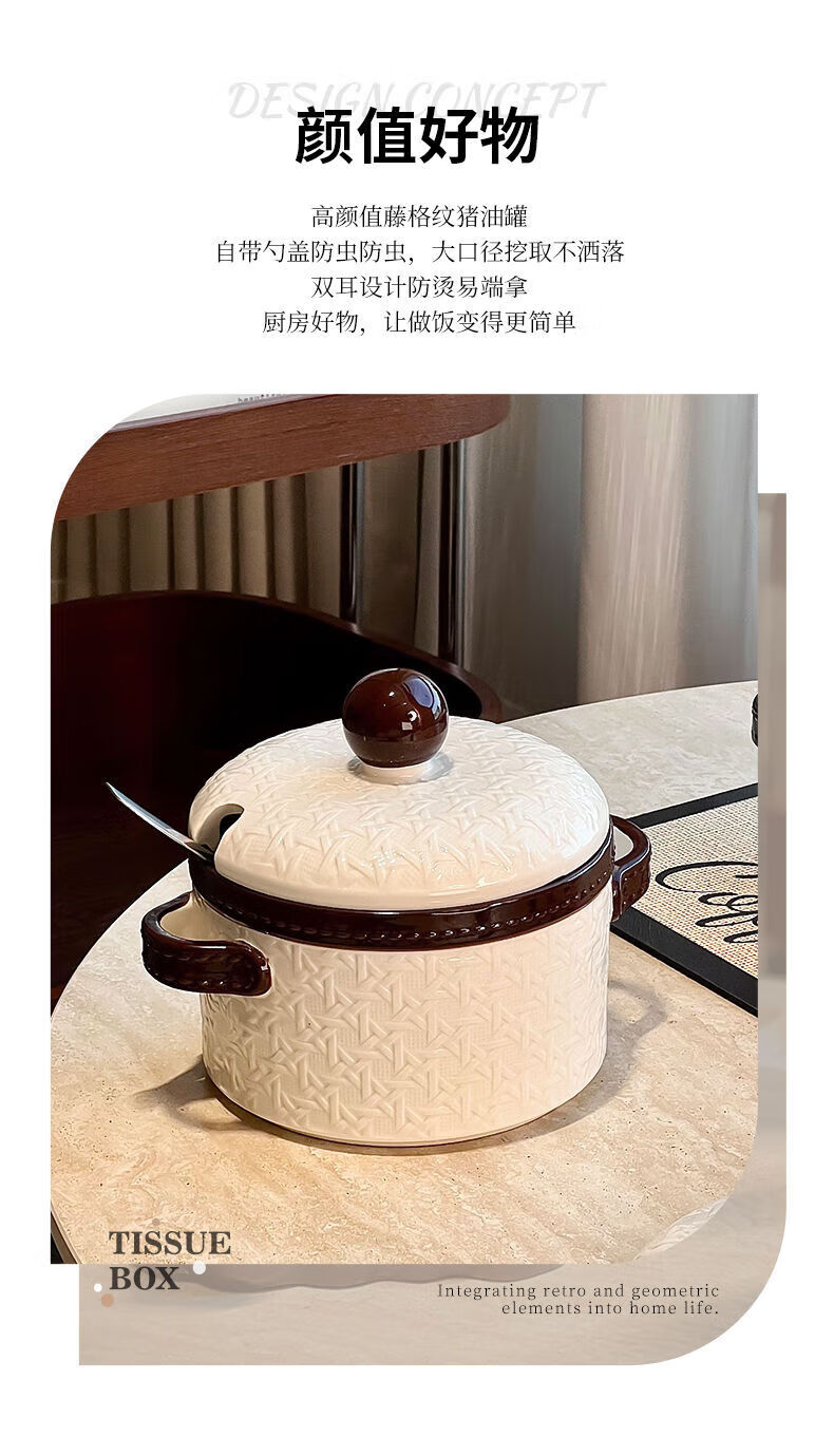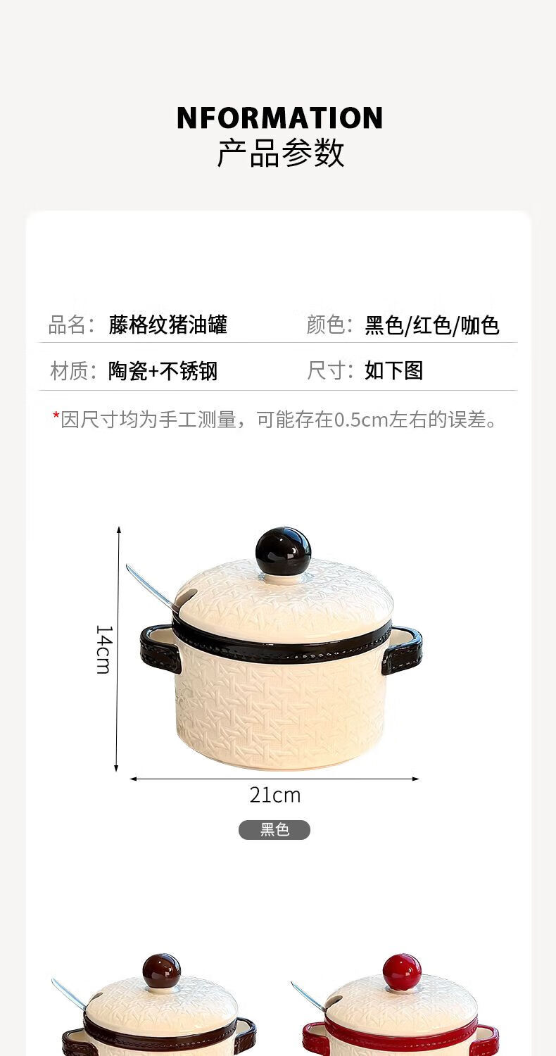 FANCYCHIC lard jar household kitchen ceramic high temperature resistant large capacity braided meat oil jar with lid braided lard jar 1.2L black with spoon no Specifications