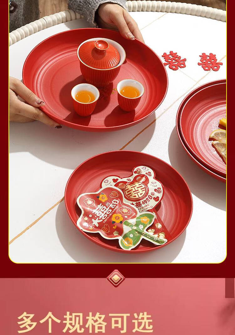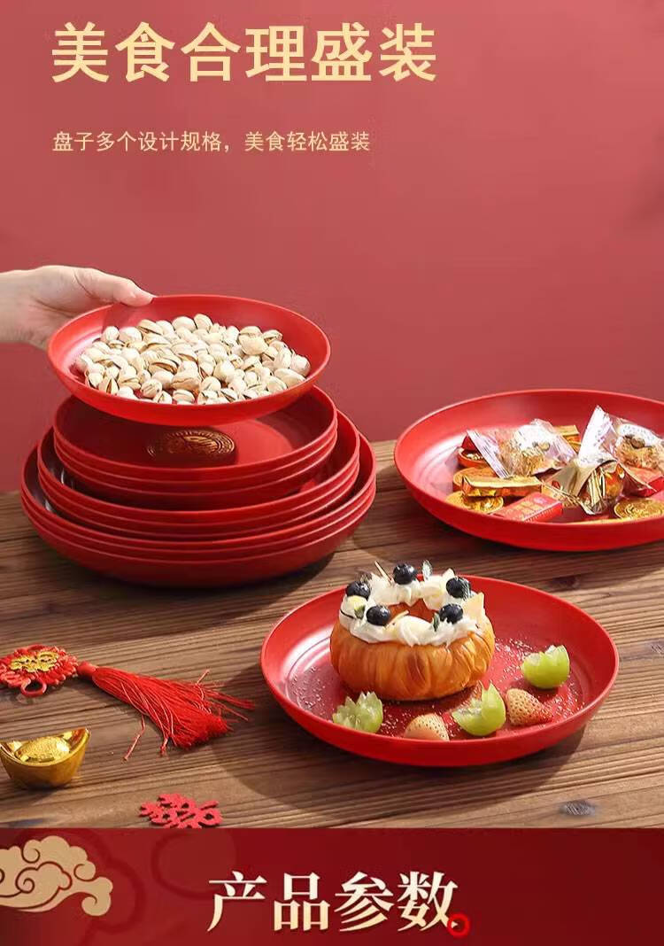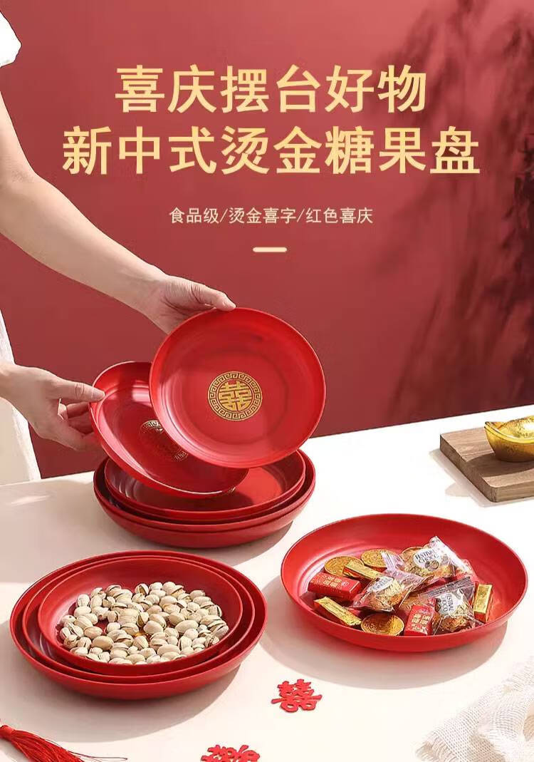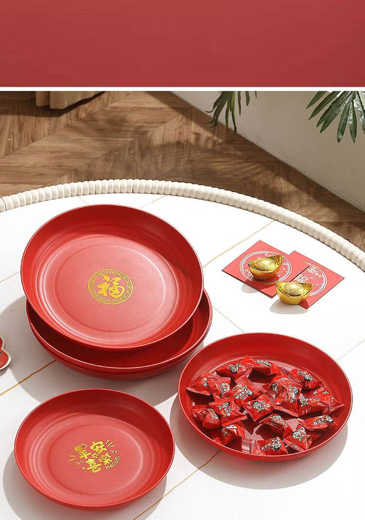 Fantasy Wedding Housewarming Birthday Banquet Disposable Plates Plastic Thickened Red Environmentally Friendly Festive Dried Fruit Candy Dinner Plate Happy Word Disposable Plate 20cm 8 Pack