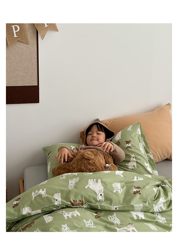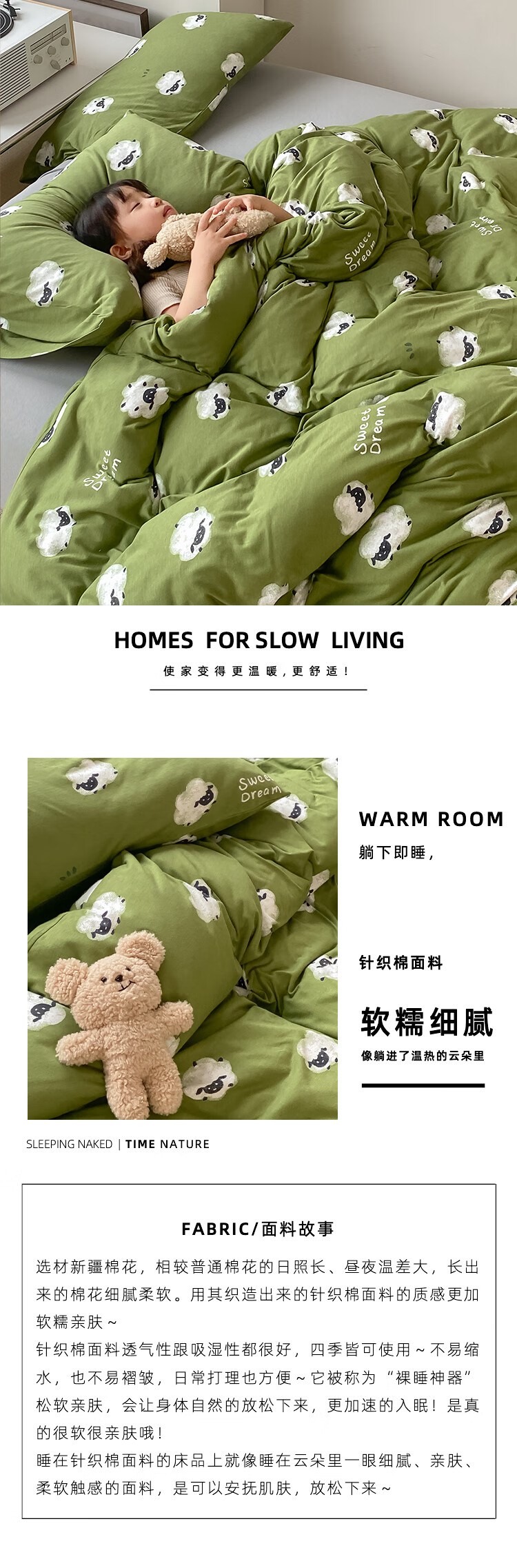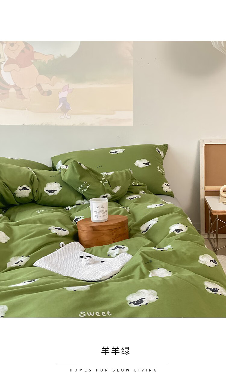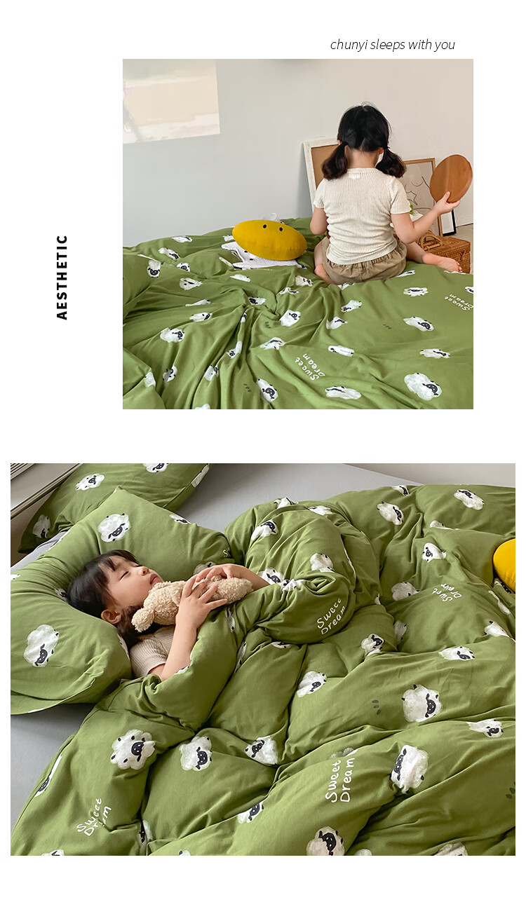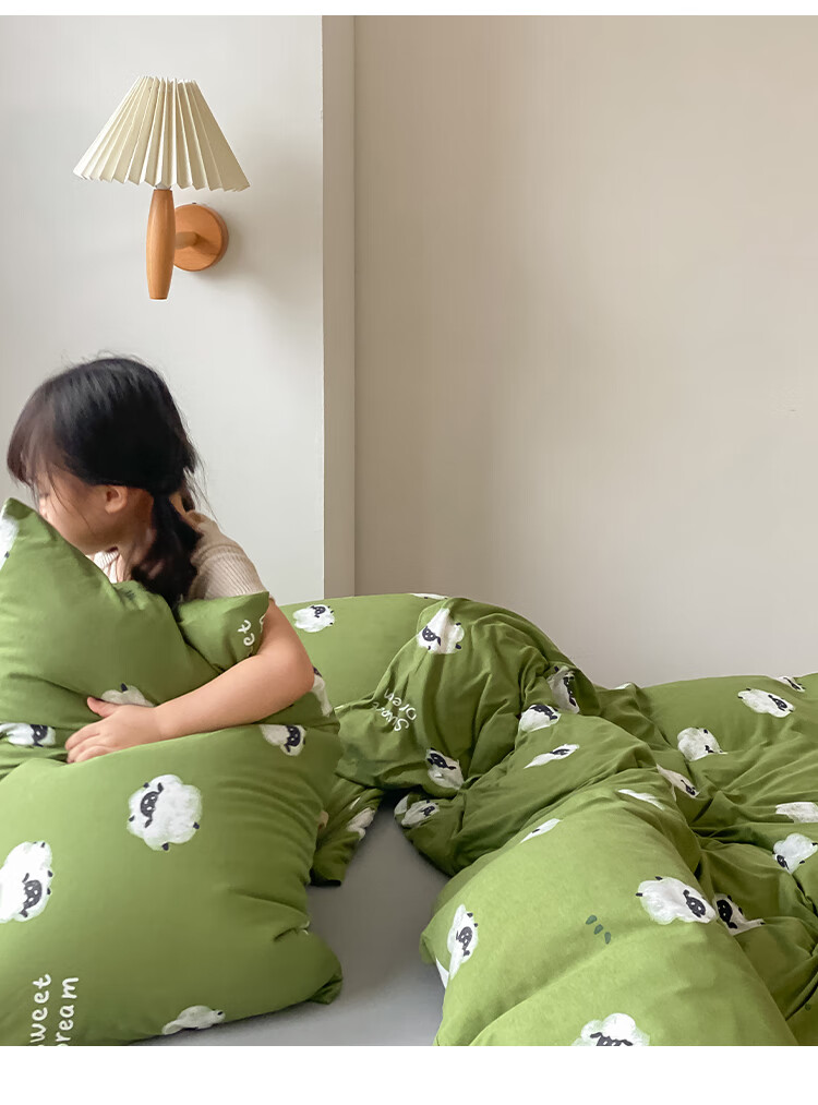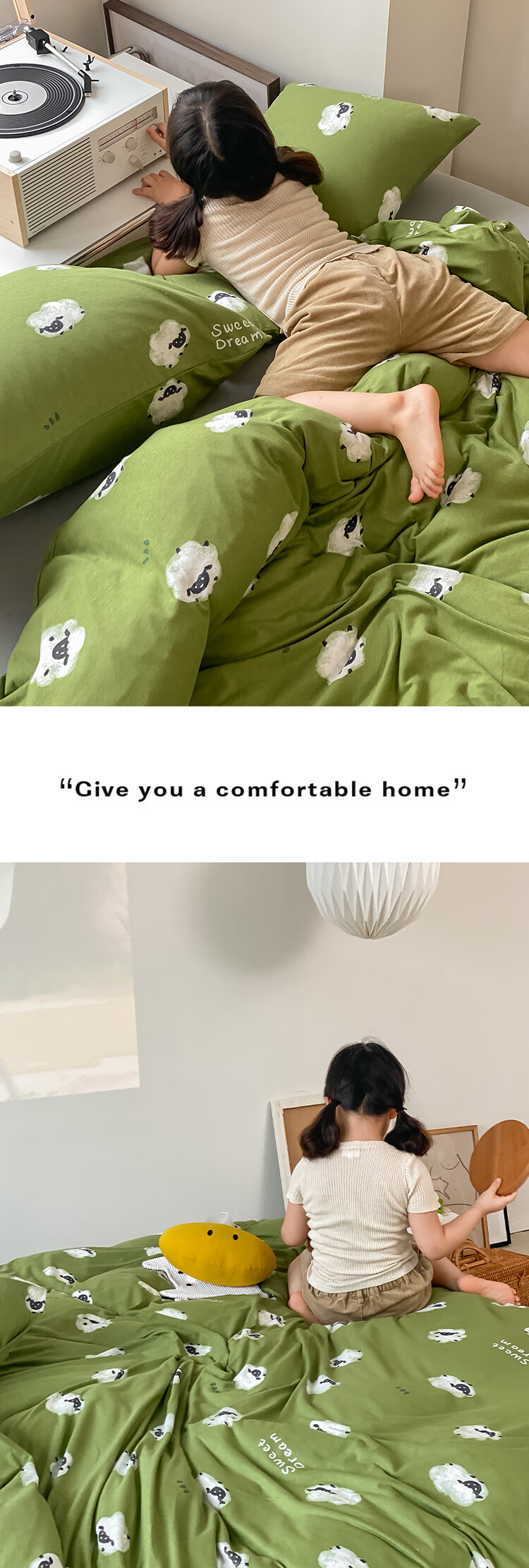Perfect in Everything (IT S A 10) Class A Cartoon Baby Grade Tianzhu Cotton Four-piece Set for Naked Sleeping Knitted 100 Pure Cotton Children's Lamb Quilt Cover Sheet Bedding Sheep-Green Sheet Style Piece_1.2m Bed_Suitable for 150*200cm Quilt Core