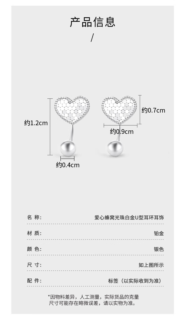 Wanfulong pt950 platinum love honeycomb light pearl platinum U-shaped earrings 2025 new hot style high-end gift for girlfriend Platinum pt950 love light pearl earrings 3.4g